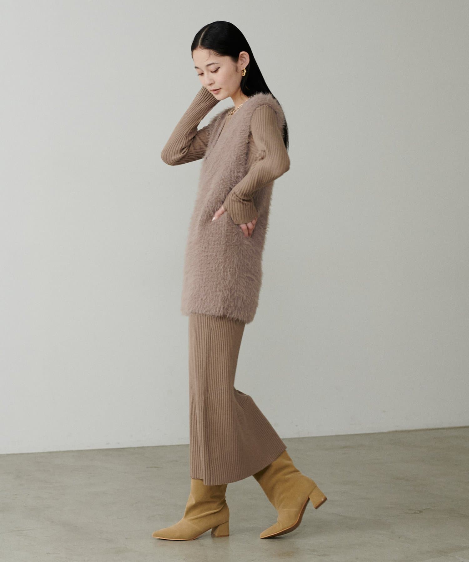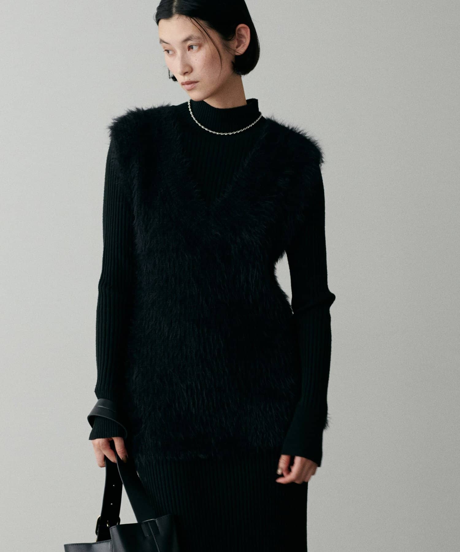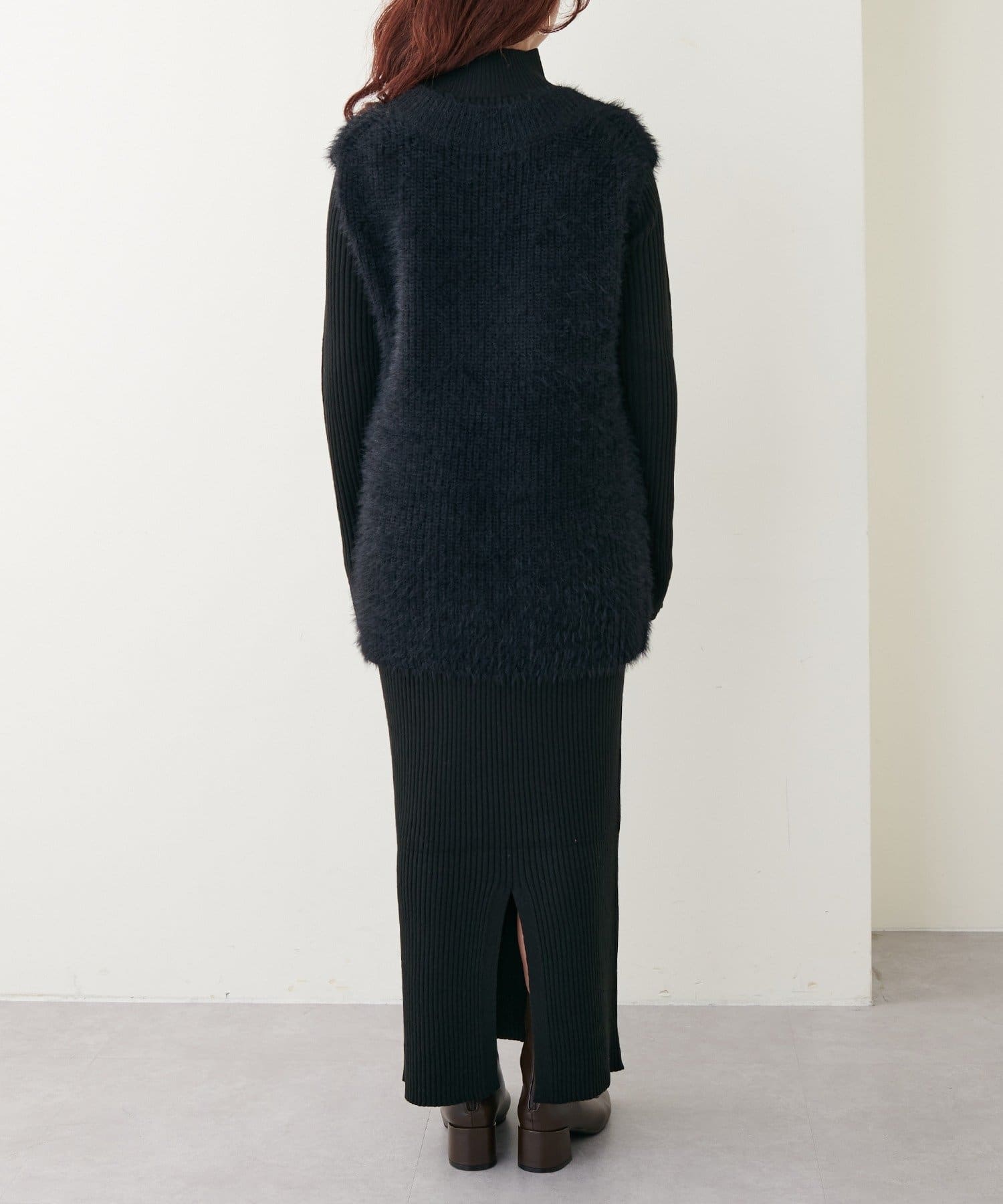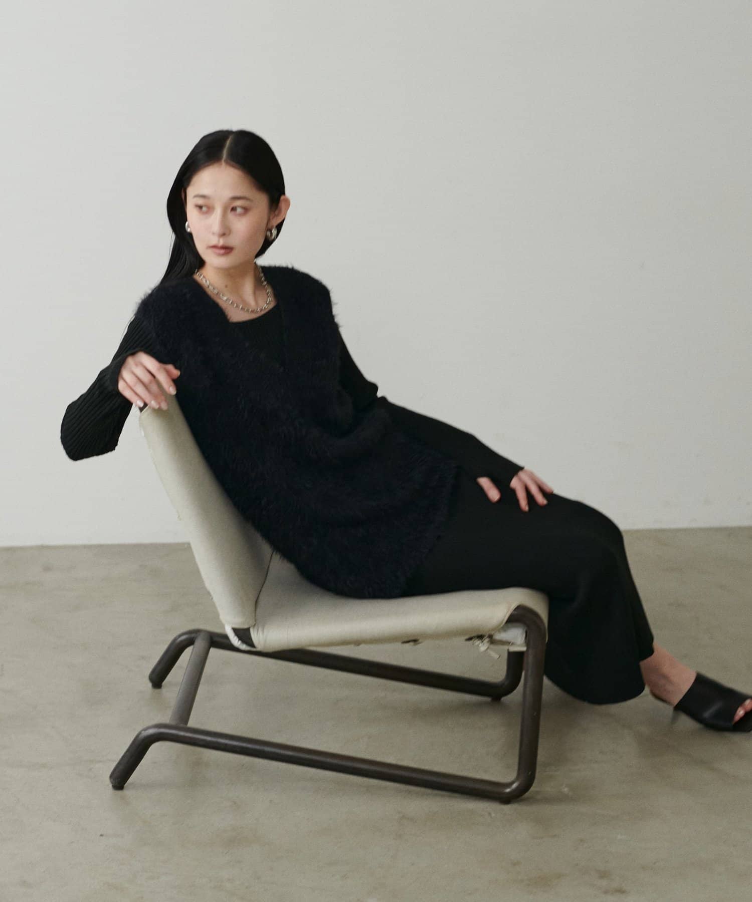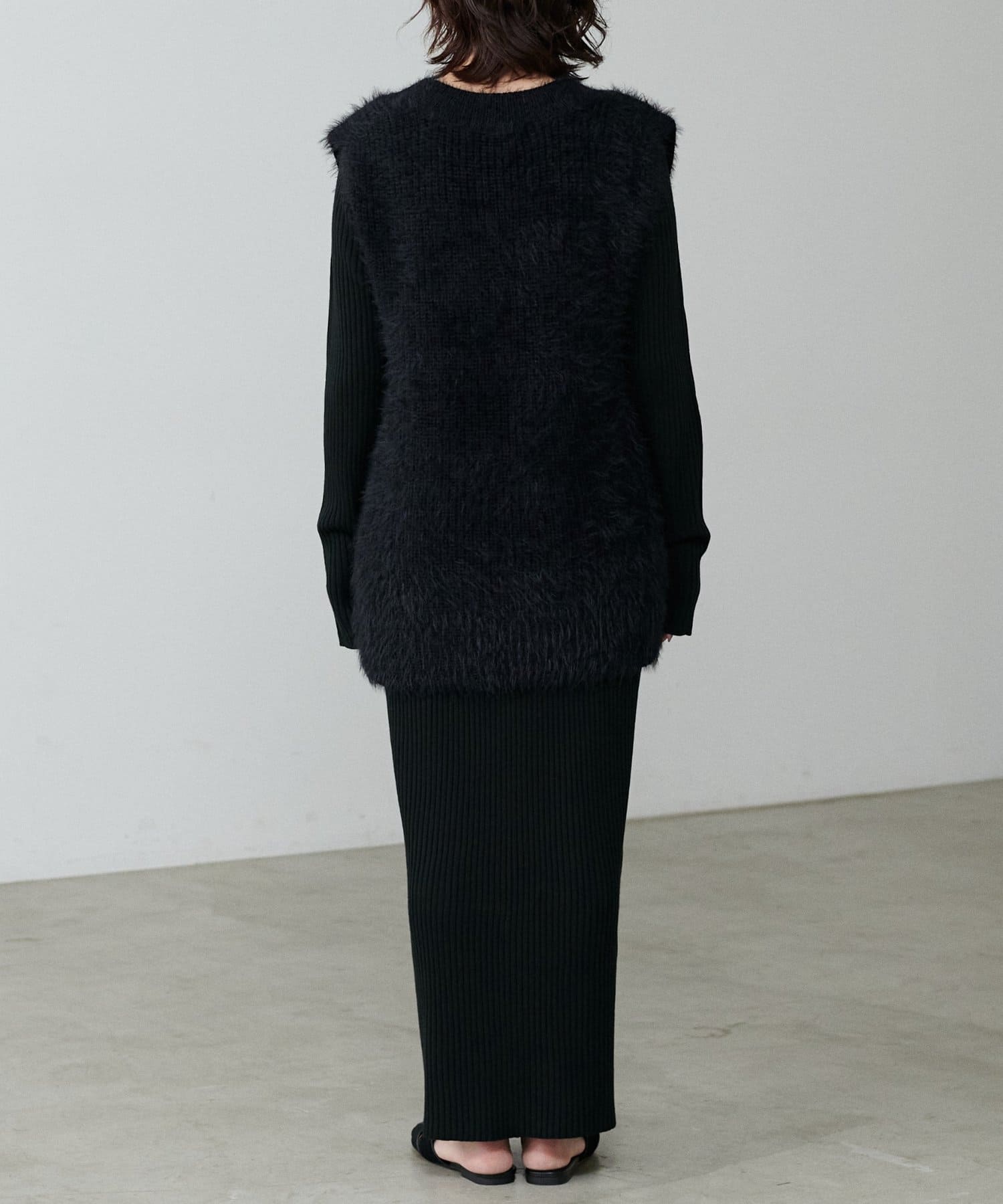 シンプルなリブのニットワンピースに同色のフェザーベストがセットになったアイテム。