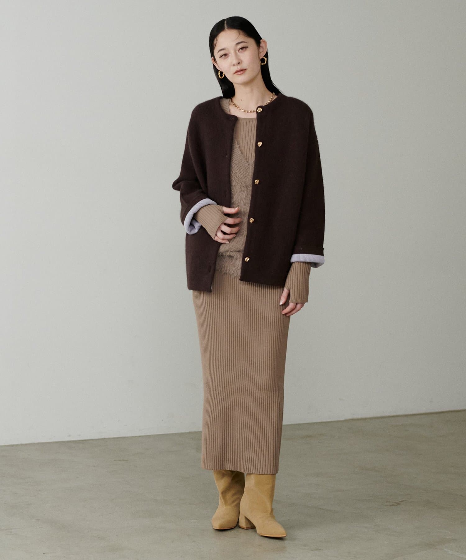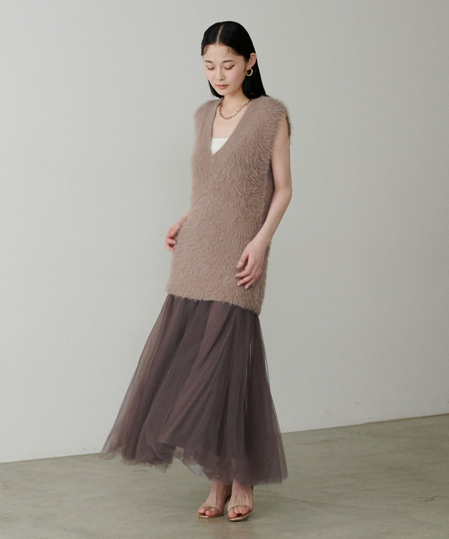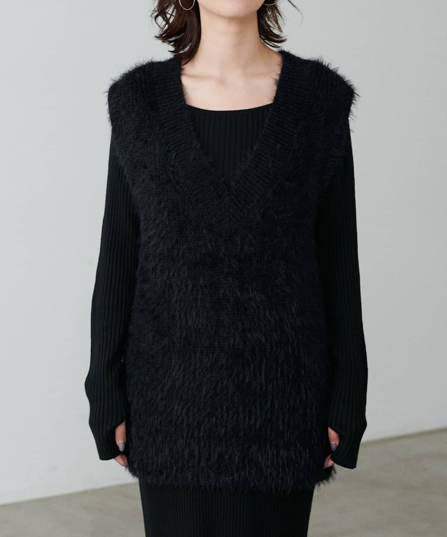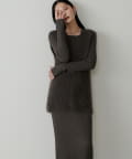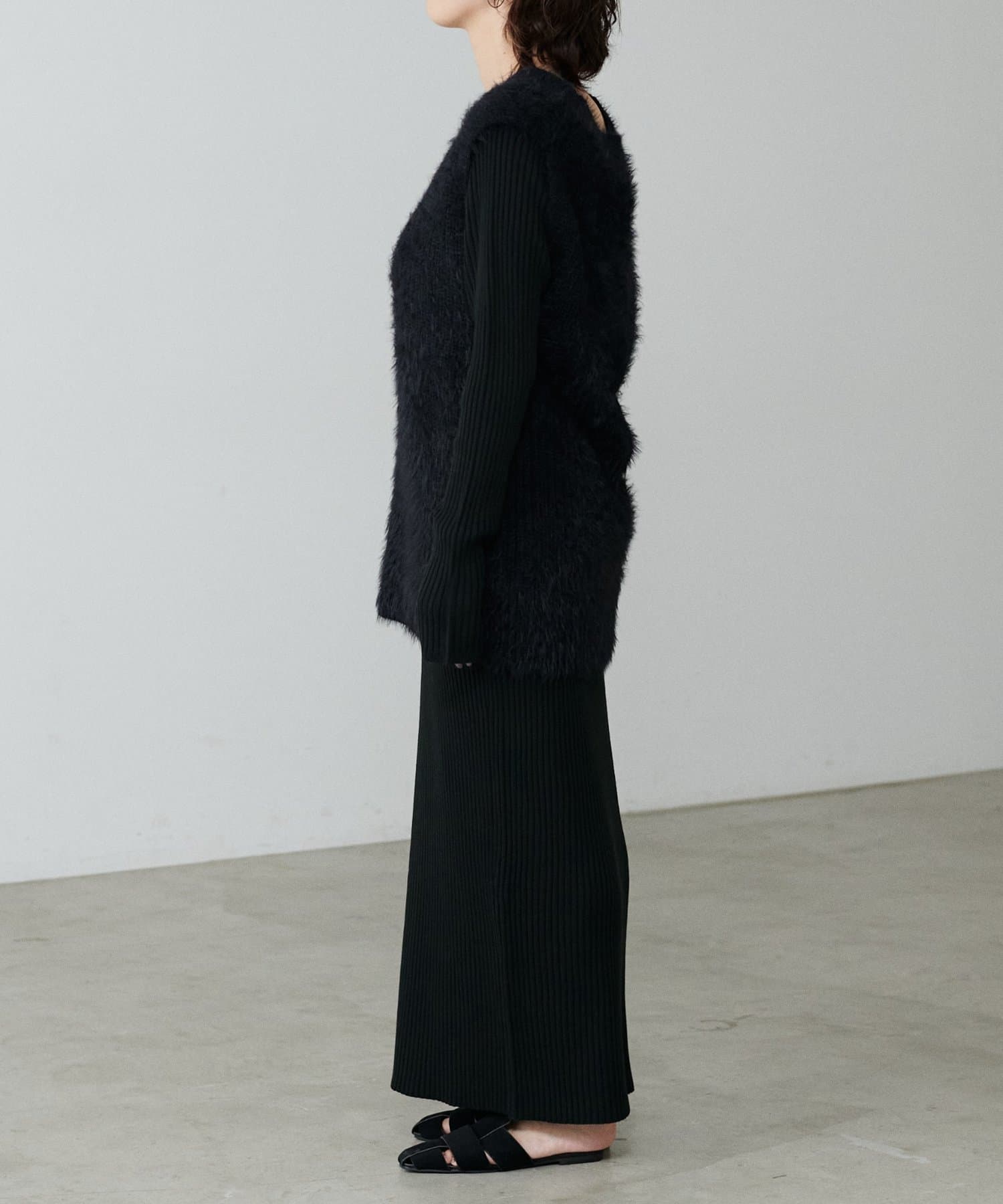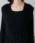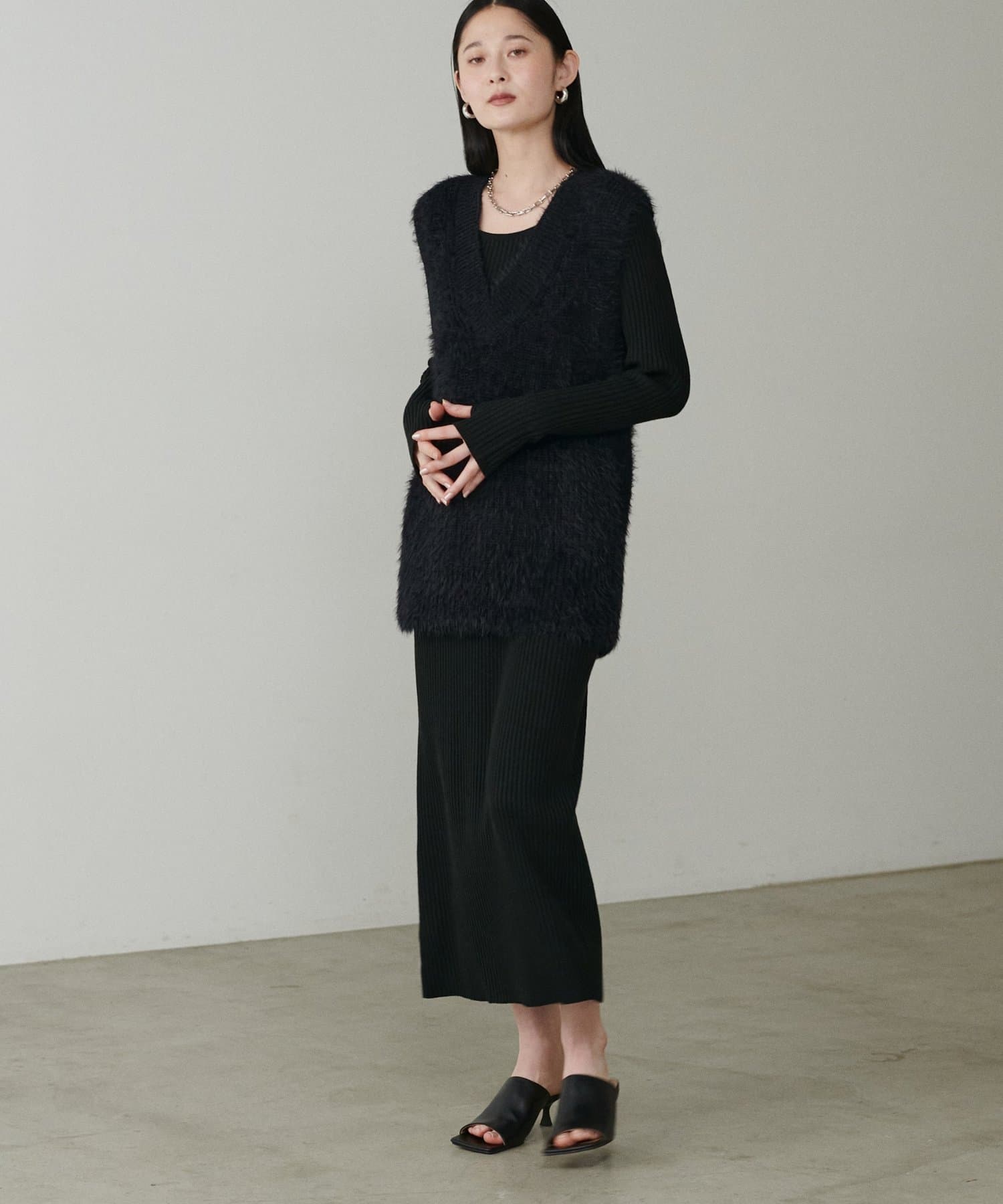 シンプルなリブのニットワンピースに同色のフェザーベストがセットになったアイテム。