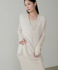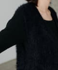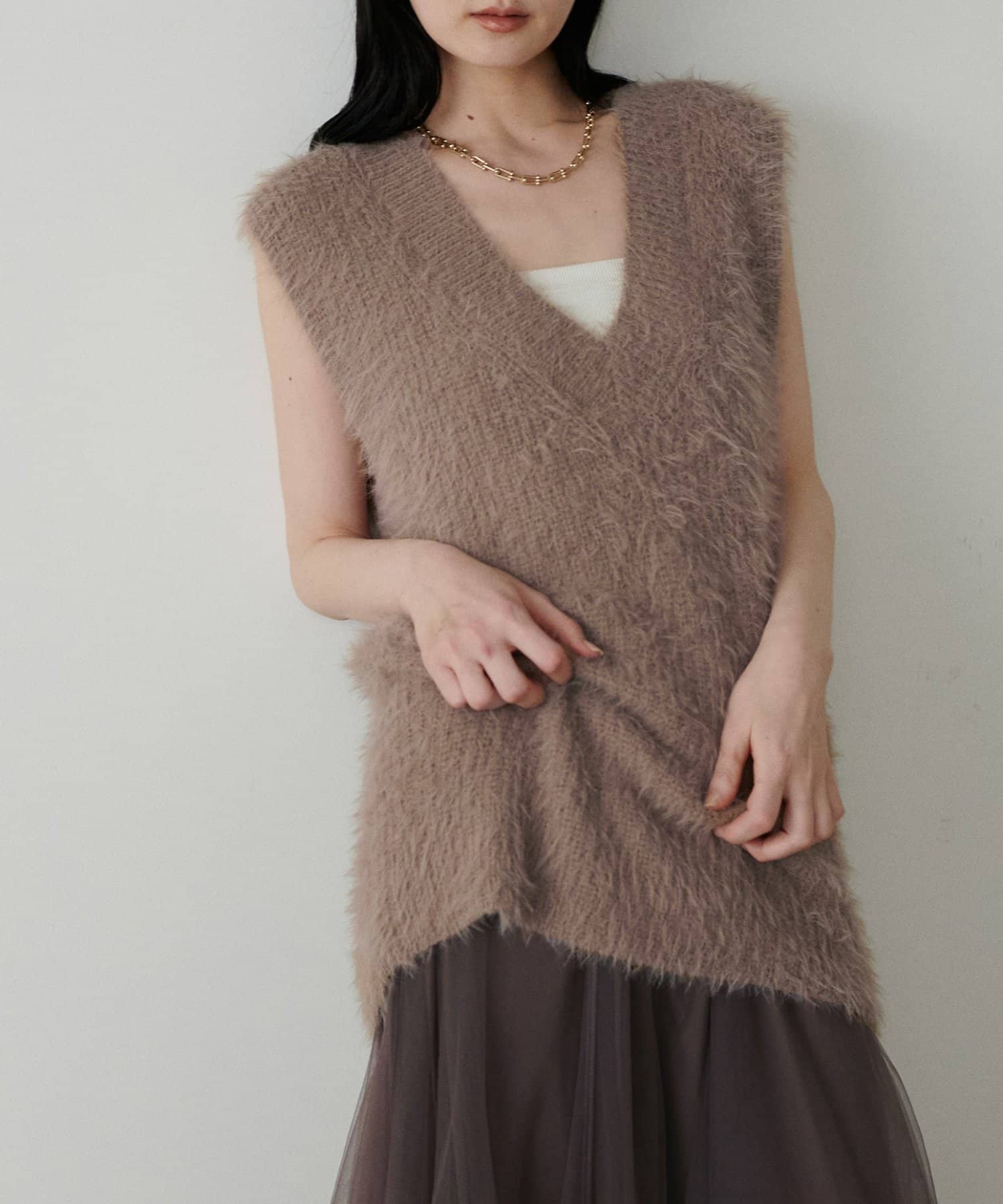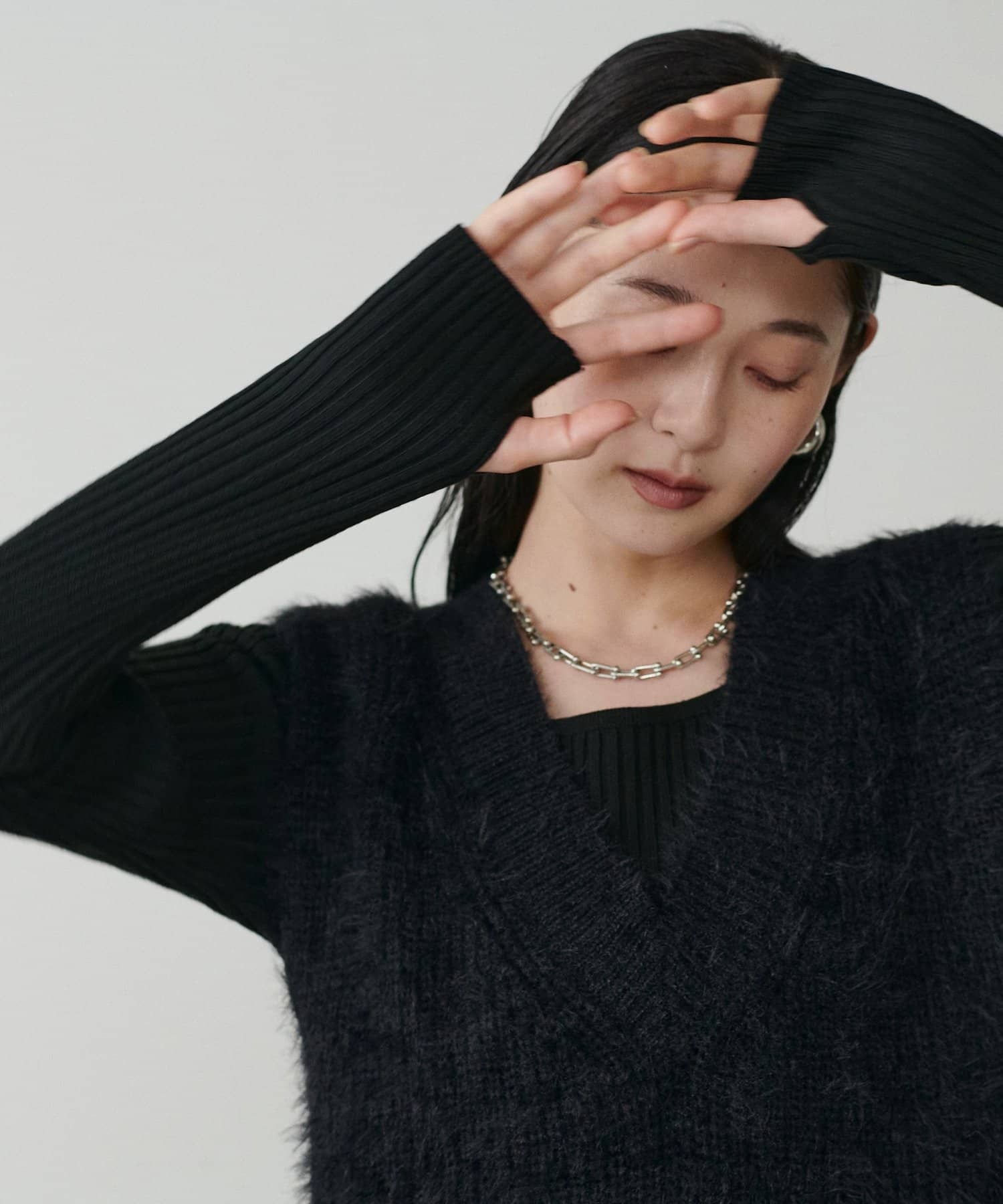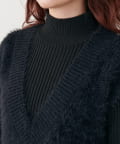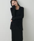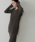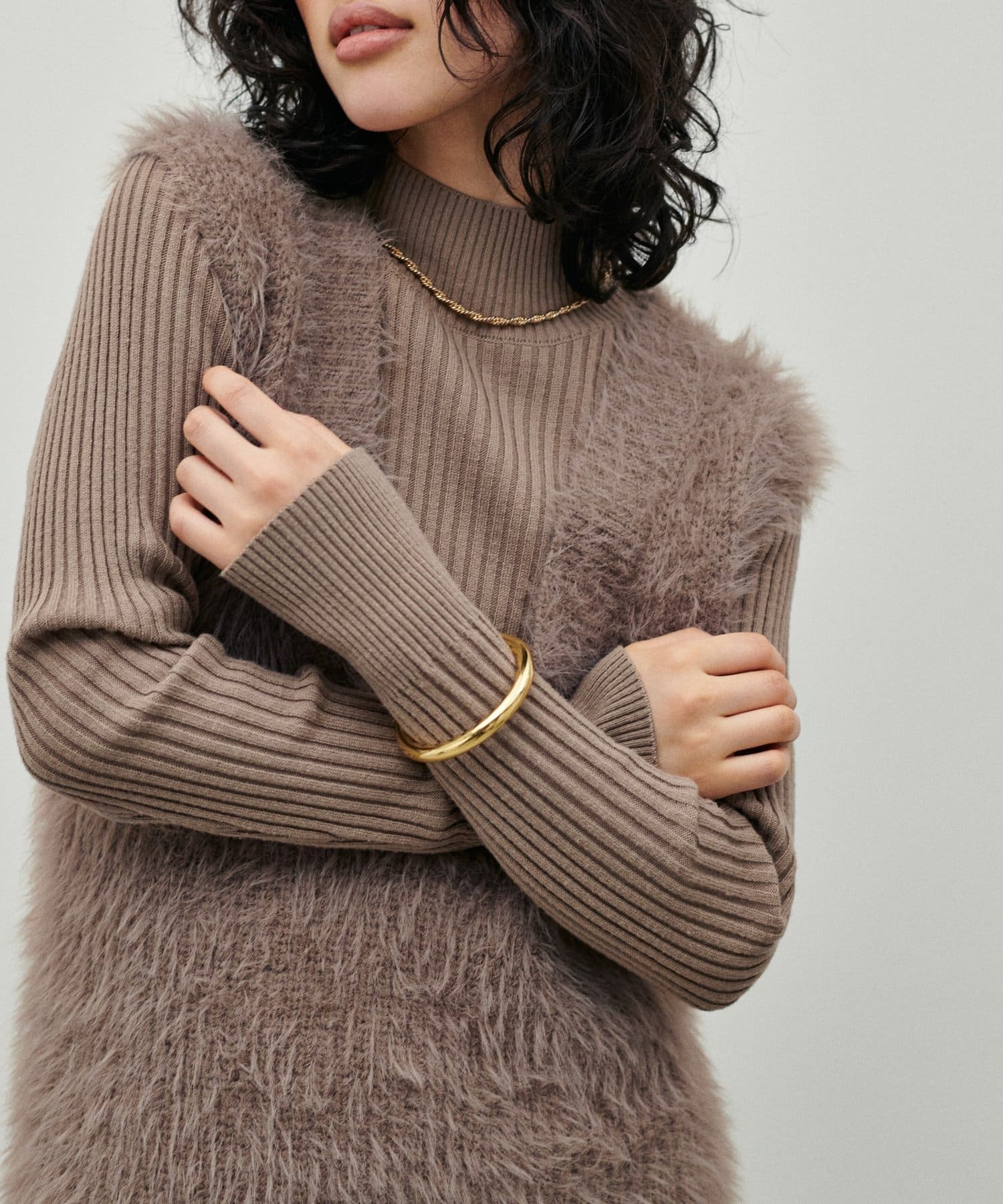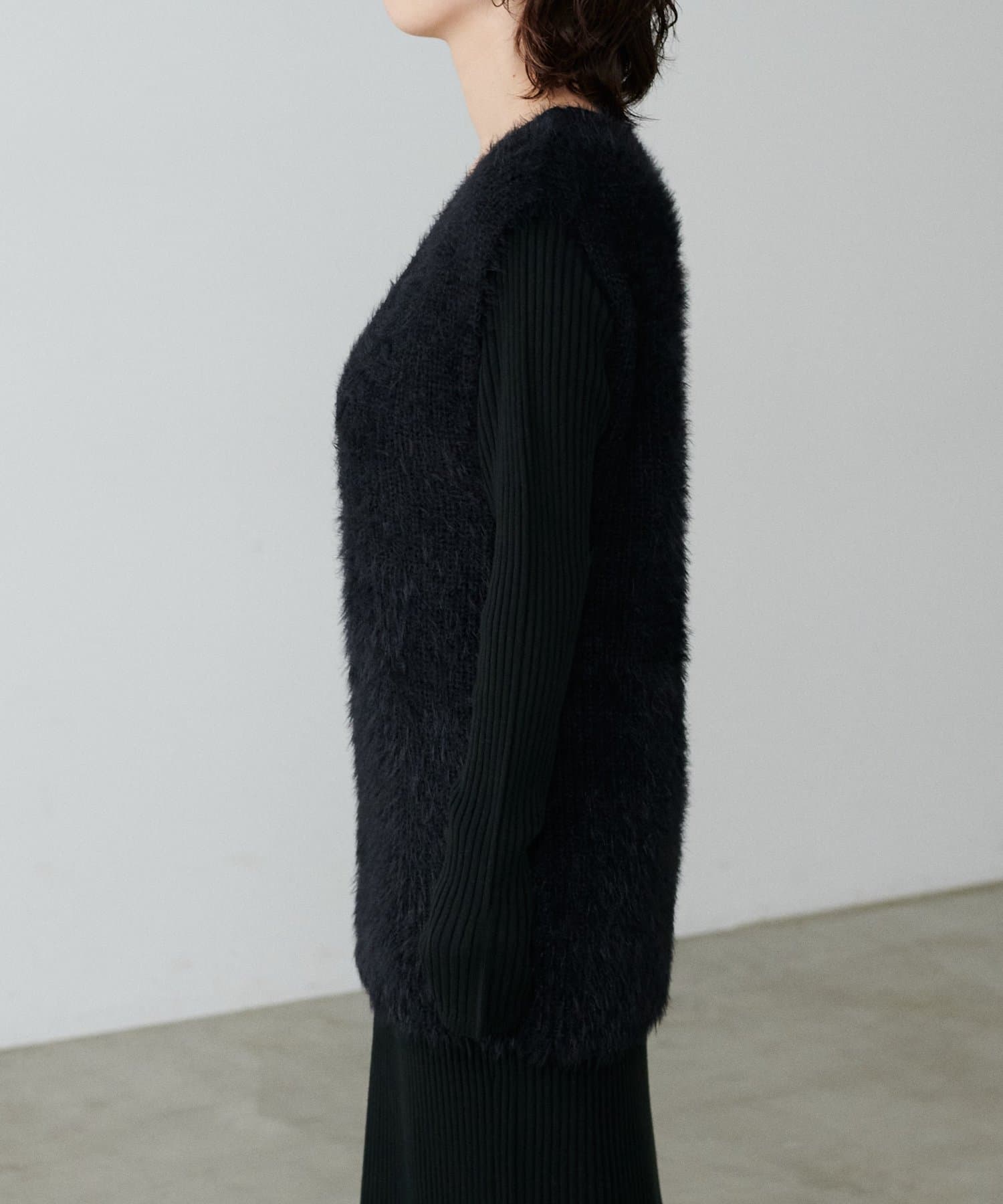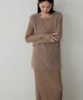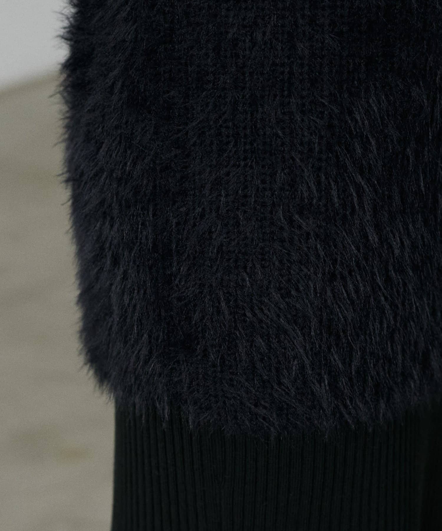 シンプルなリブのニットワンピースに同色のフェザーベストがセットになったアイテム。