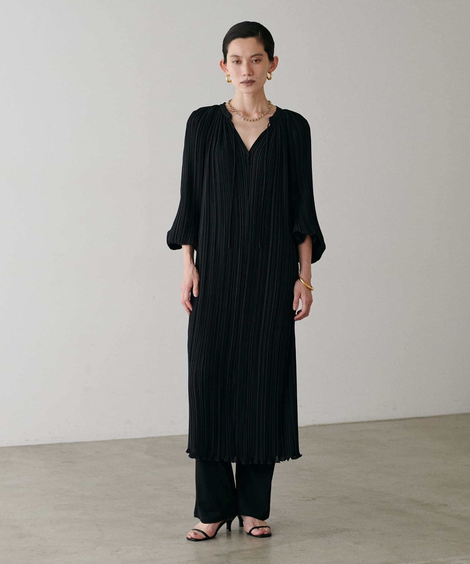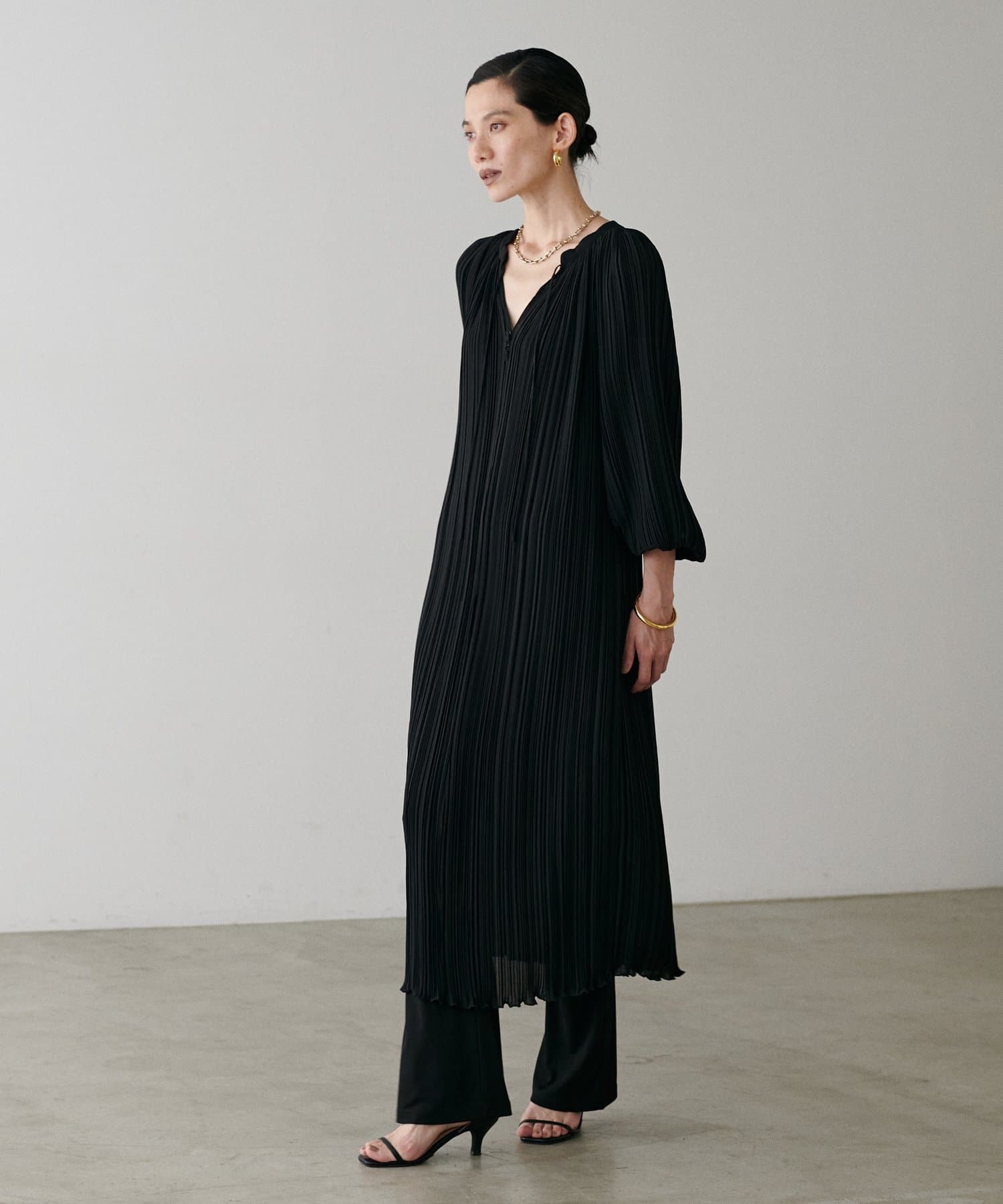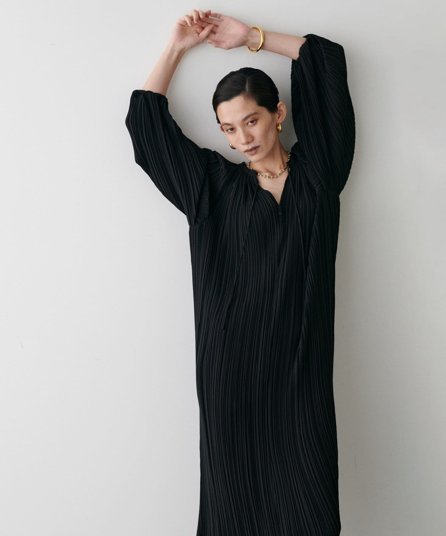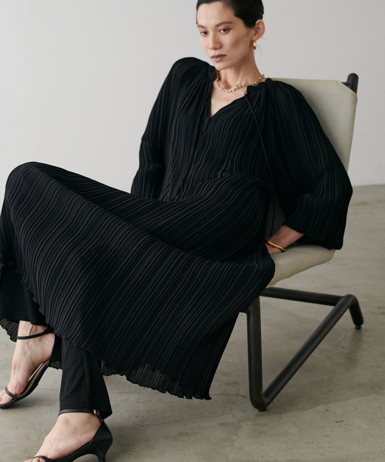 袖のボリューム感と、落ち感のある素材による美しいドレープが魅力のプリーツワンピース。