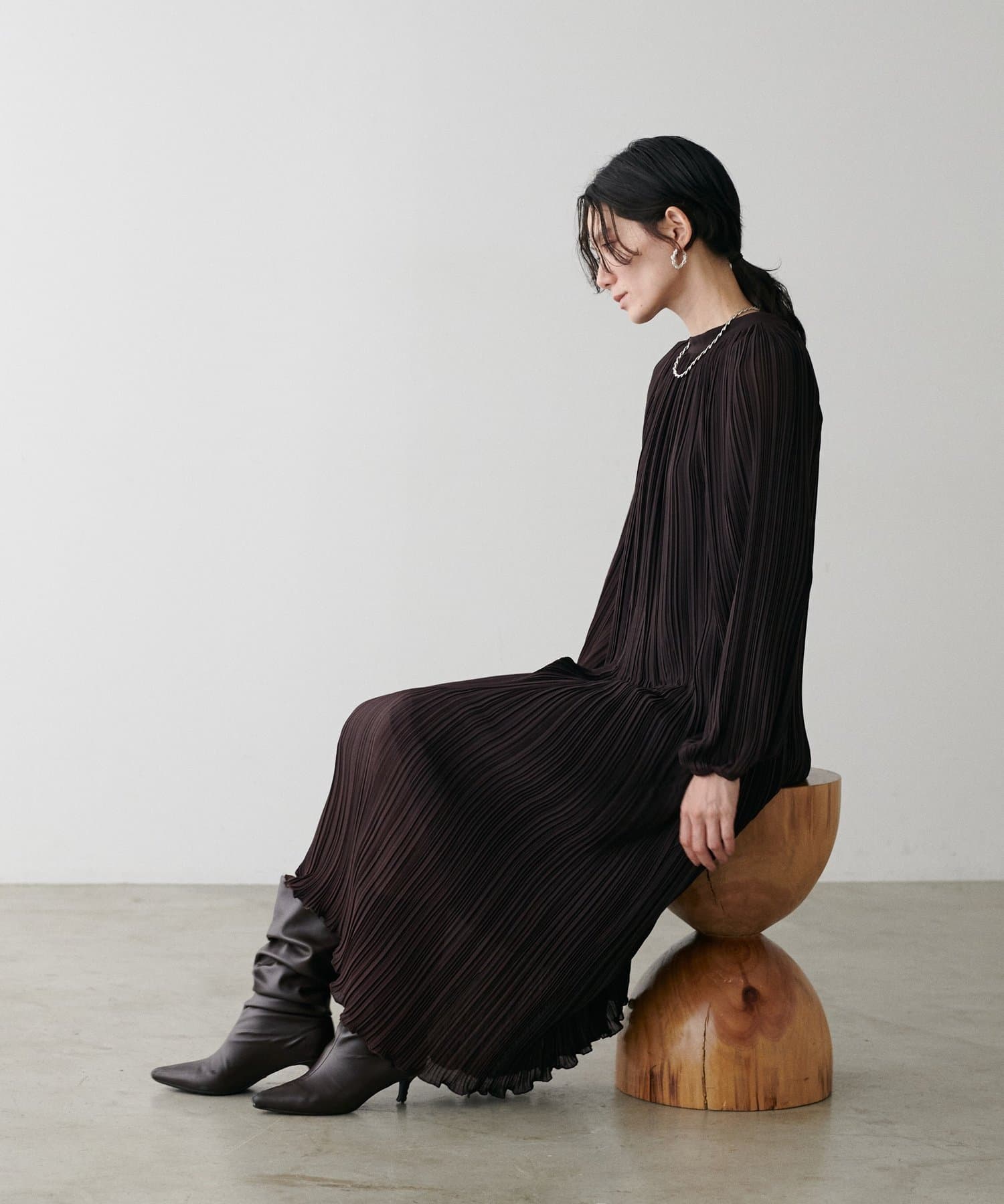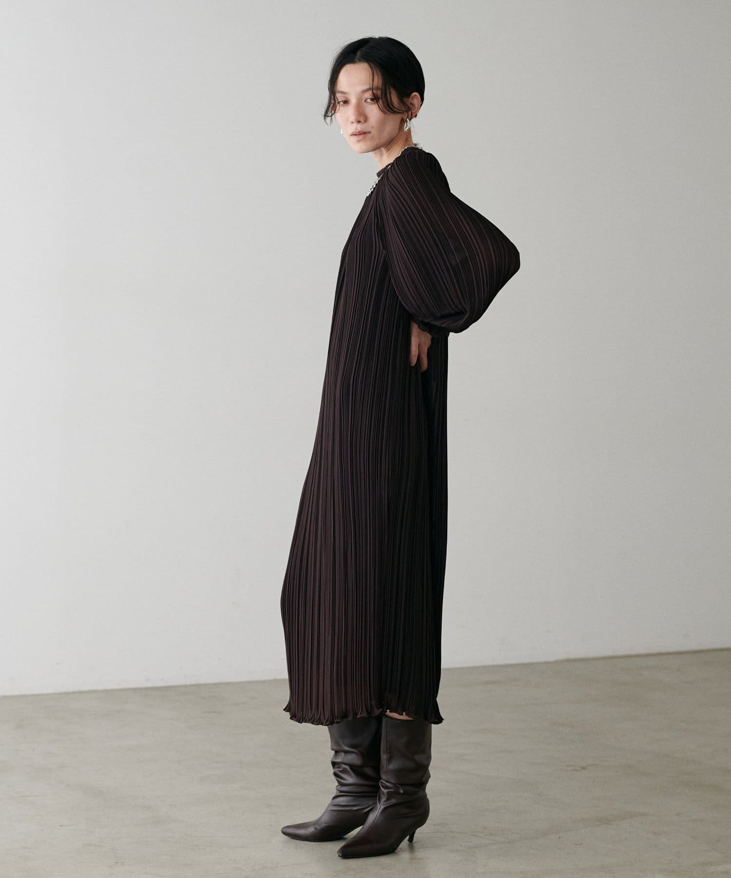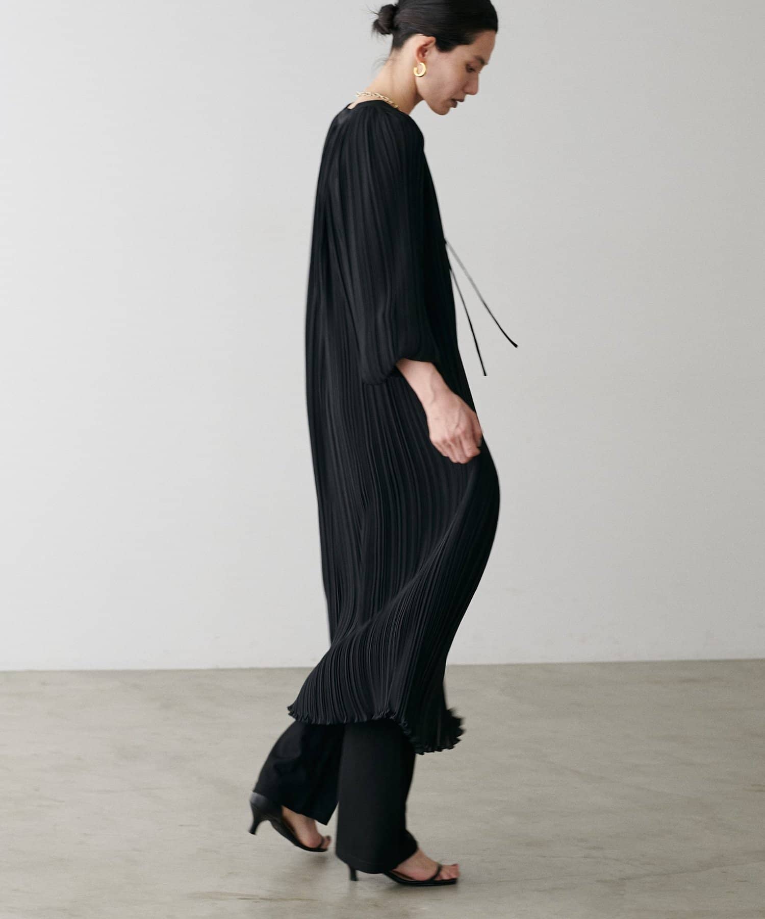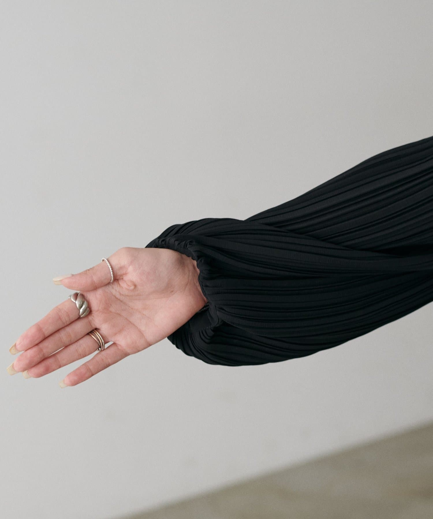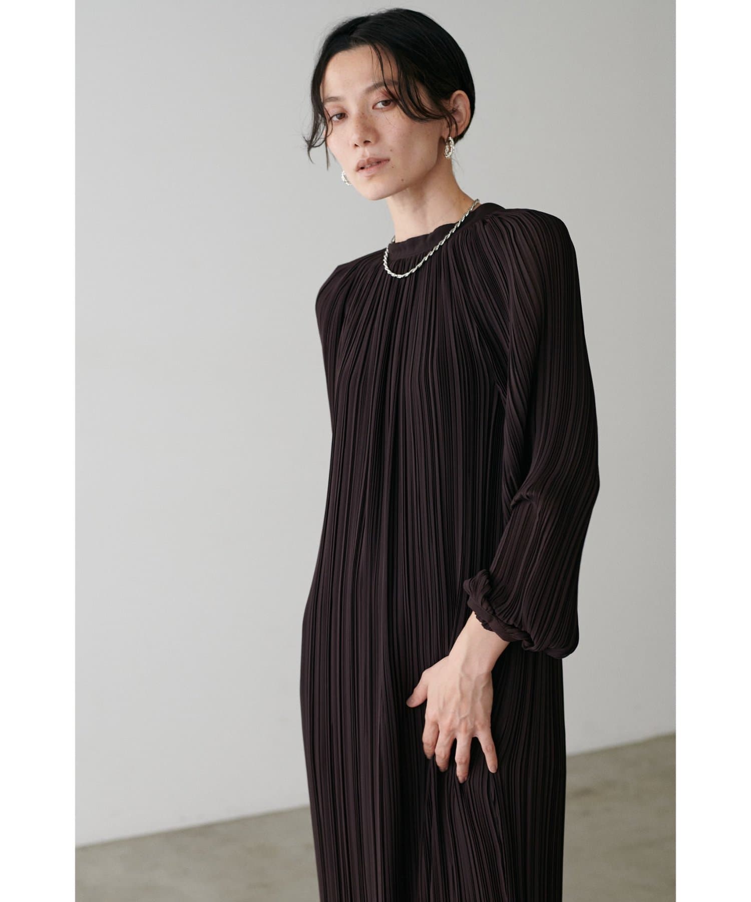 袖のボリューム感と、落ち感のある素材による美しいドレープが魅力のプリーツワンピース。