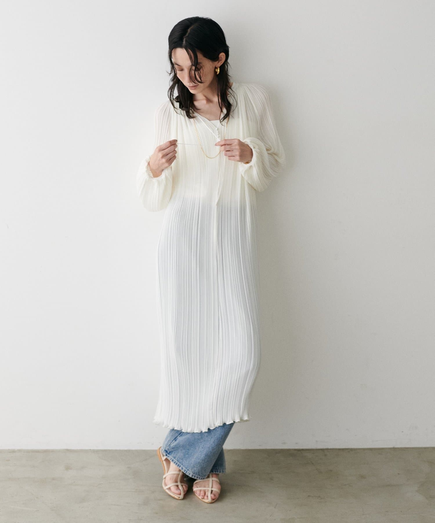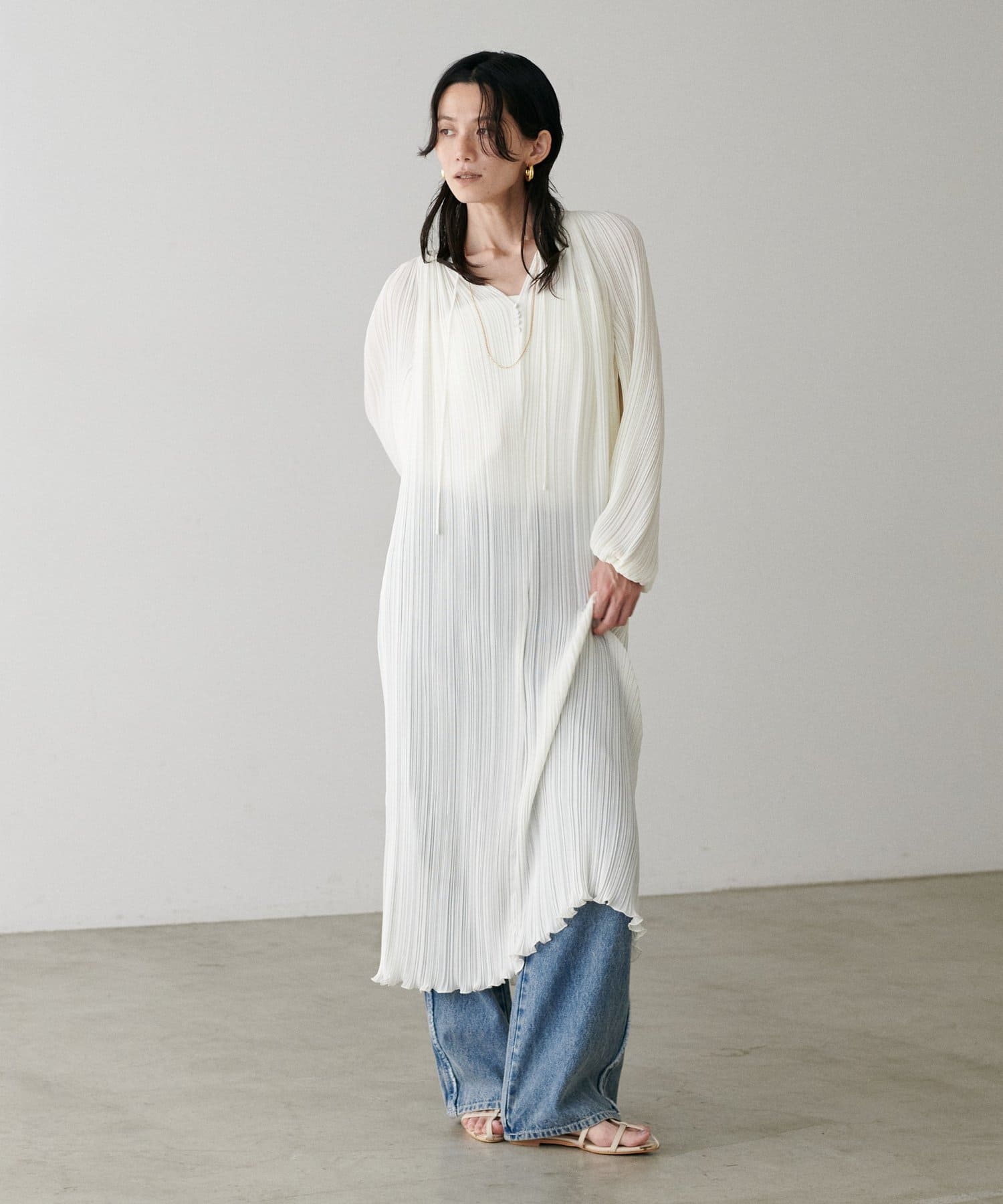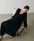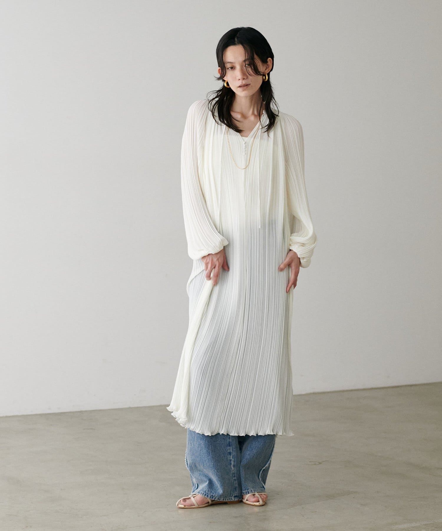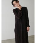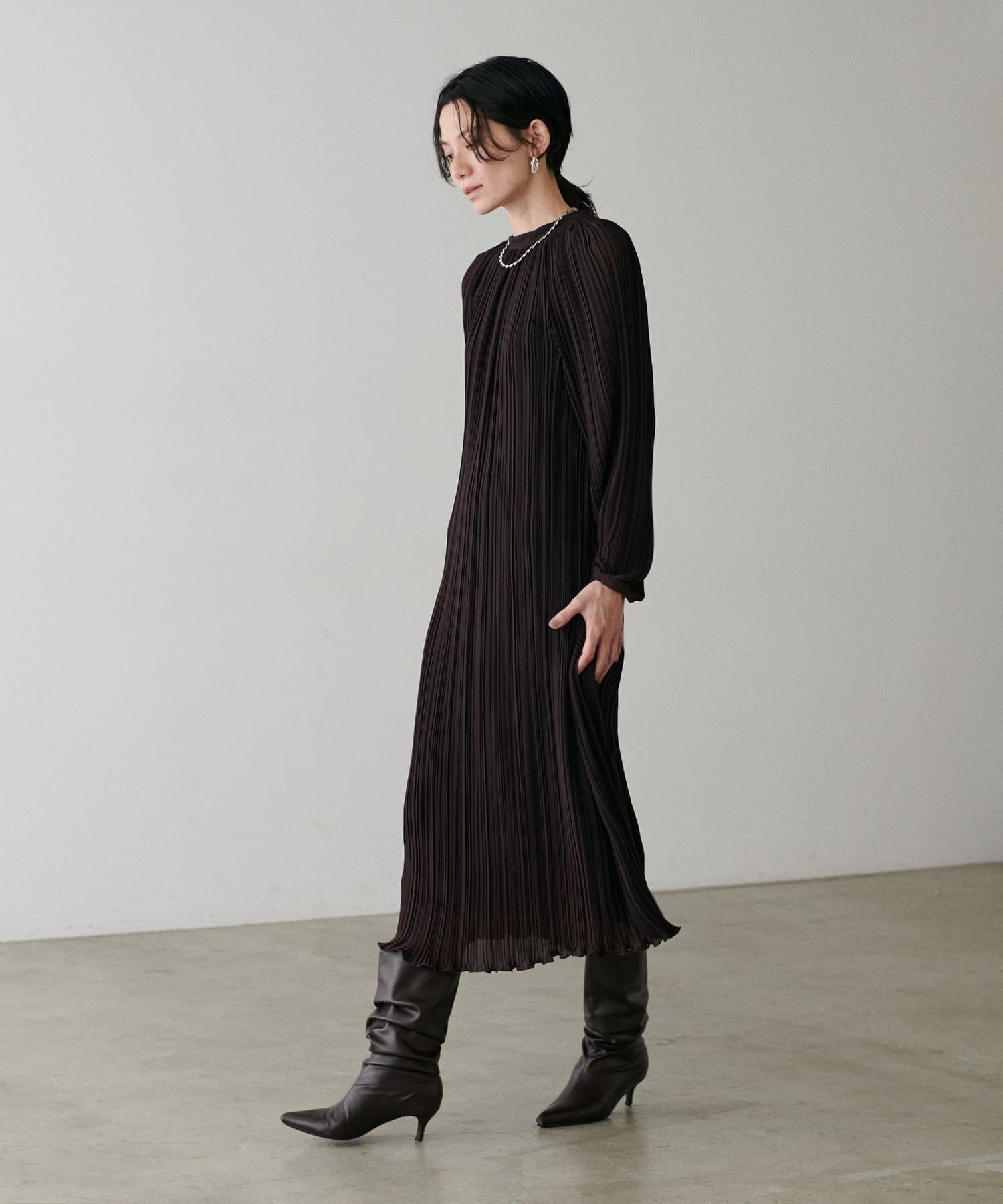袖のボリューム感と、落ち感のある素材による美しいドレープが魅力のプリーツワンピース。