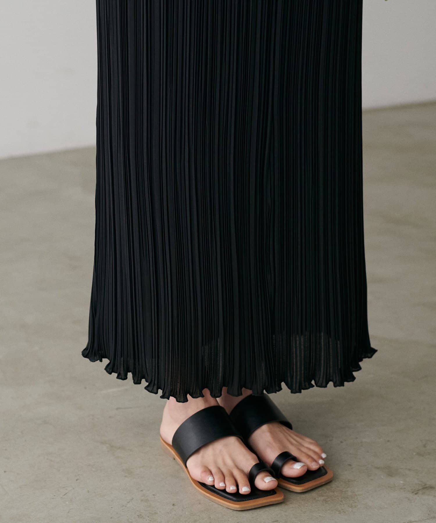 プリーツの縦ラインがスタイルアップを叶え、シンプルながらも