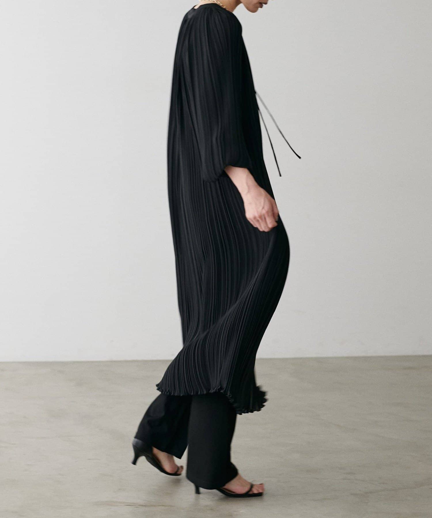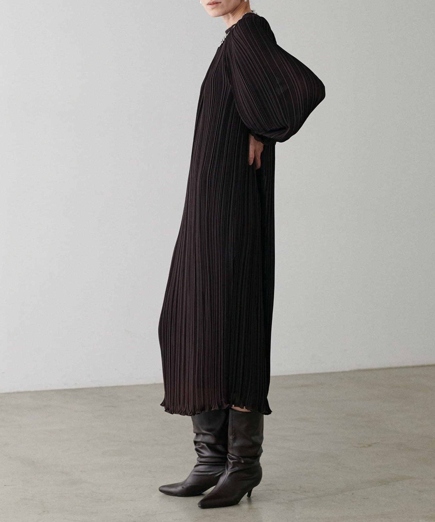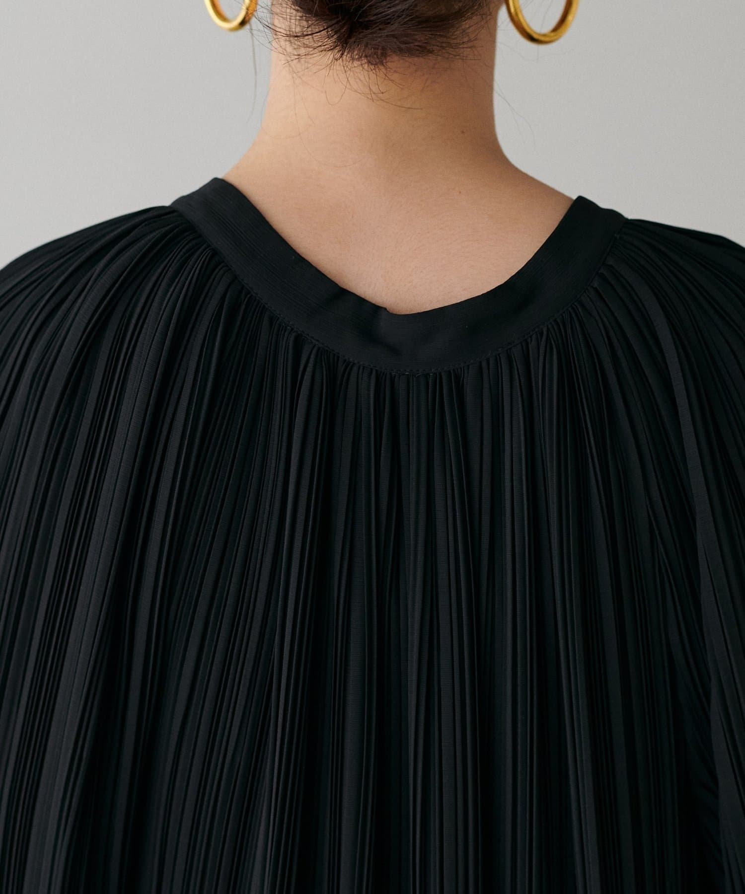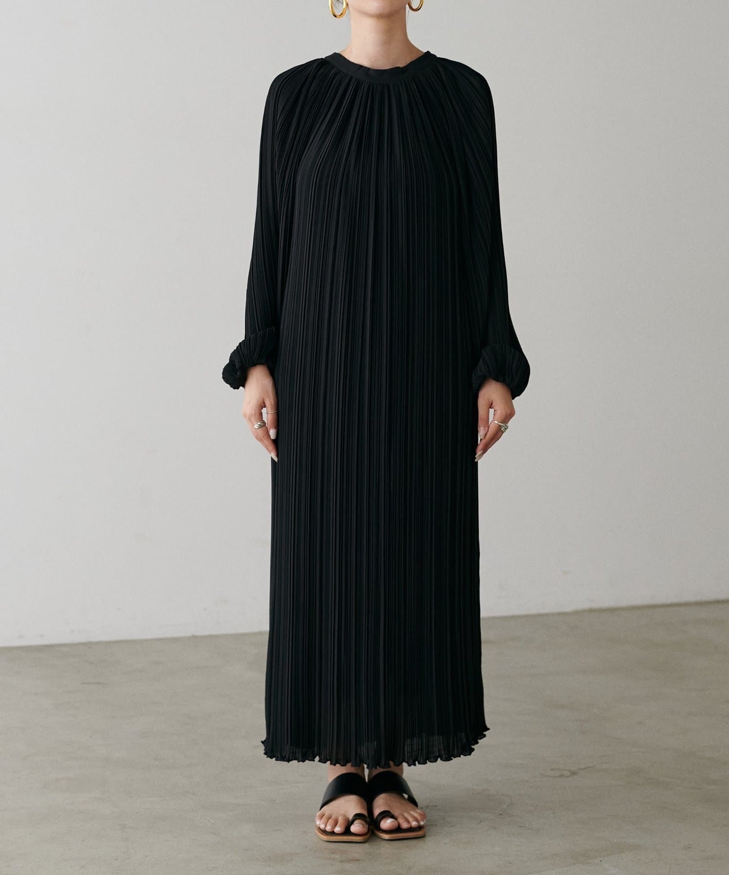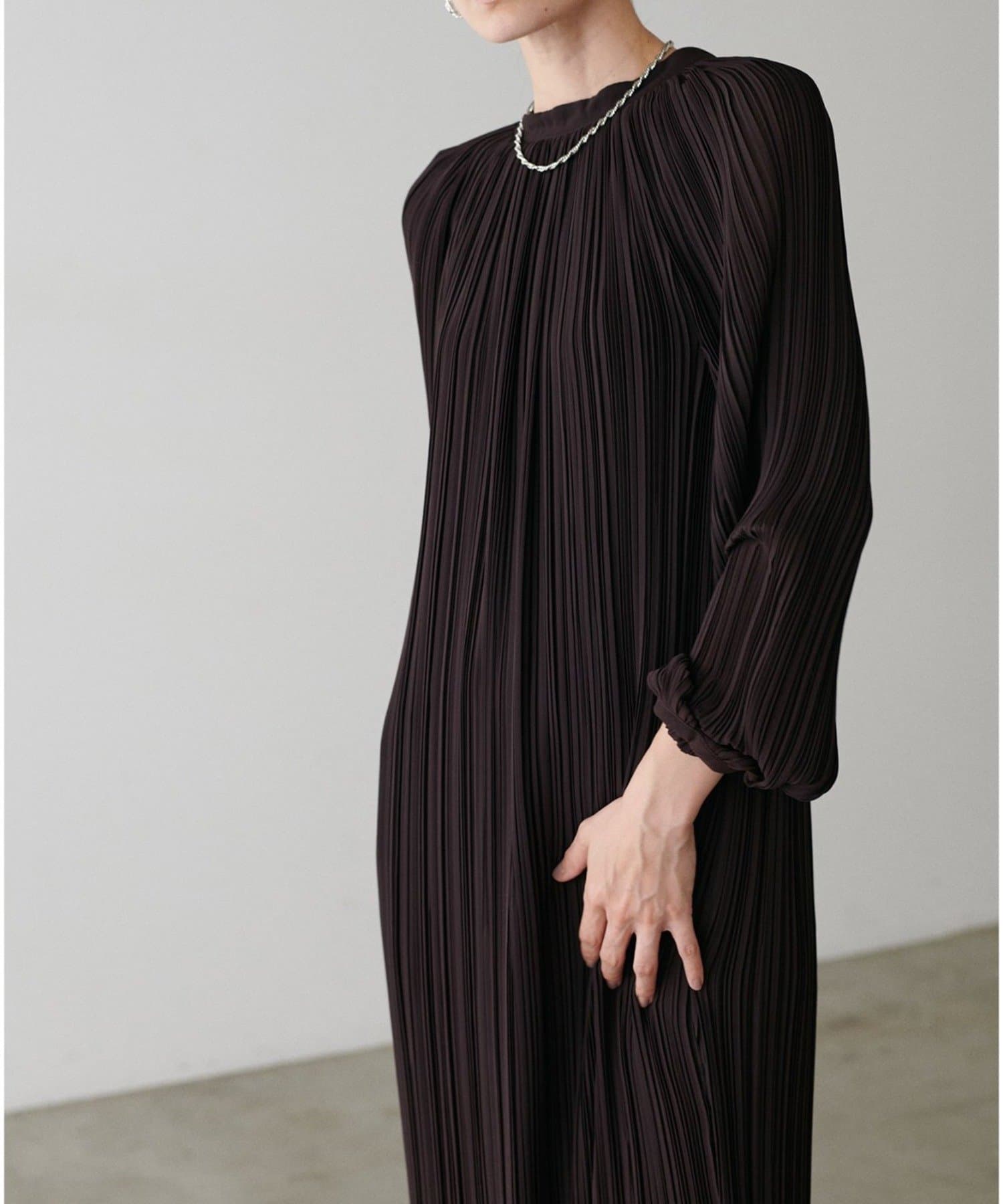 袖のボリューム感と、落ち感のある素材による美しいドレープが魅力のプリーツワンピース。
