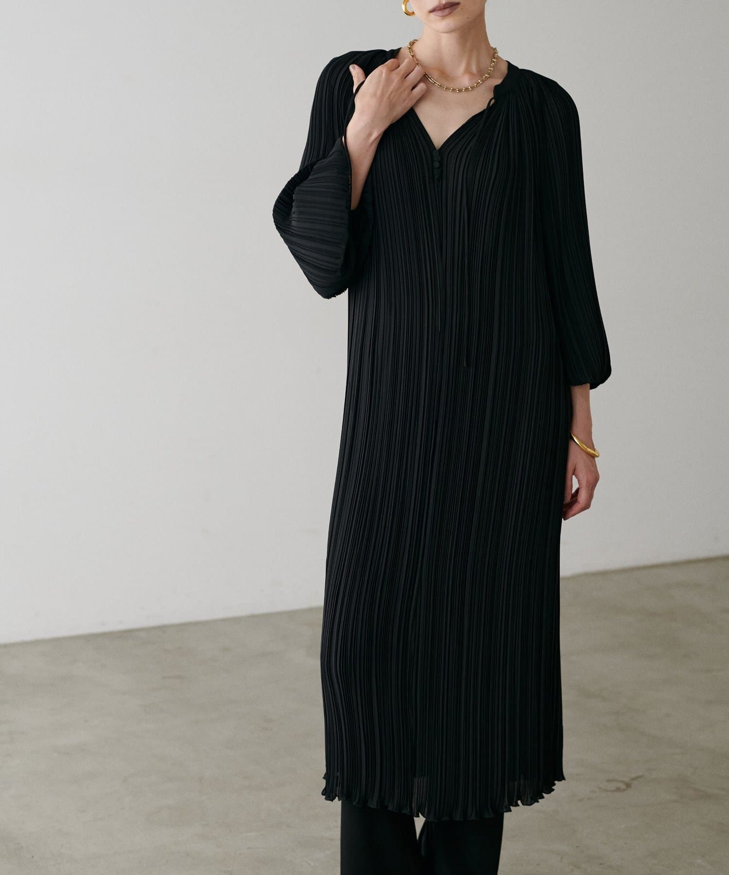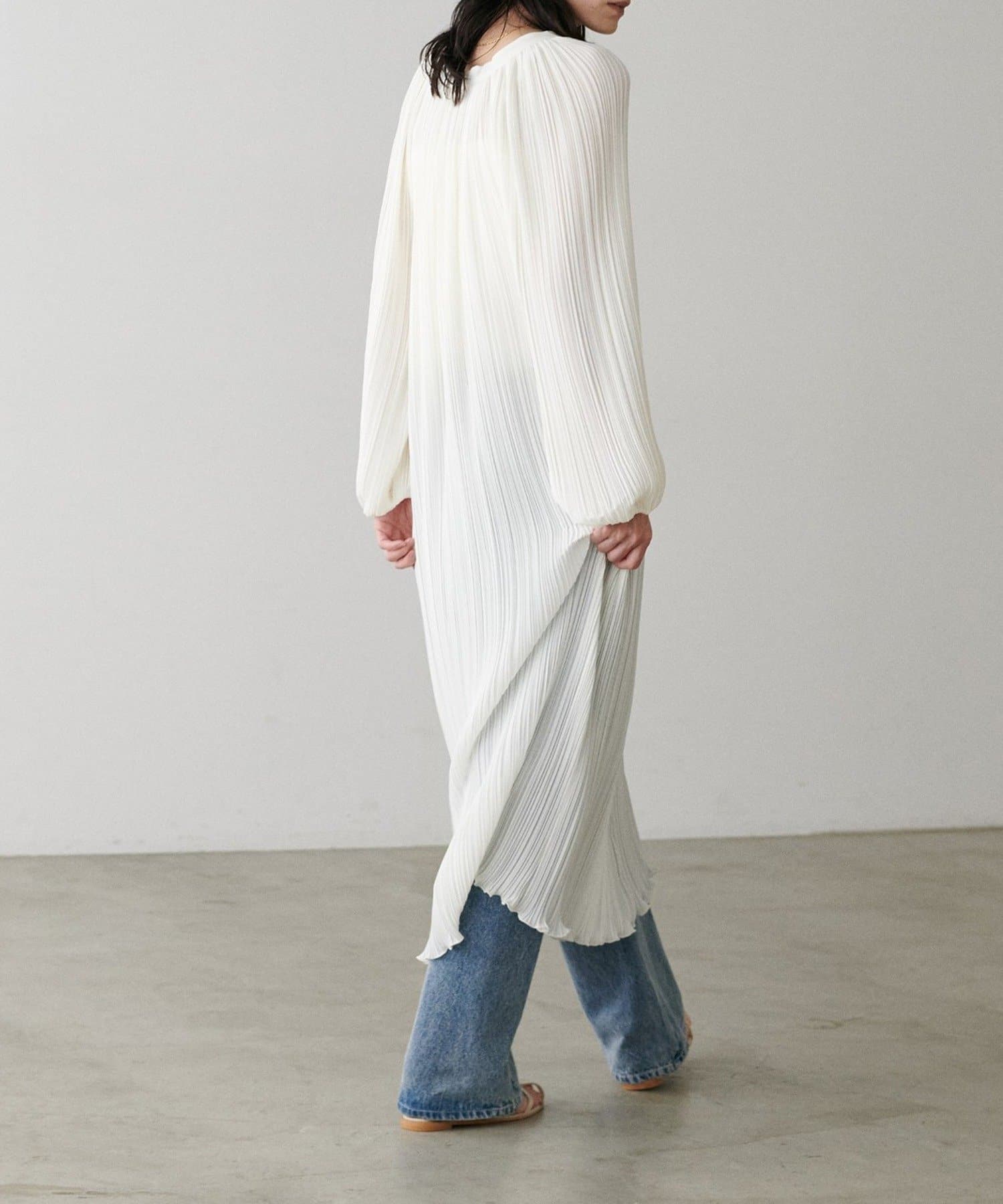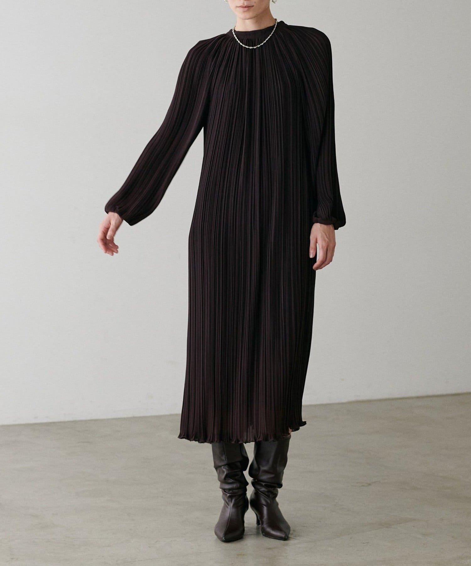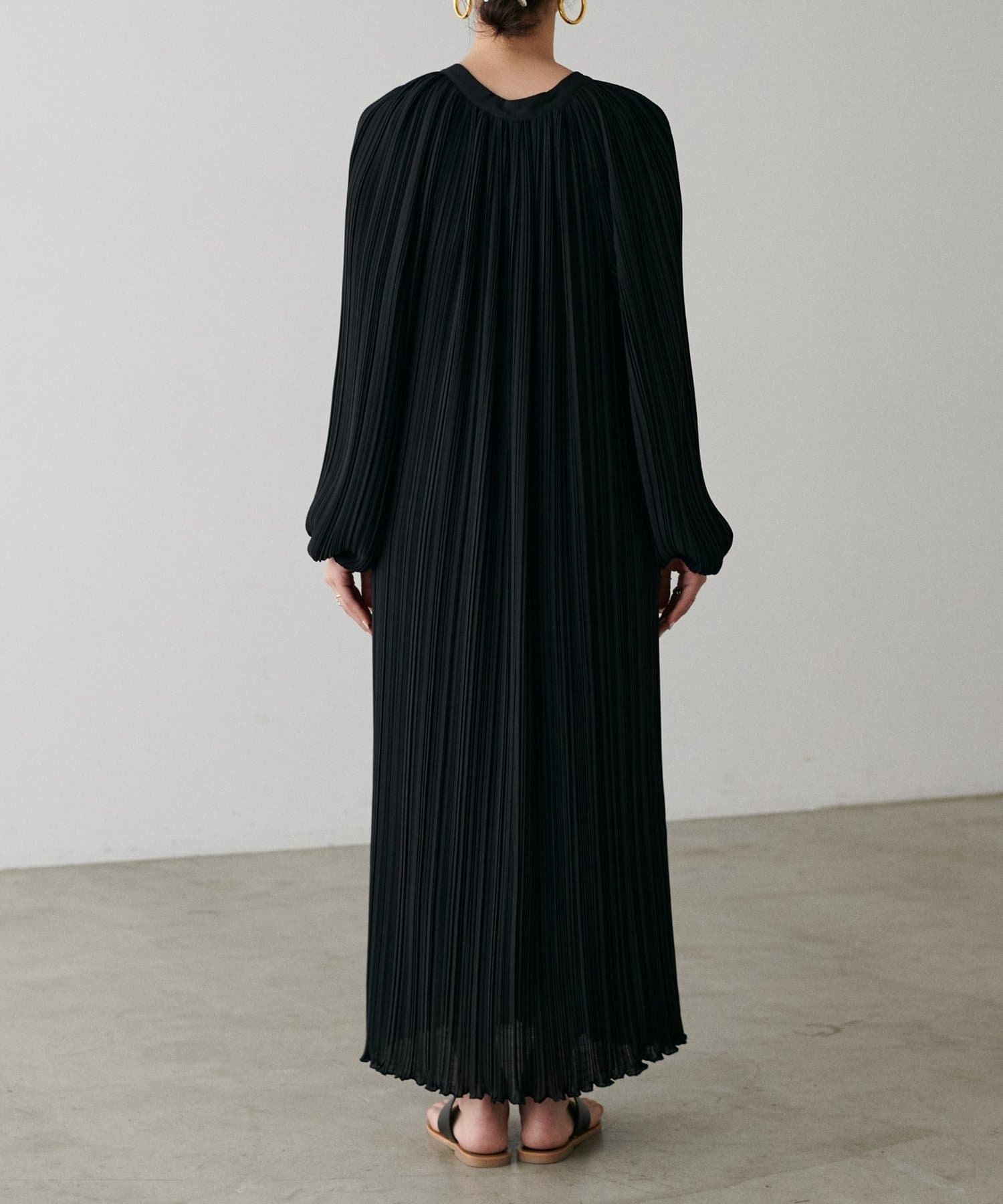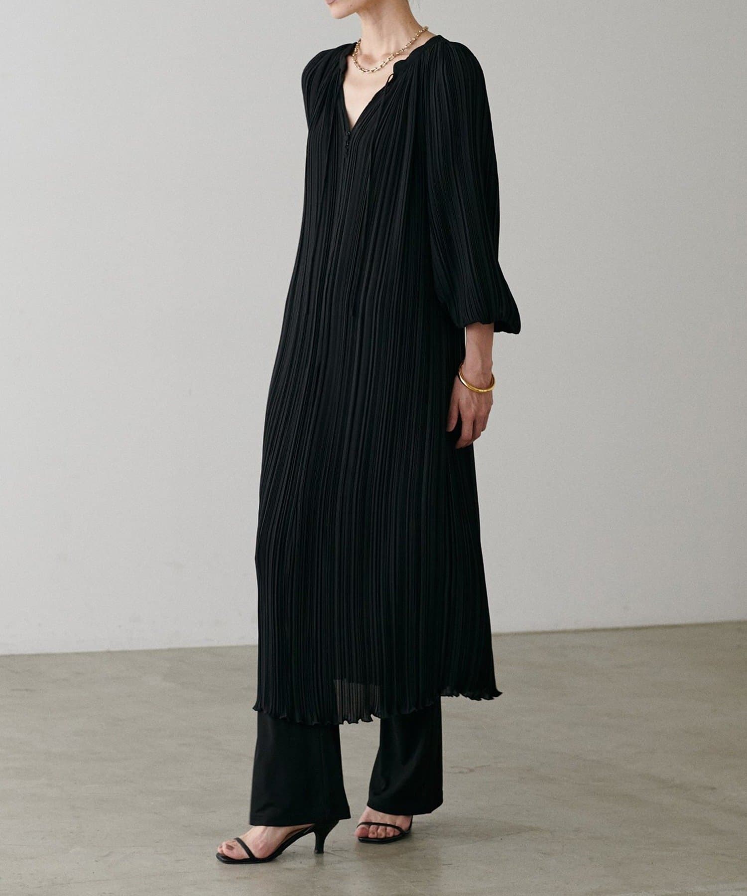 袖のボリューム感と、落ち感のある素材による美しいドレープが魅力のプリーツワンピース。