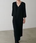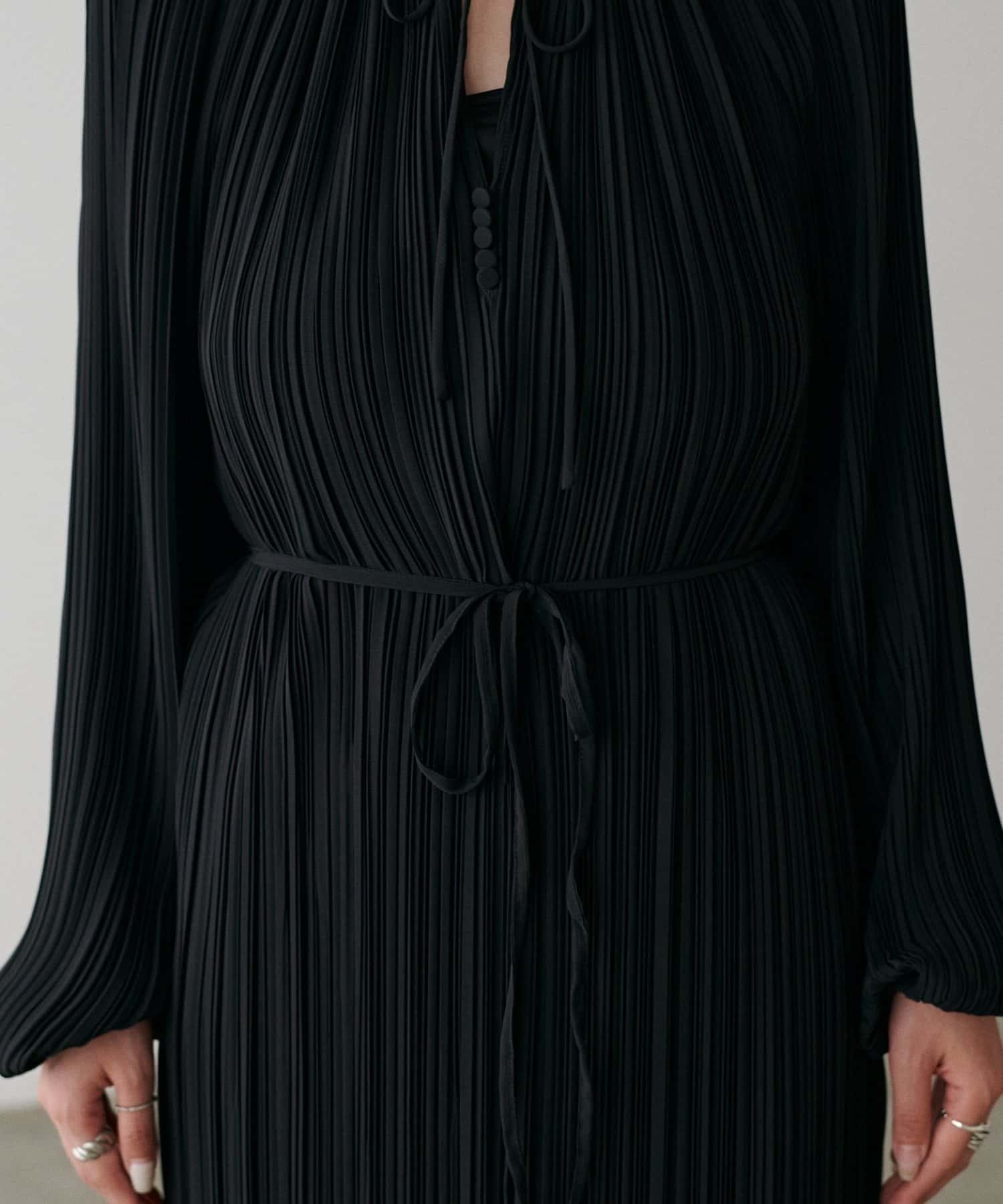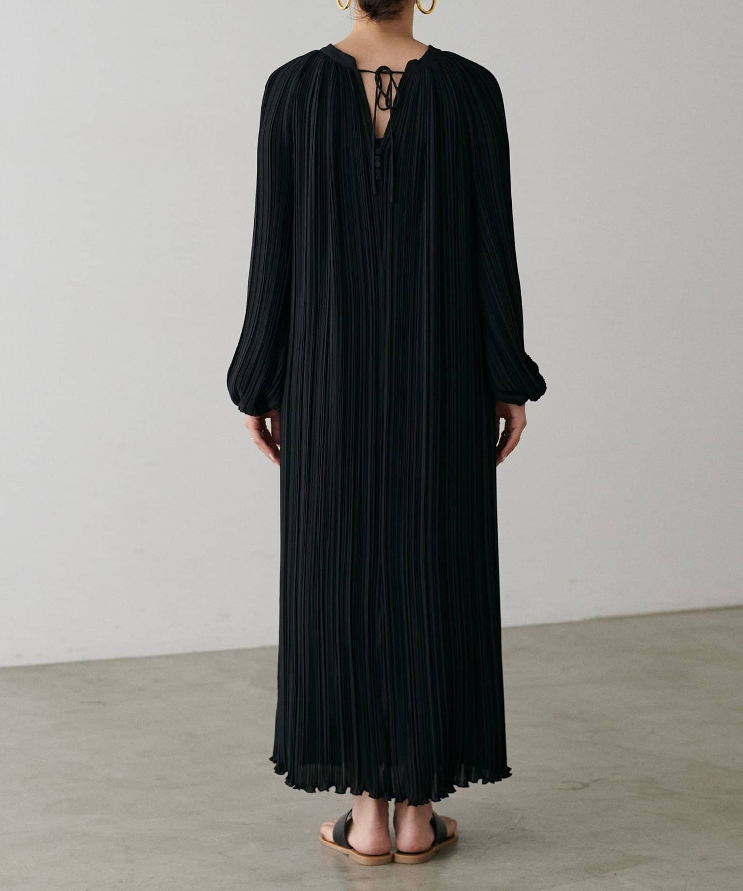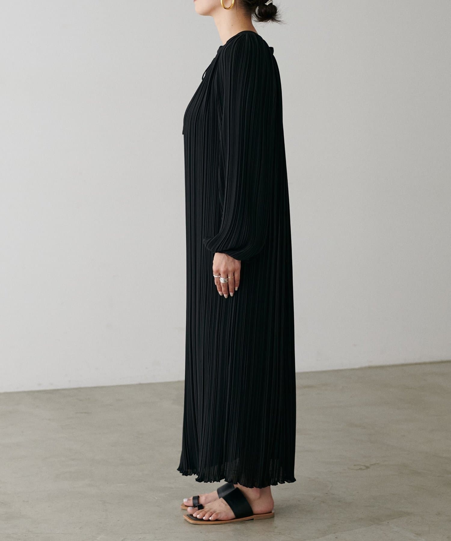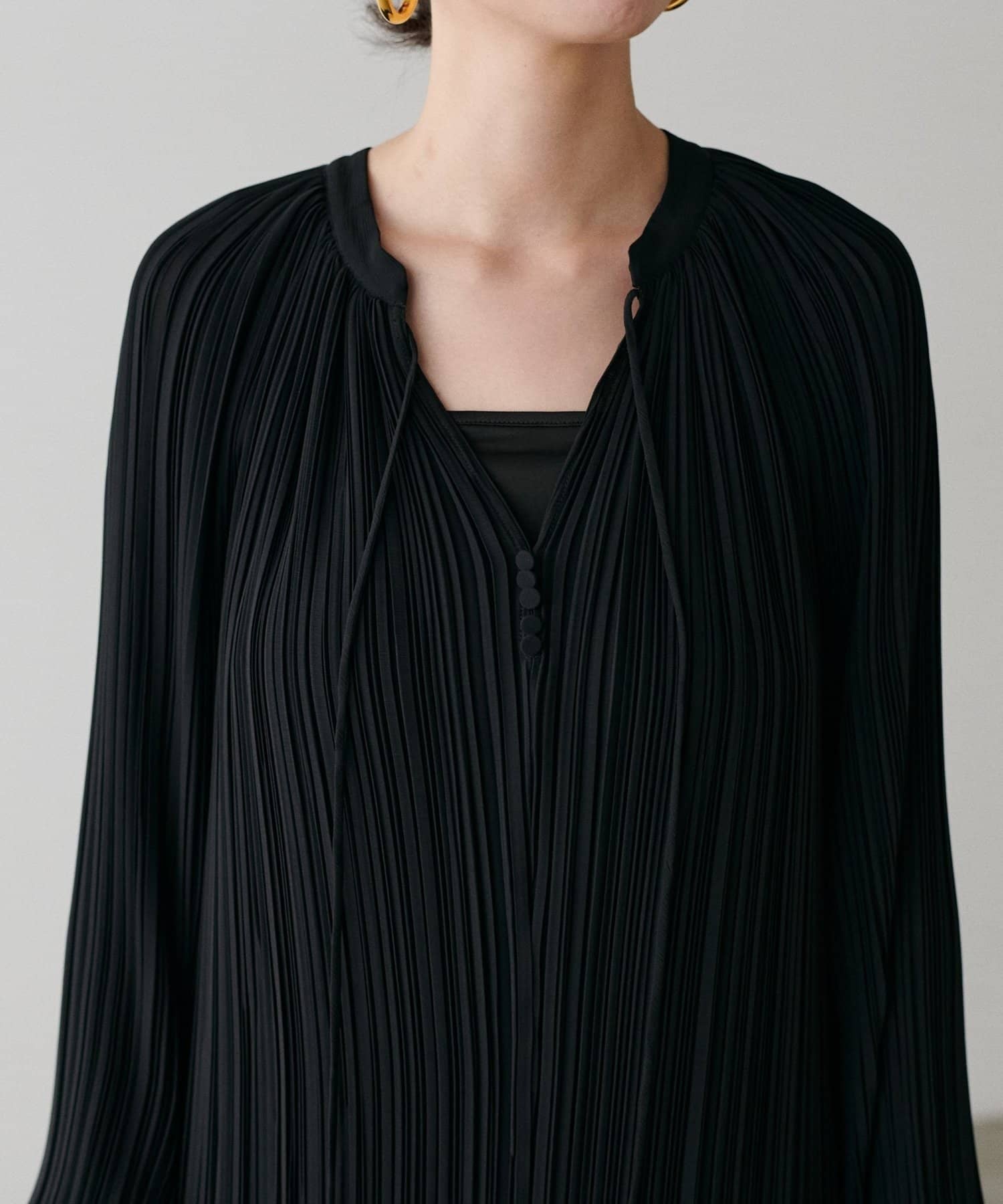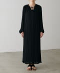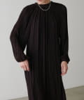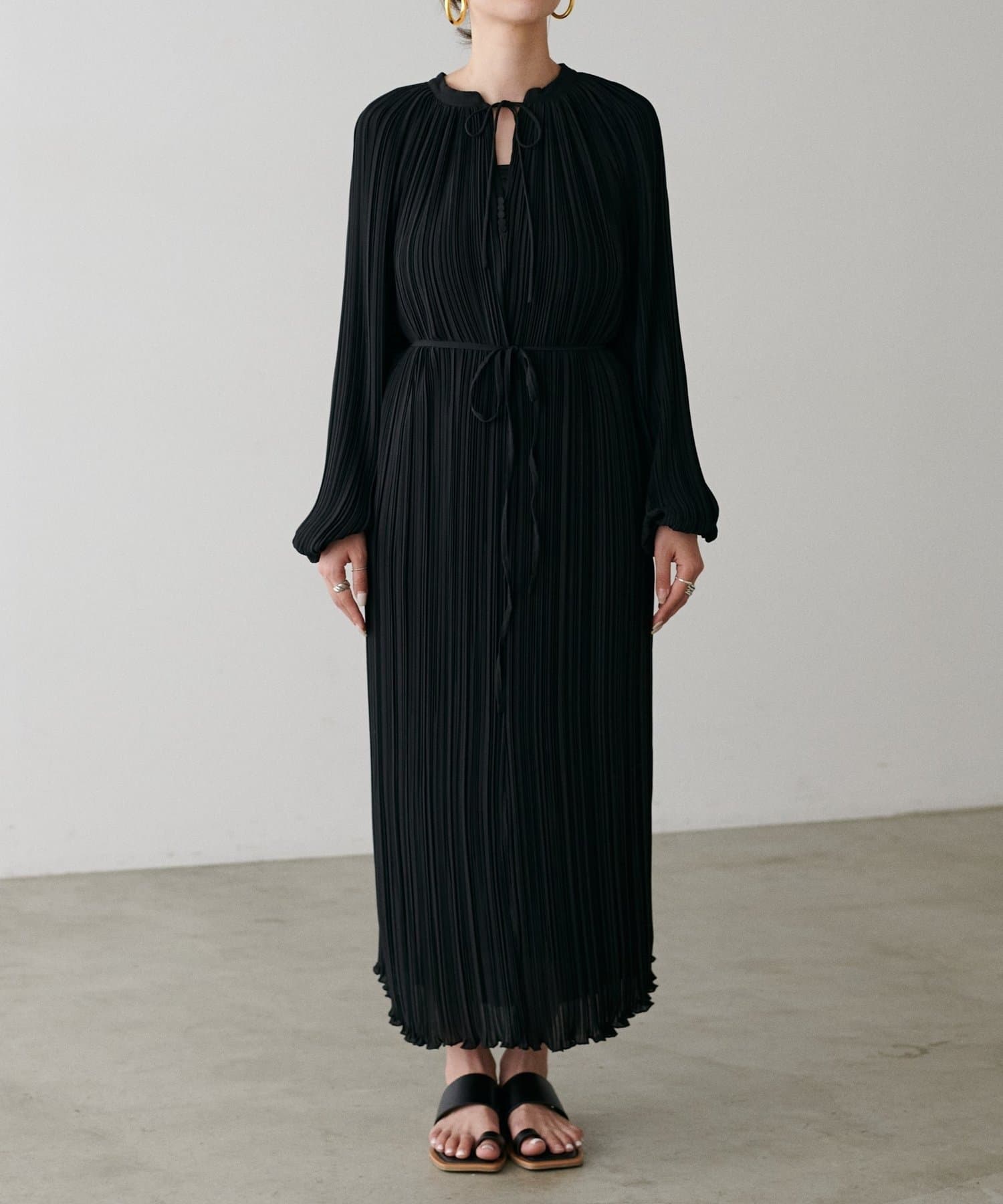 袖のボリューム感と、落ち感のある素材による美しいドレープが魅力のプリーツワンピース。