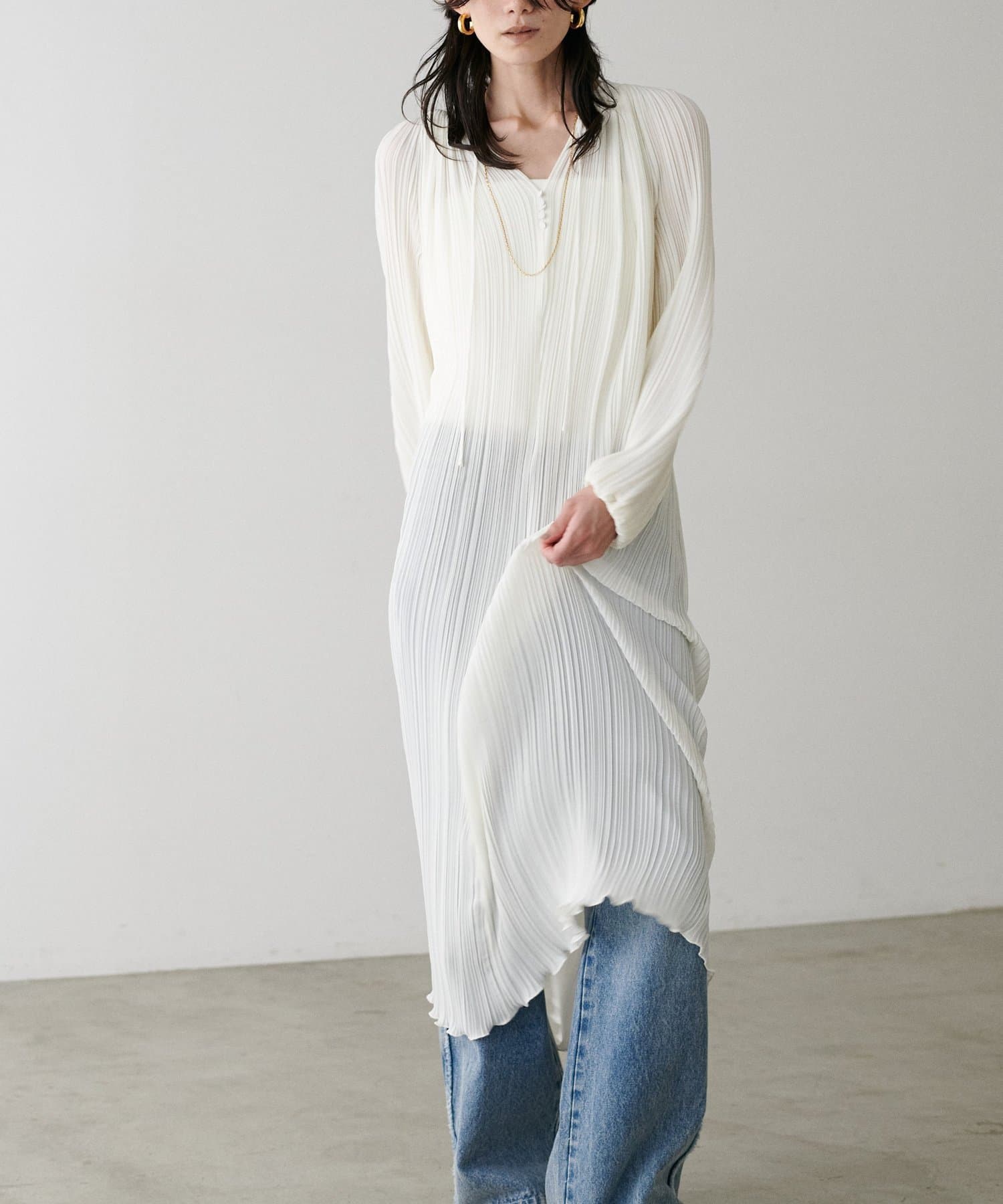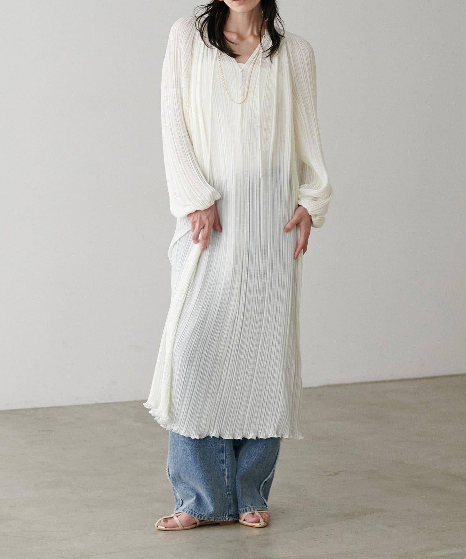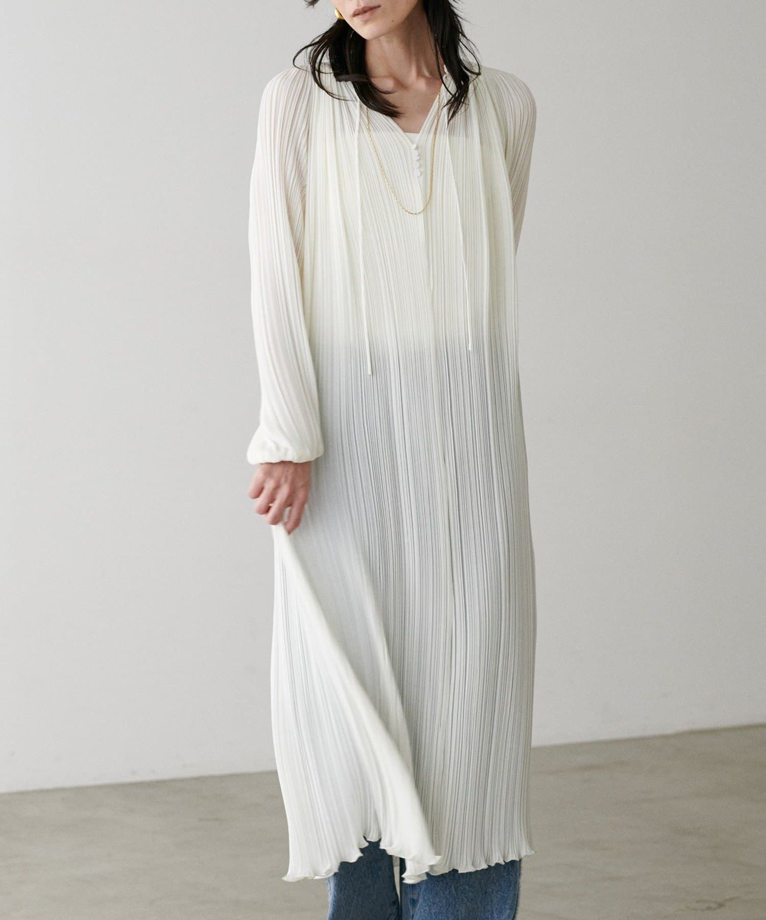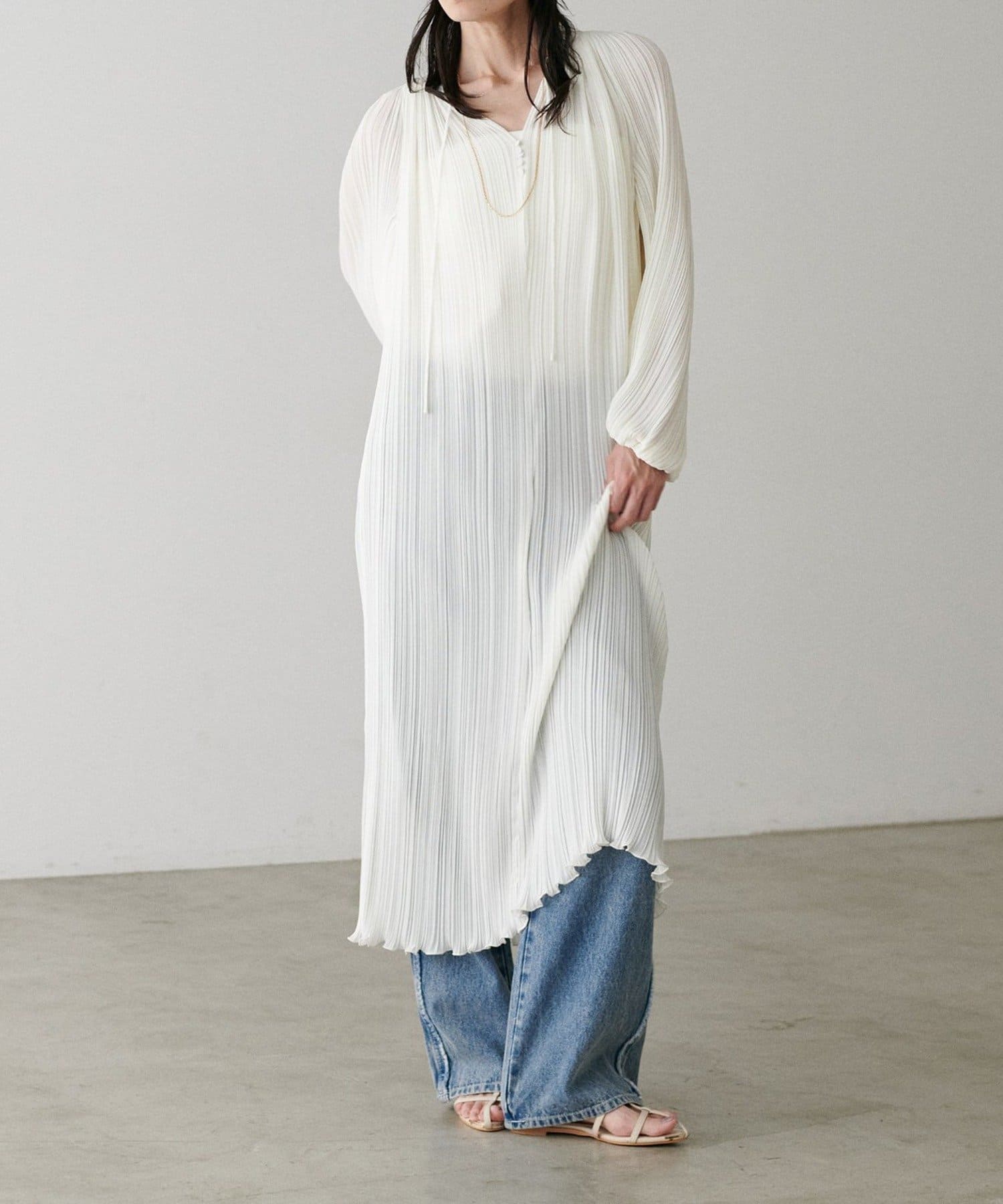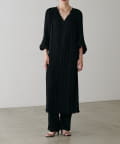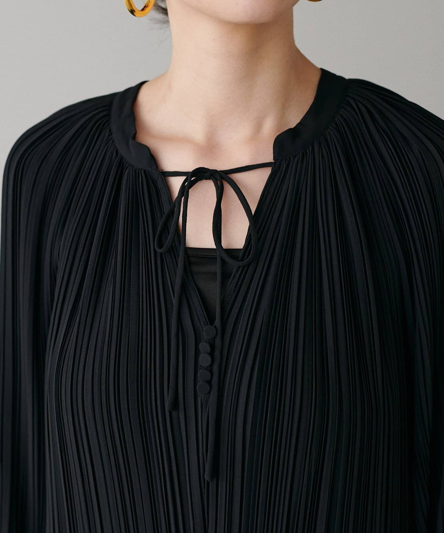 袖のボリューム感と、落ち感のある素材による美しいドレープが魅力のプリーツワンピース。
