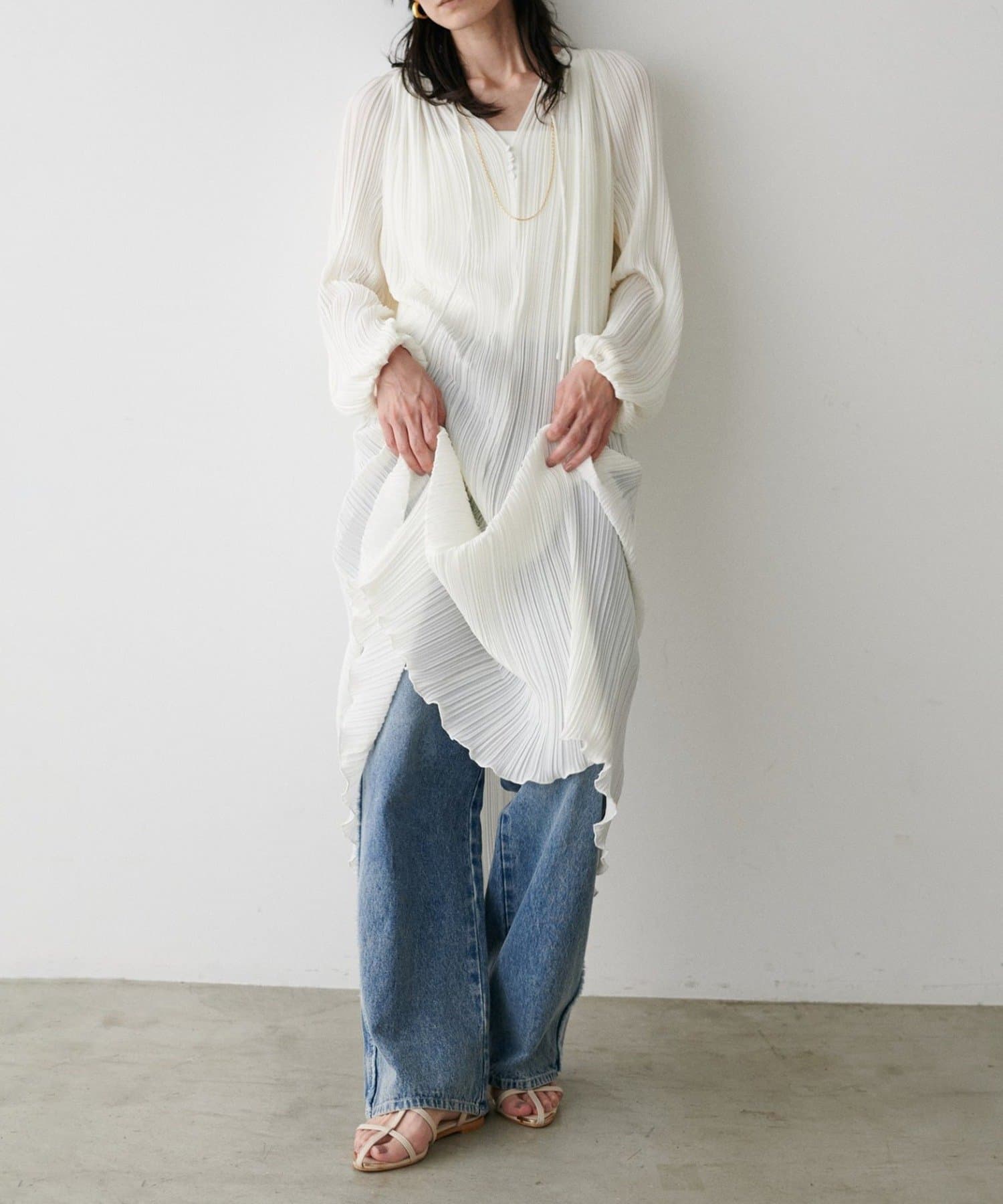 プリーツの縦ラインがスタイルアップを叶え、シンプルながらも