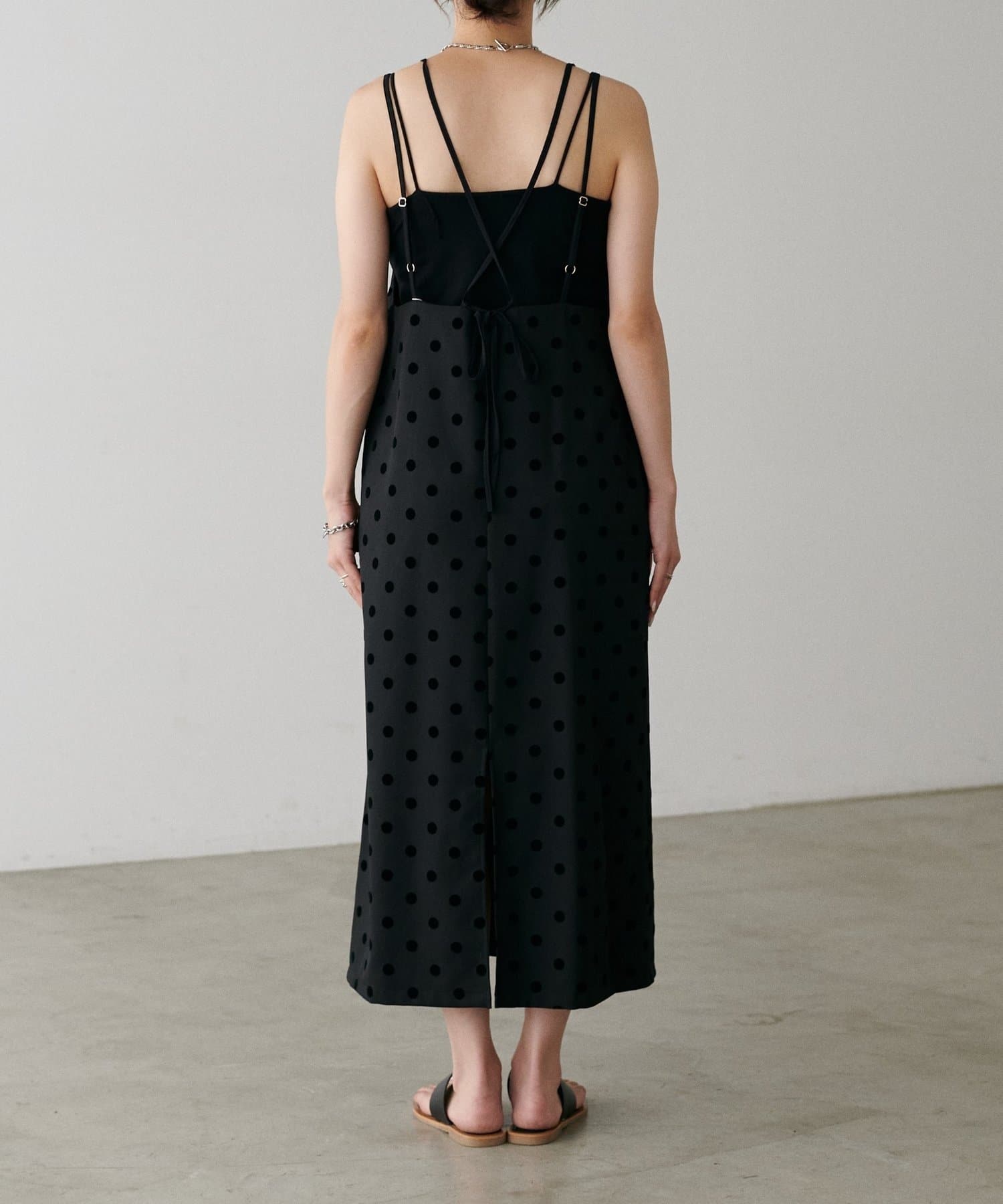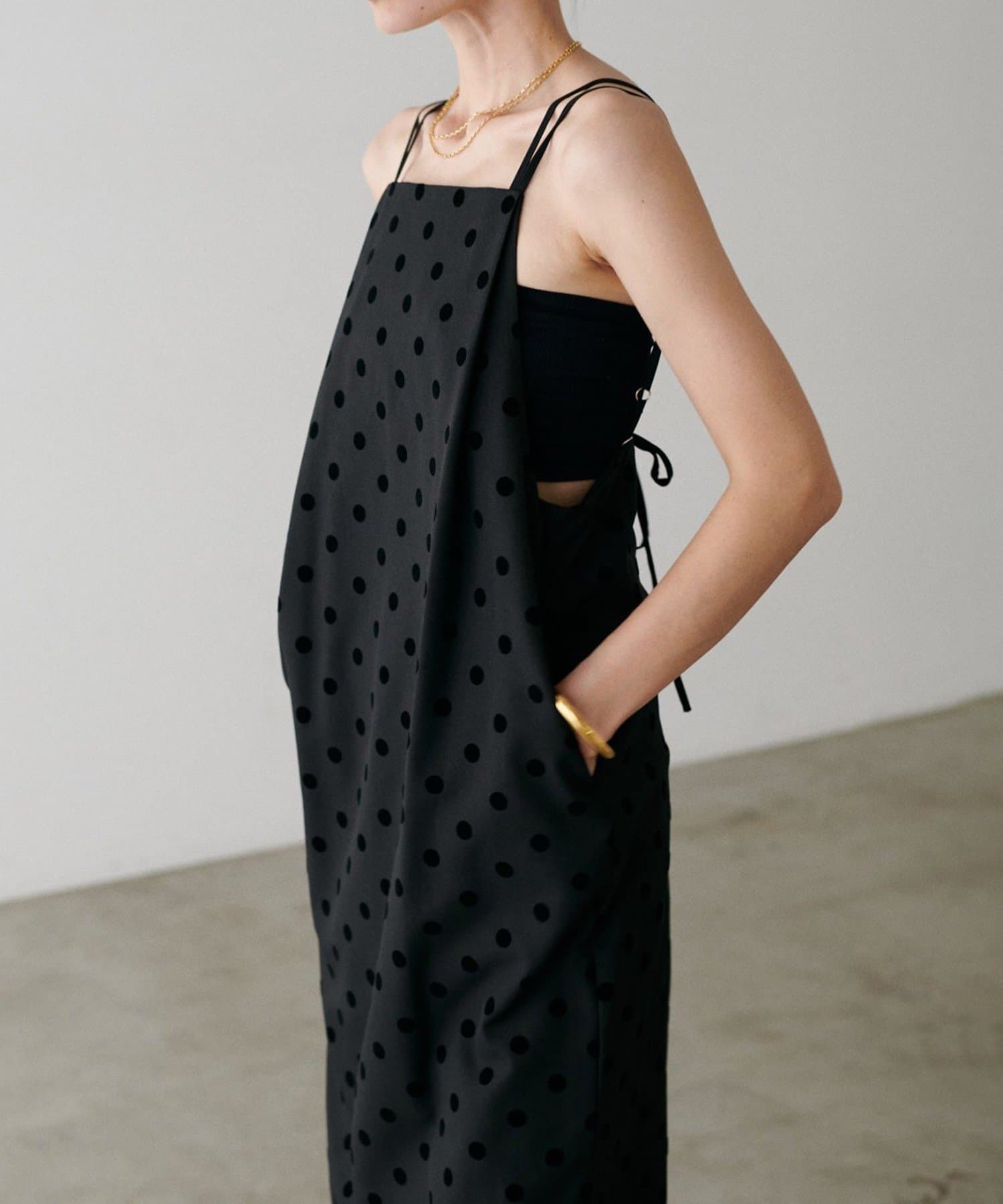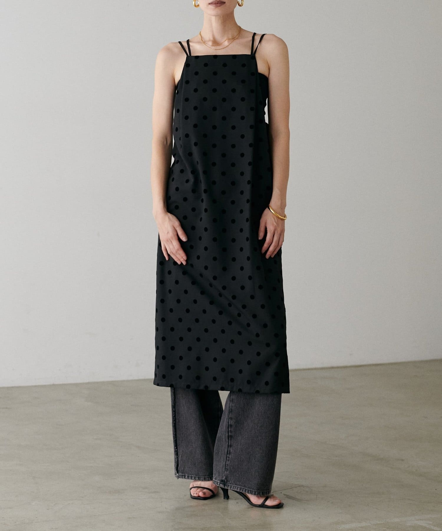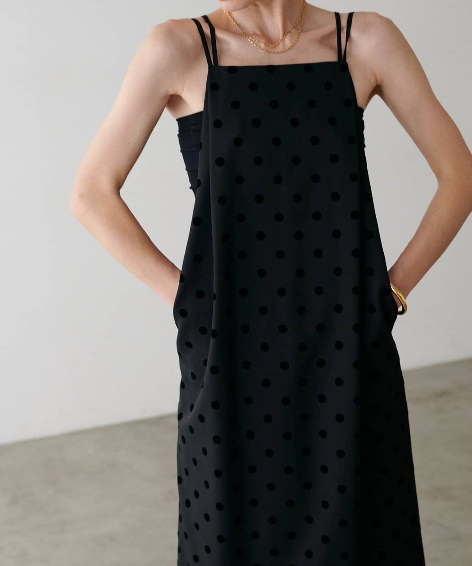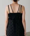 立体感のあるフロッキードットが施されたツイル素材のキャミワンピース。