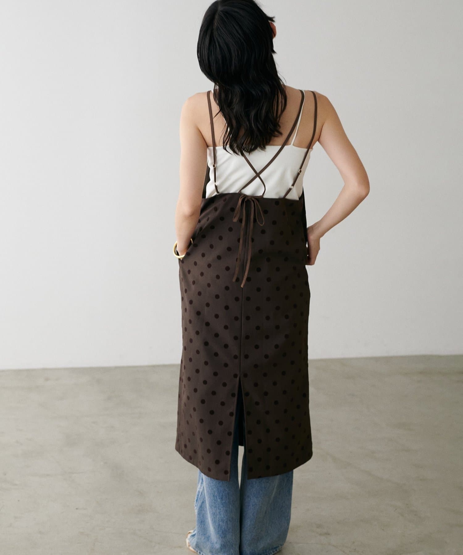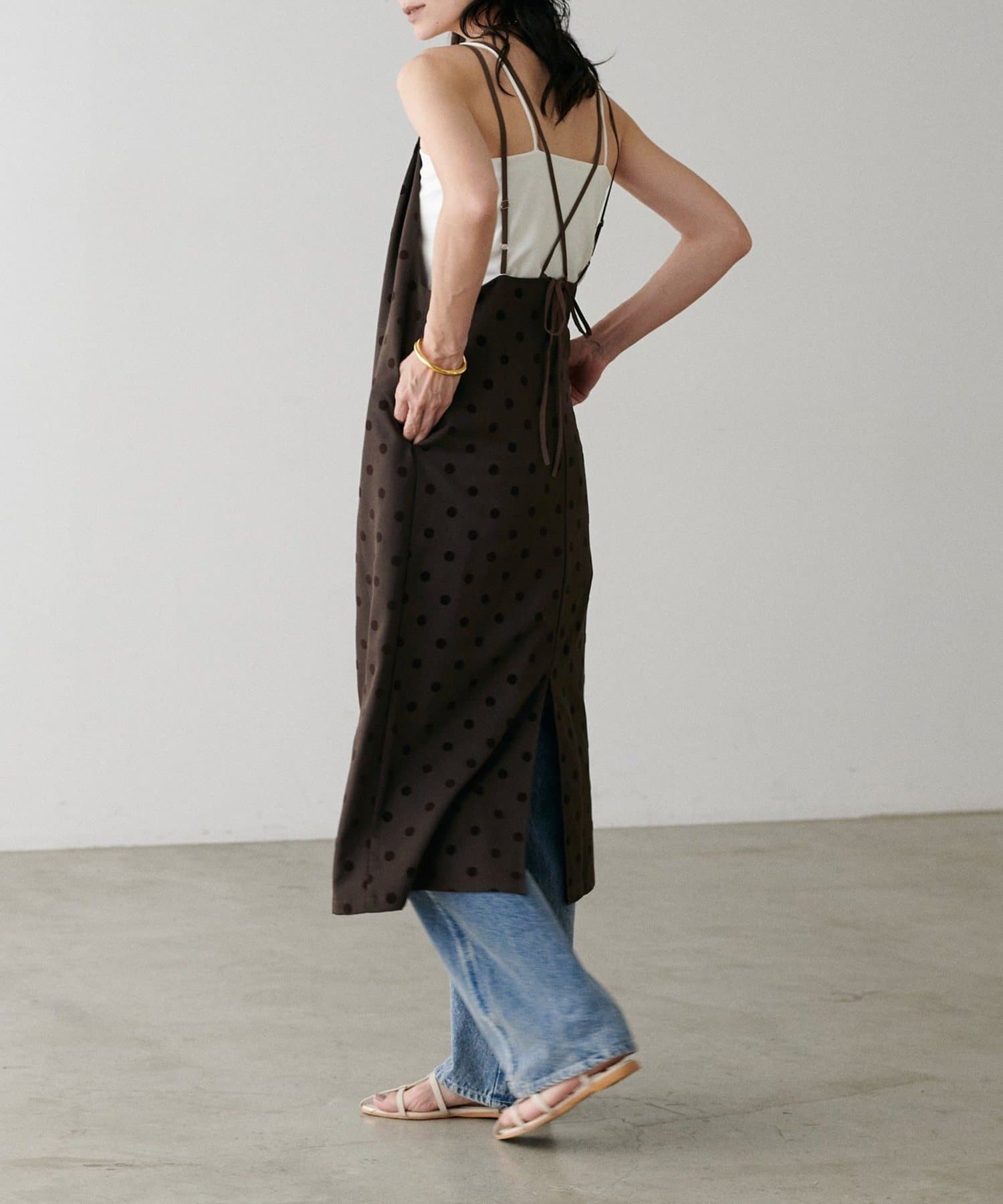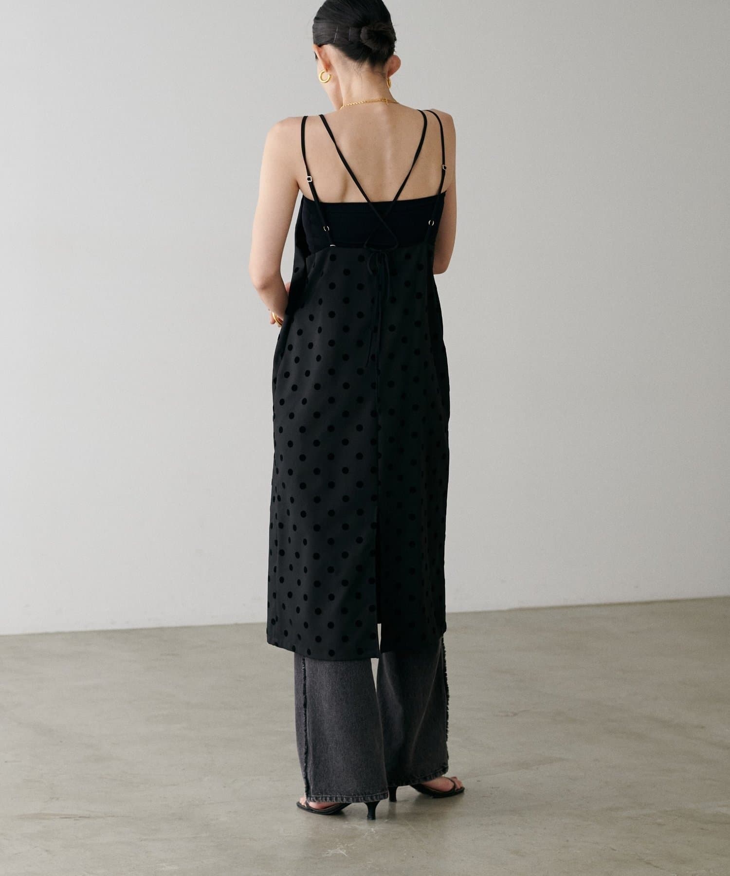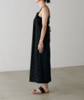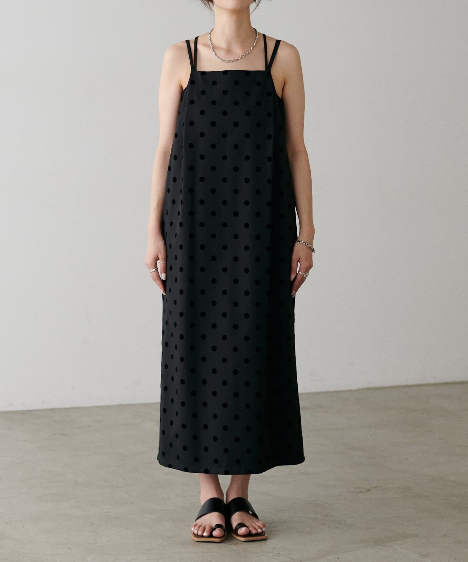 立体感のあるフロッキードットが施されたツイル素材のキャミワンピース。