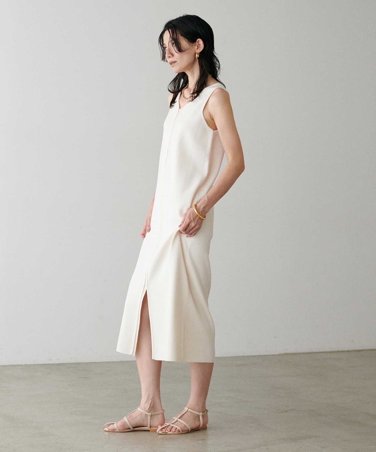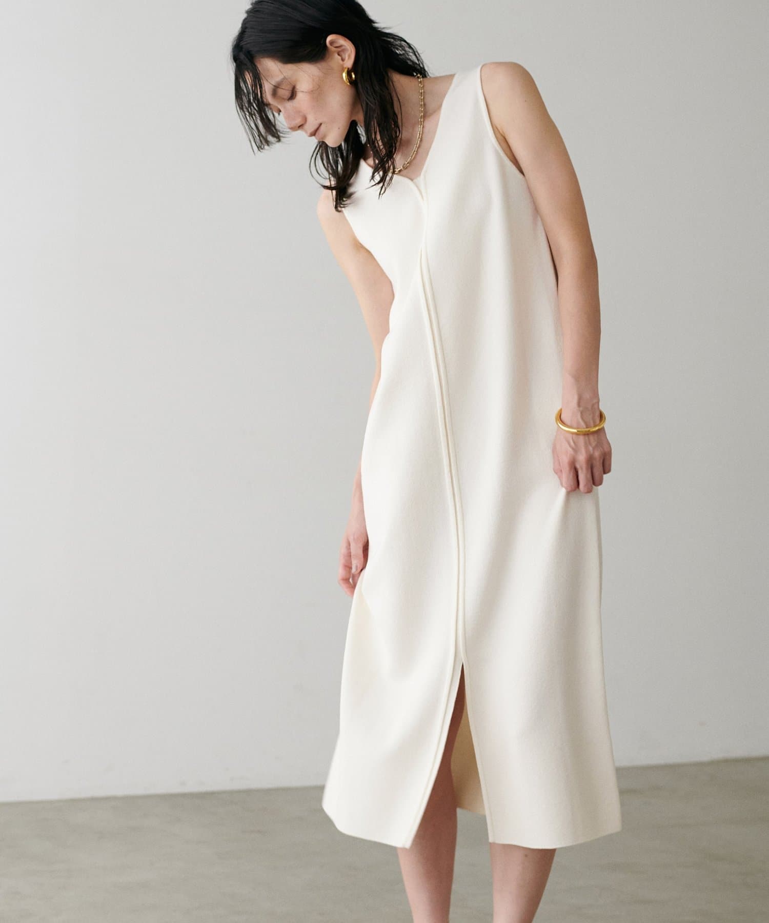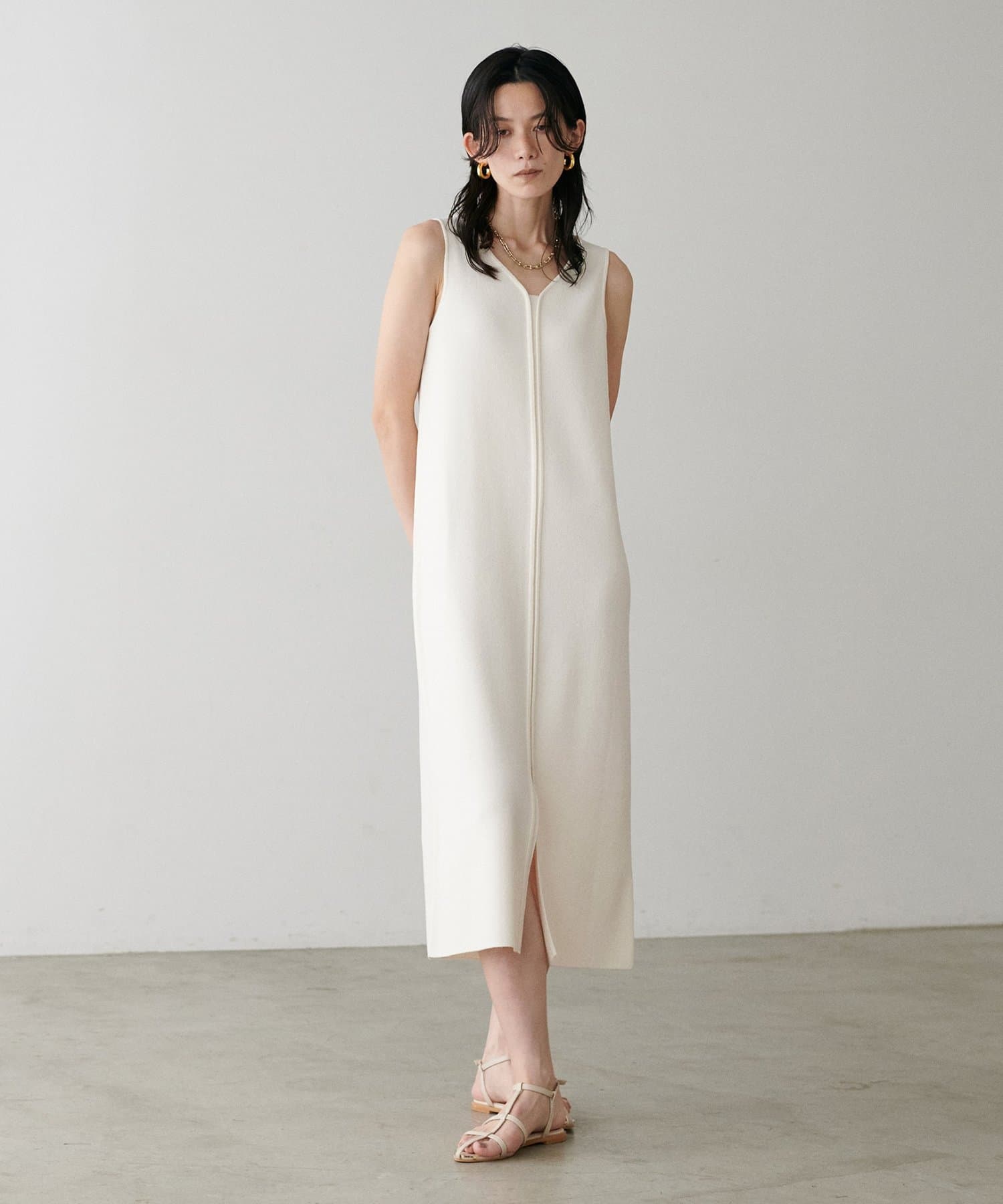 やわらかなメランジカラーの糸で編み立てた、前後2WAY仕様のノースリーブニットワンピース。