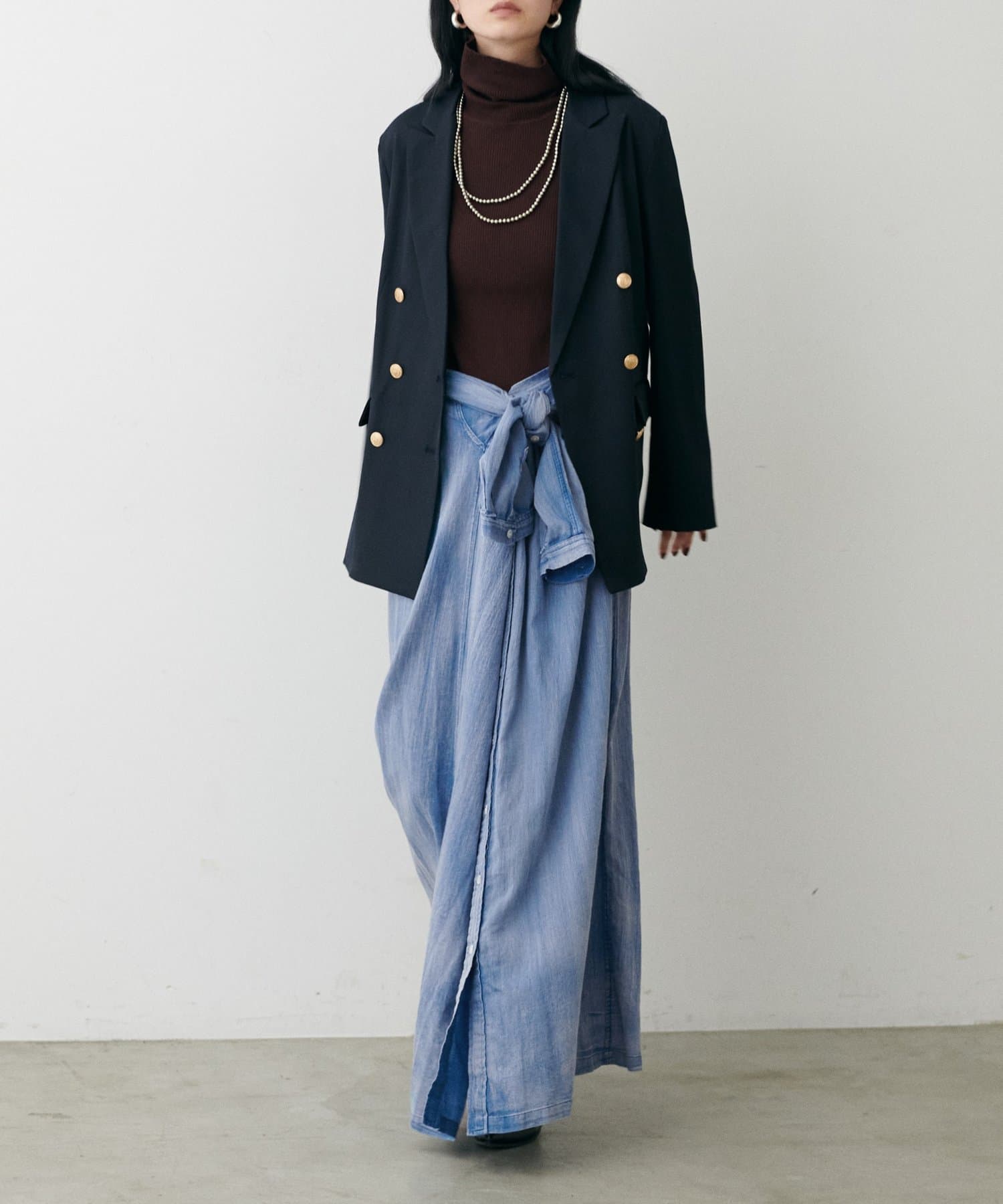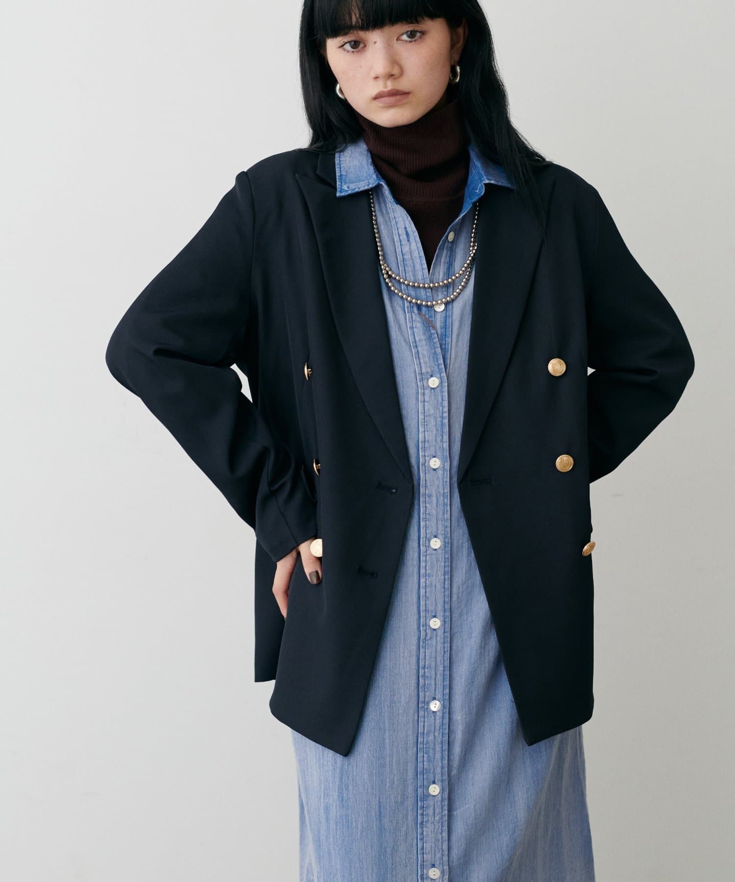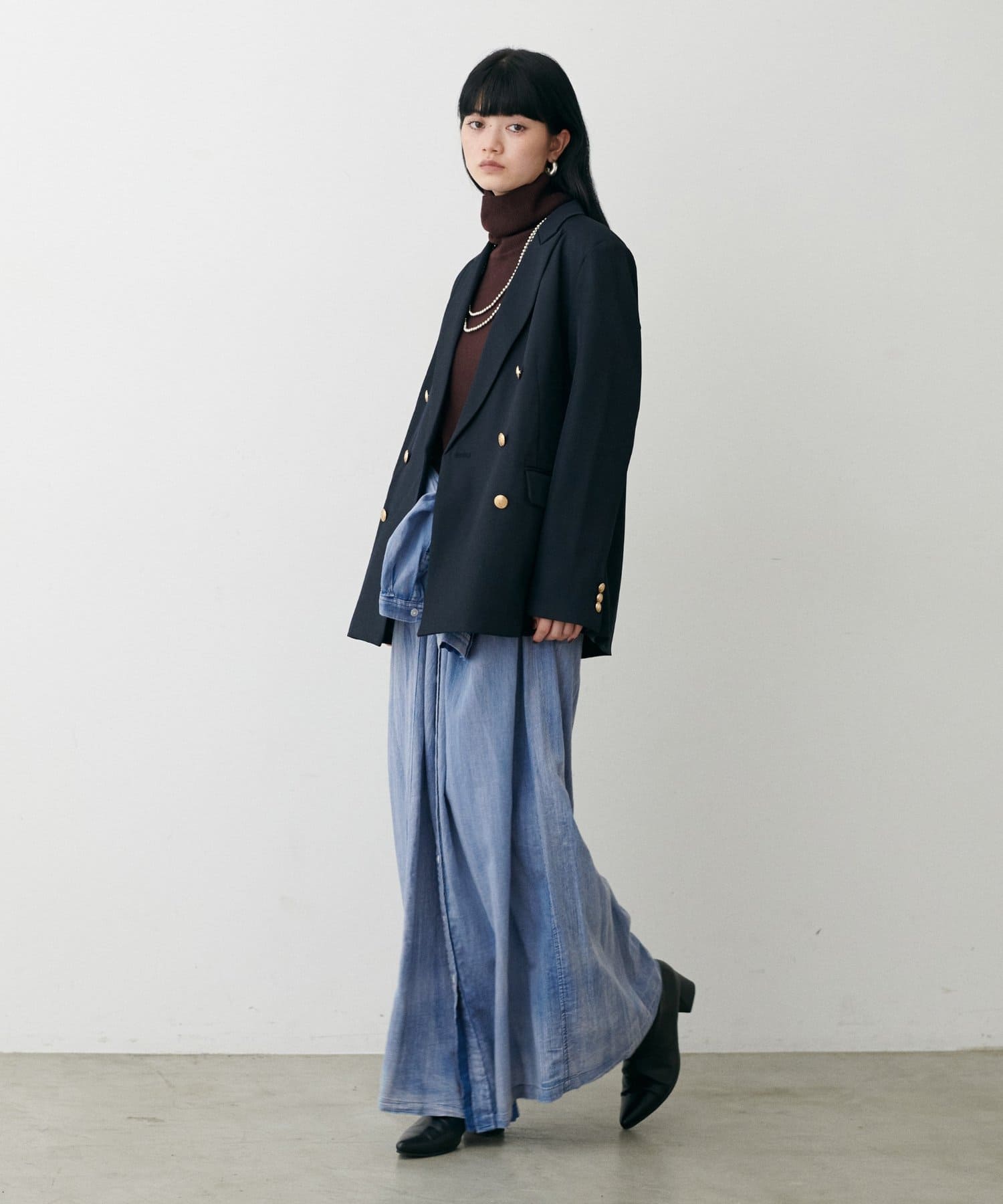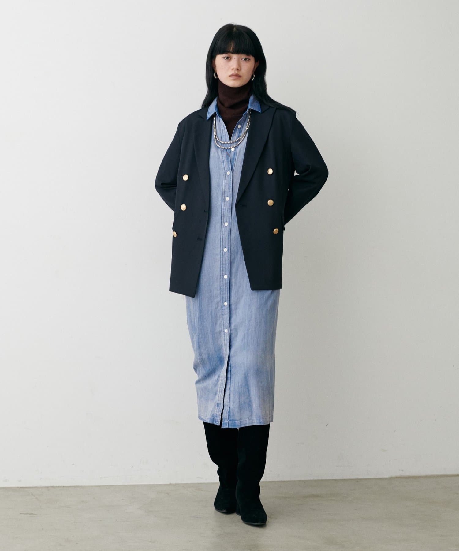 テーラードジャケットやロングブーツなどでクラシカルな着こなしも