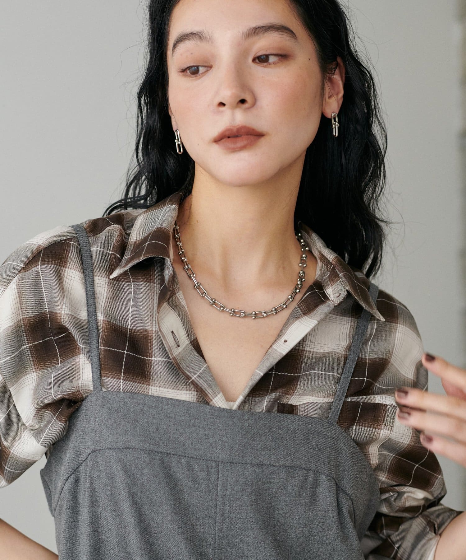 シンプルなシャツやニット、胸元のあいたカーディガンなどと合わせると