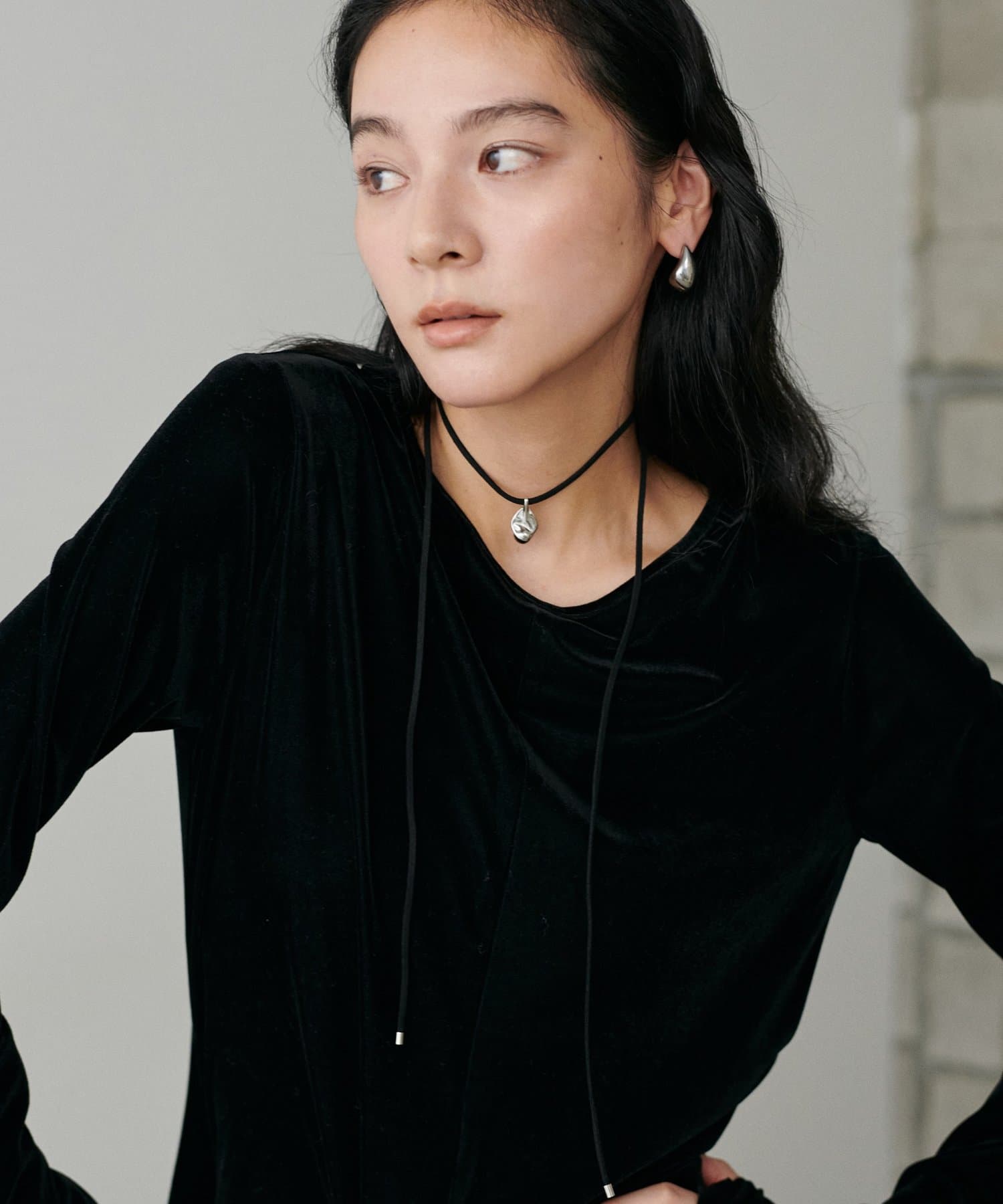 フェイクレザーのストラップは、コードを垂らしたり結んだりと使い方も色々。