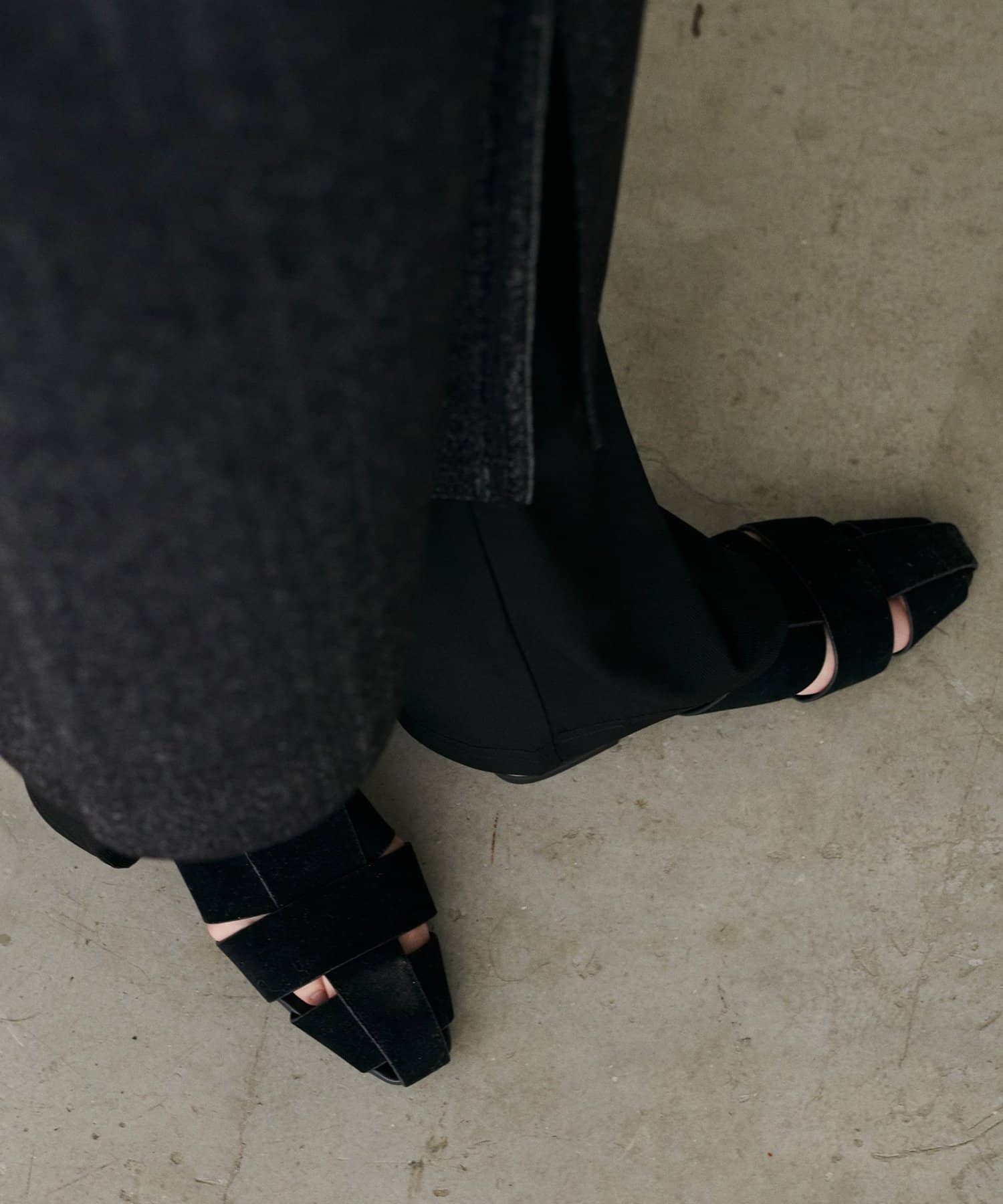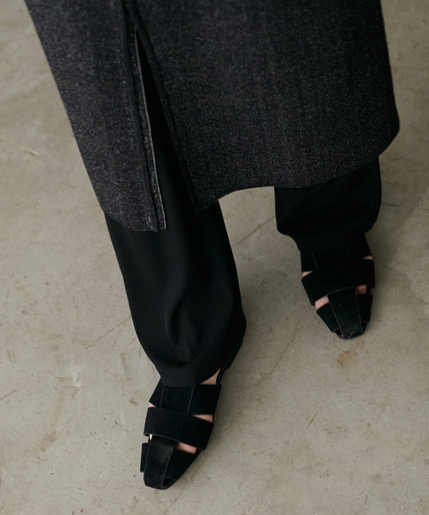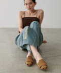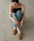 足元から秋の装いを感じさせるスエード調のミュール。