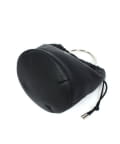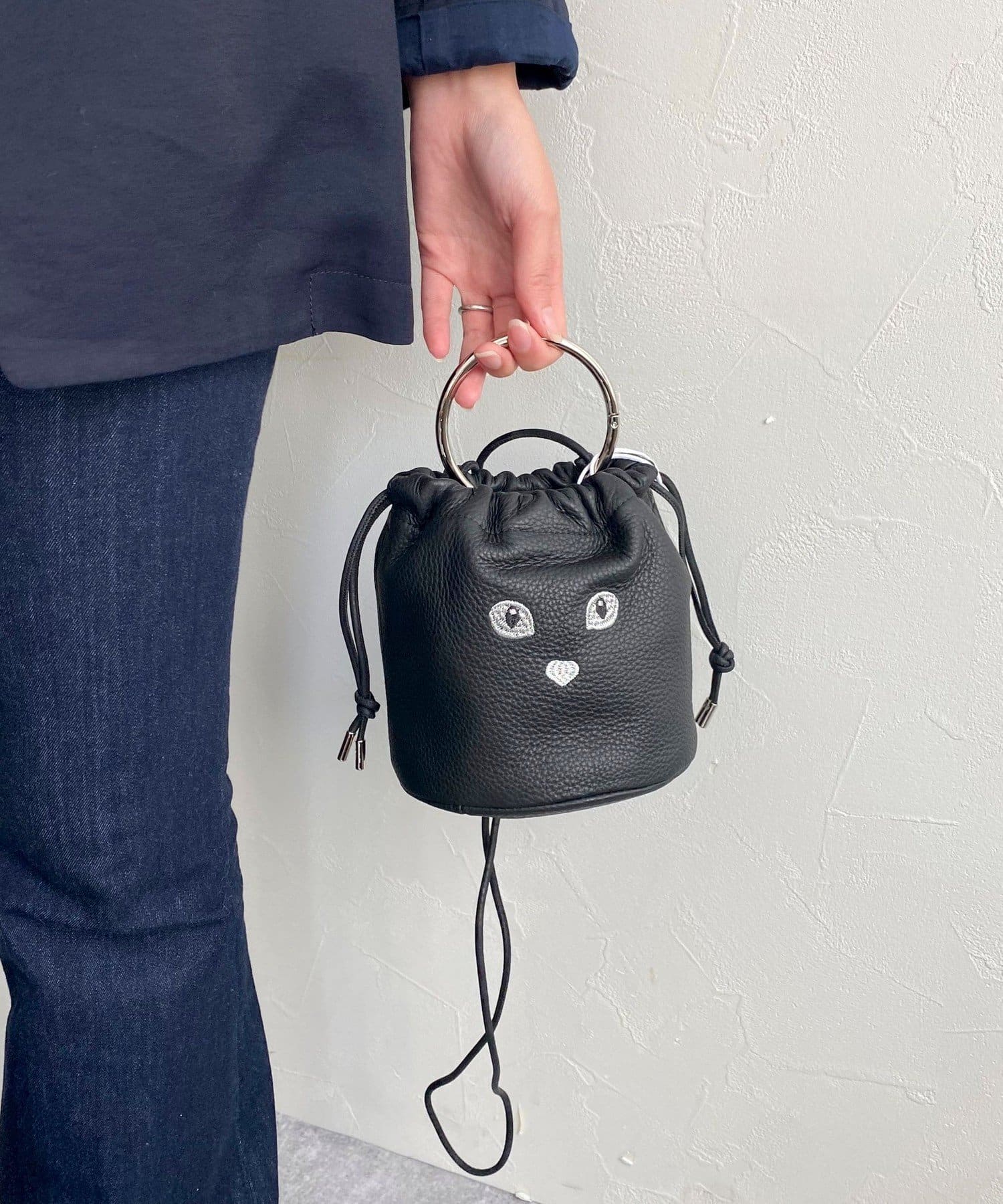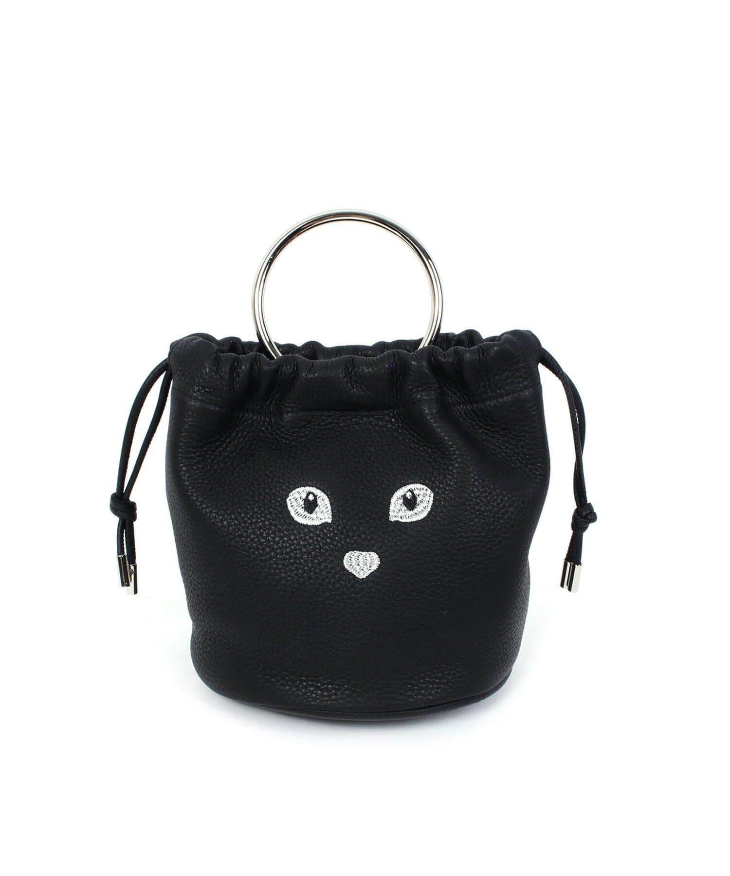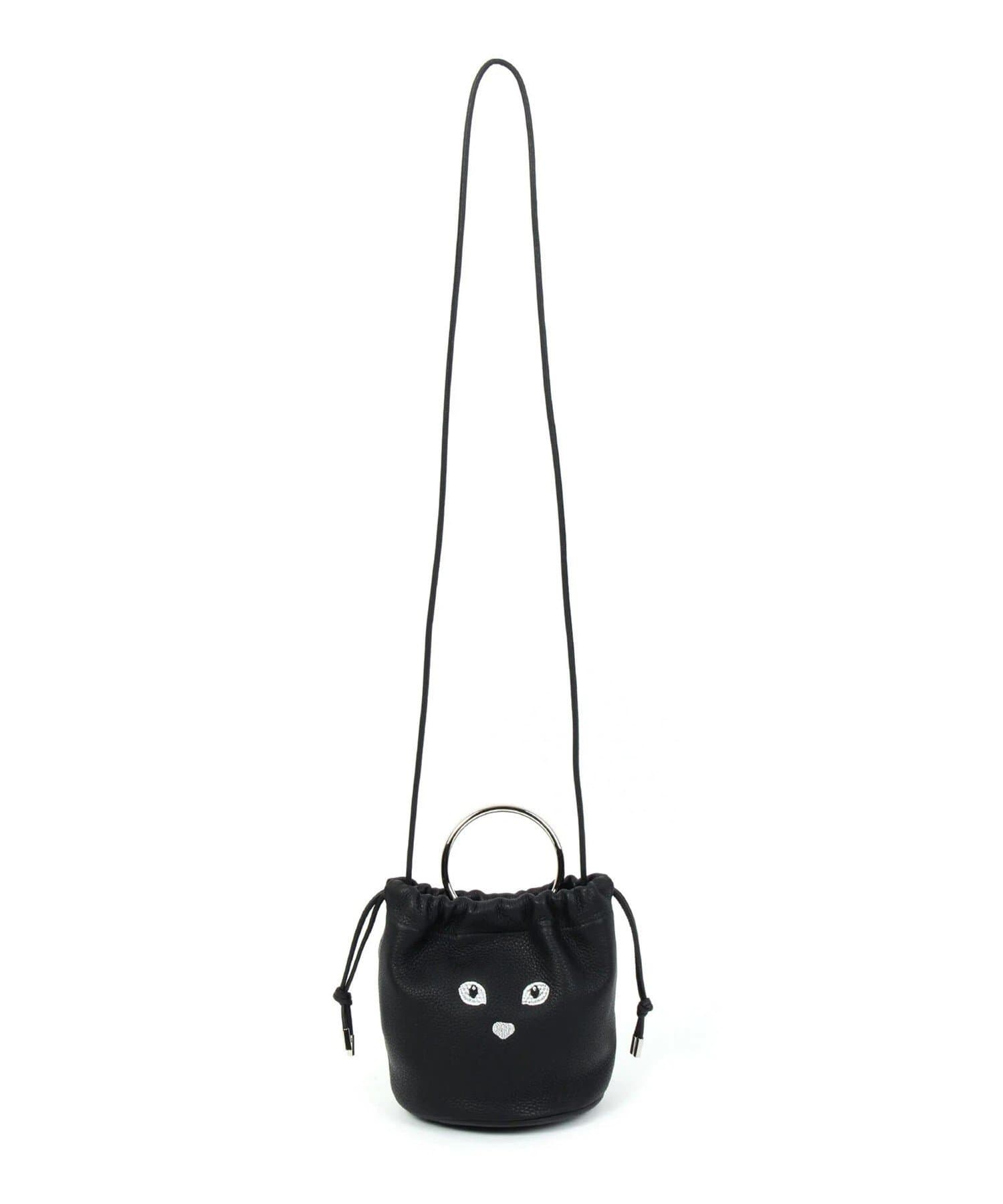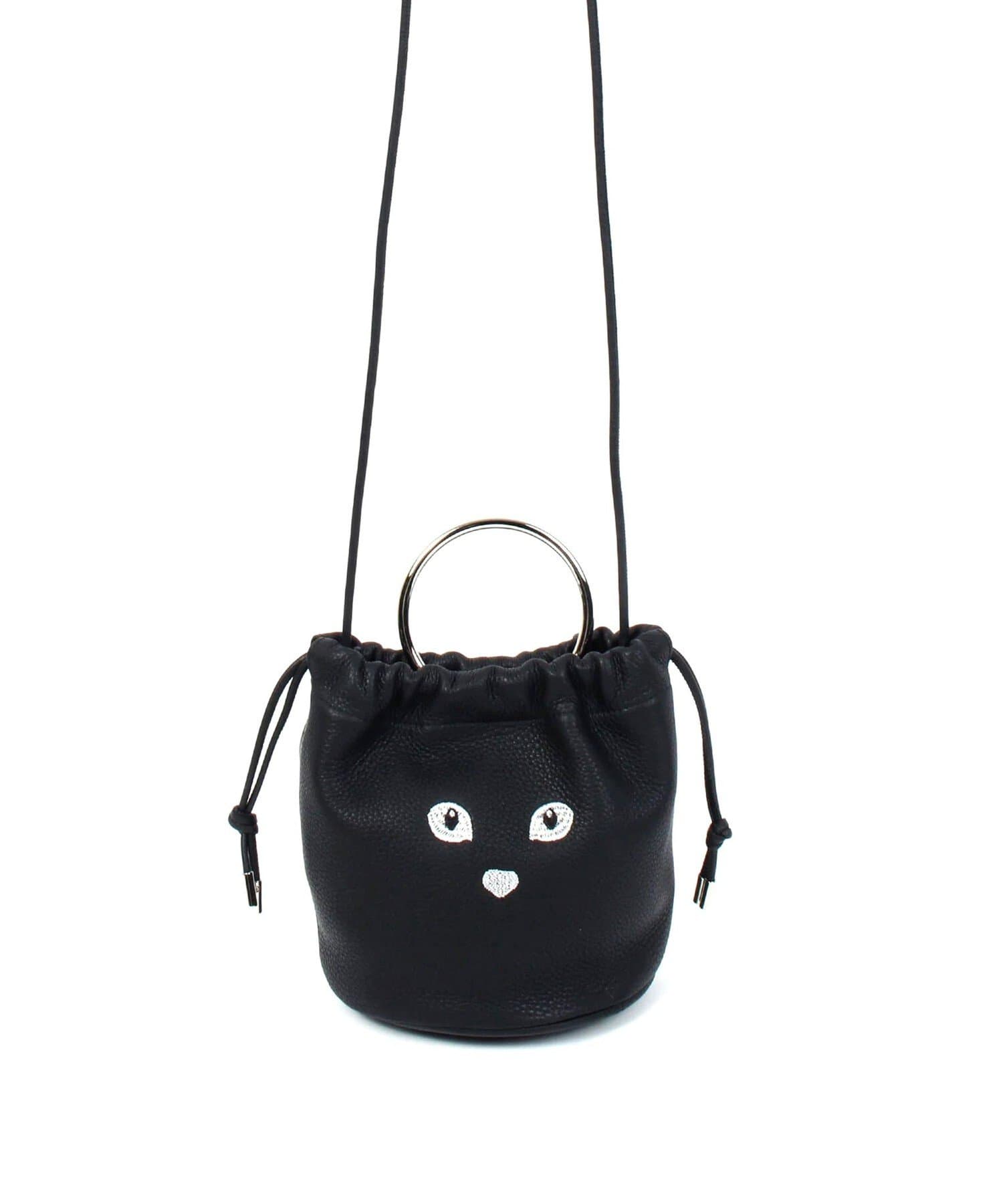 ・COW LEATHERに黒ネコの顔を刺繍した巾着ショルダーバッグ