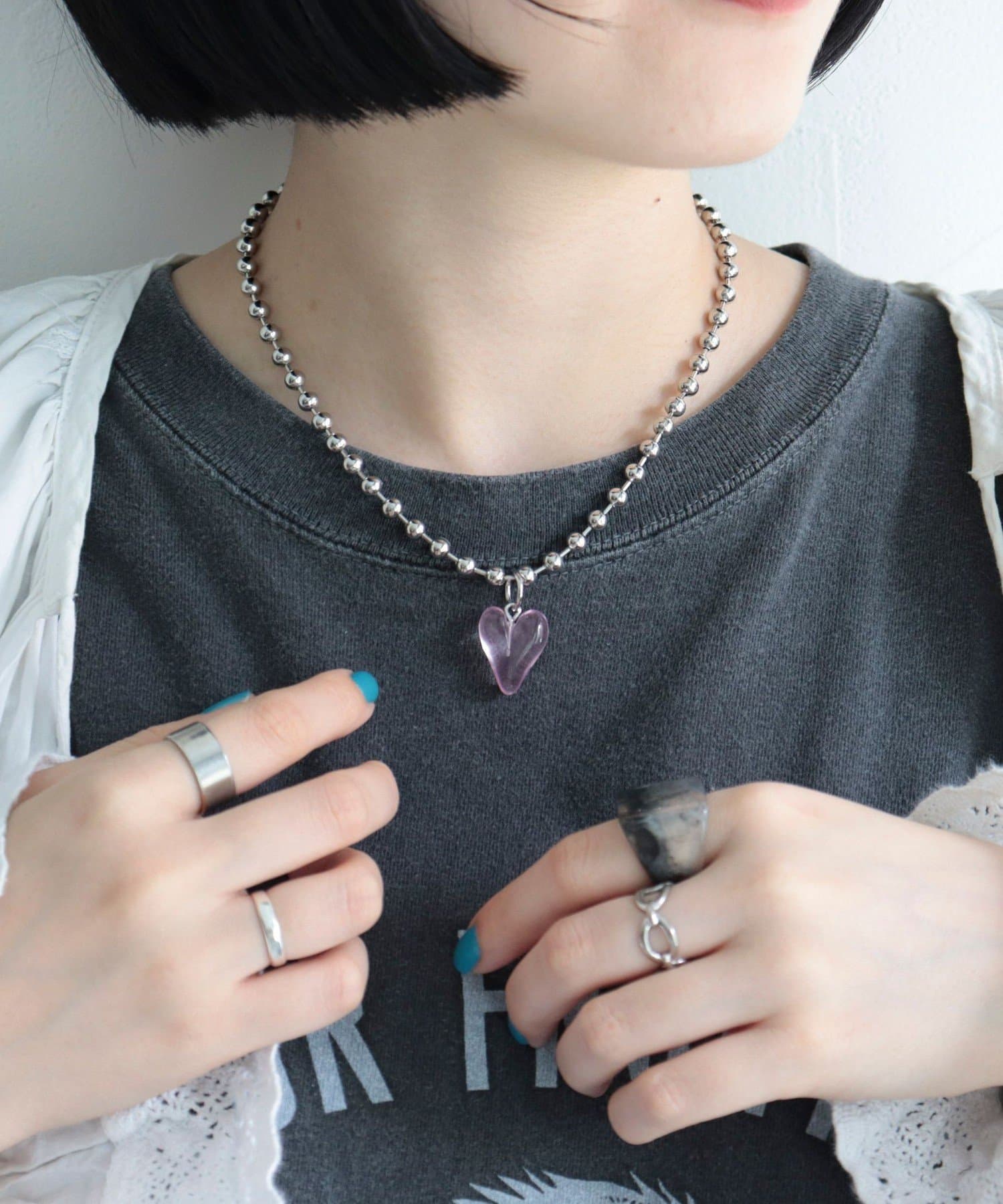 ・トップのハートモチーフと大きめのボールチェーンが存在感を放つネックレス