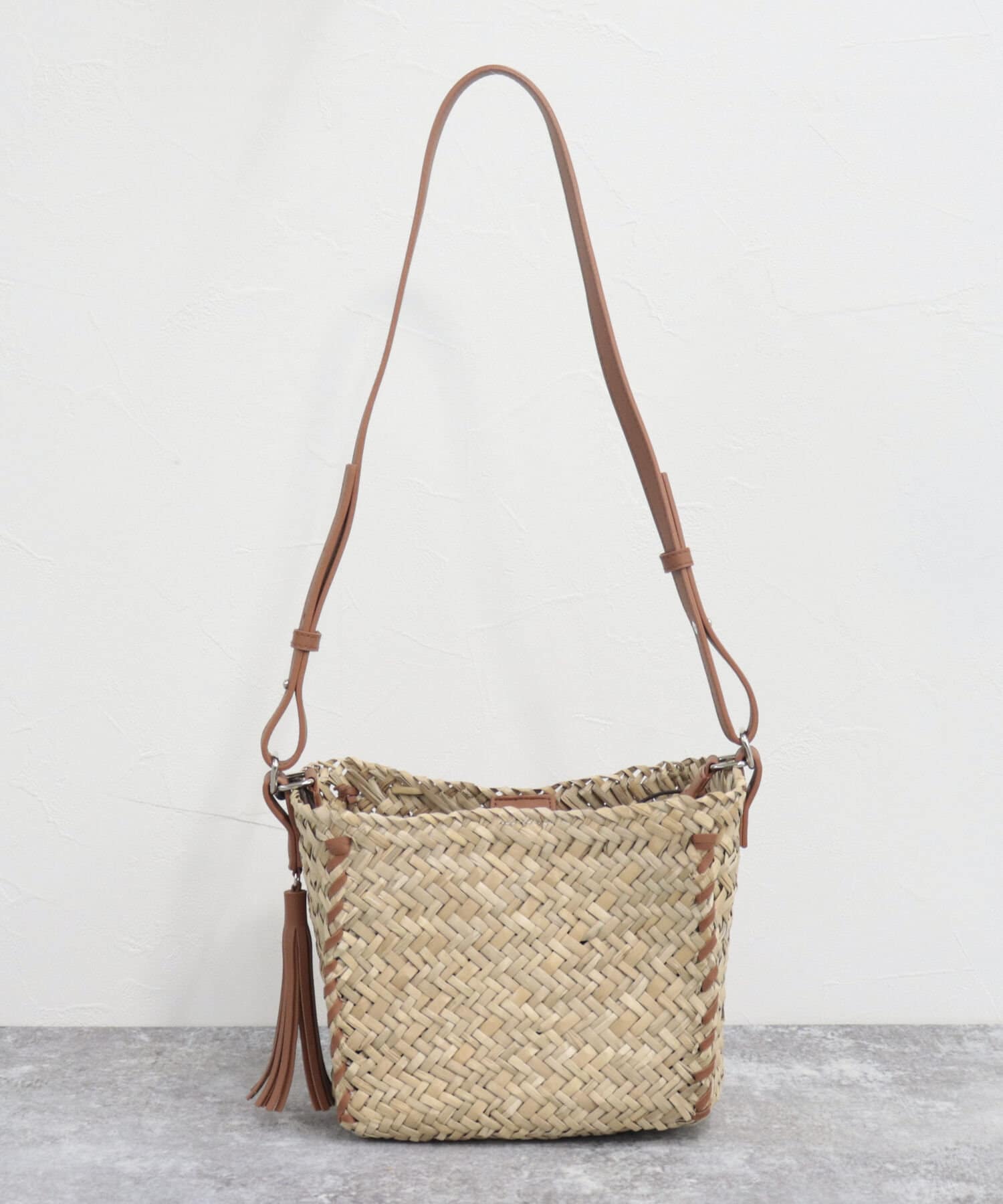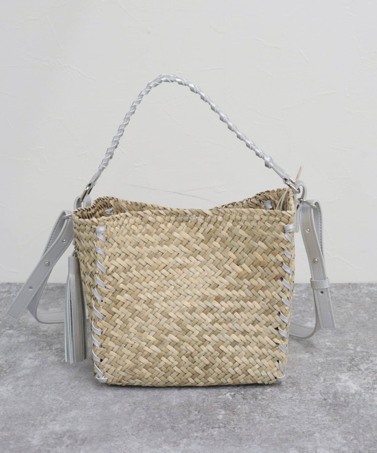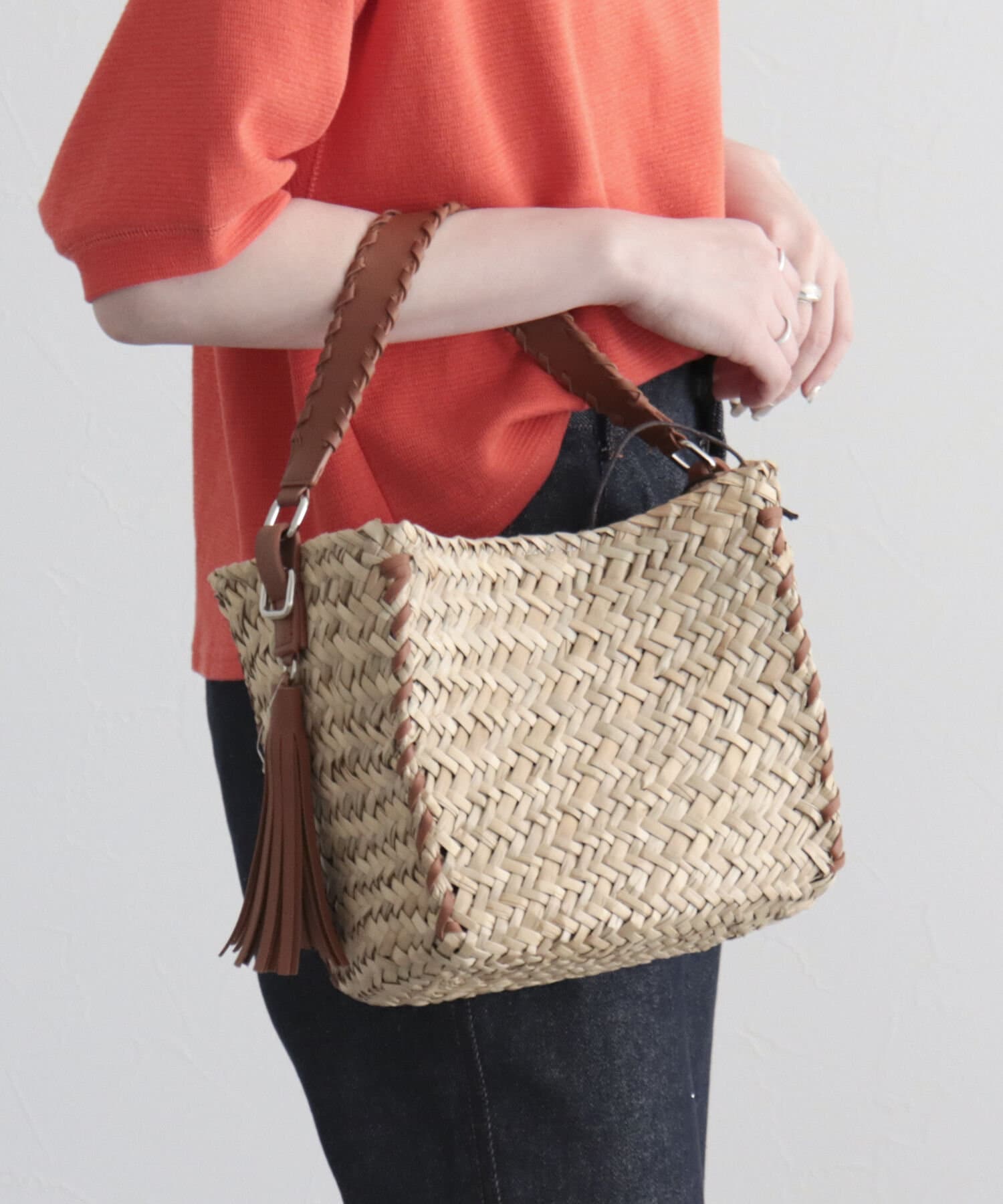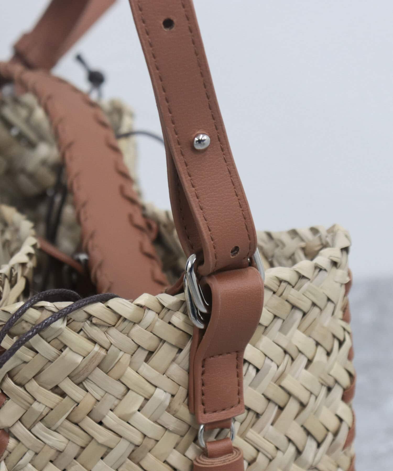 ・持ち手やショルダーにレザーを使用しており、ナチュラルさにプラスして締まった印象の1点
