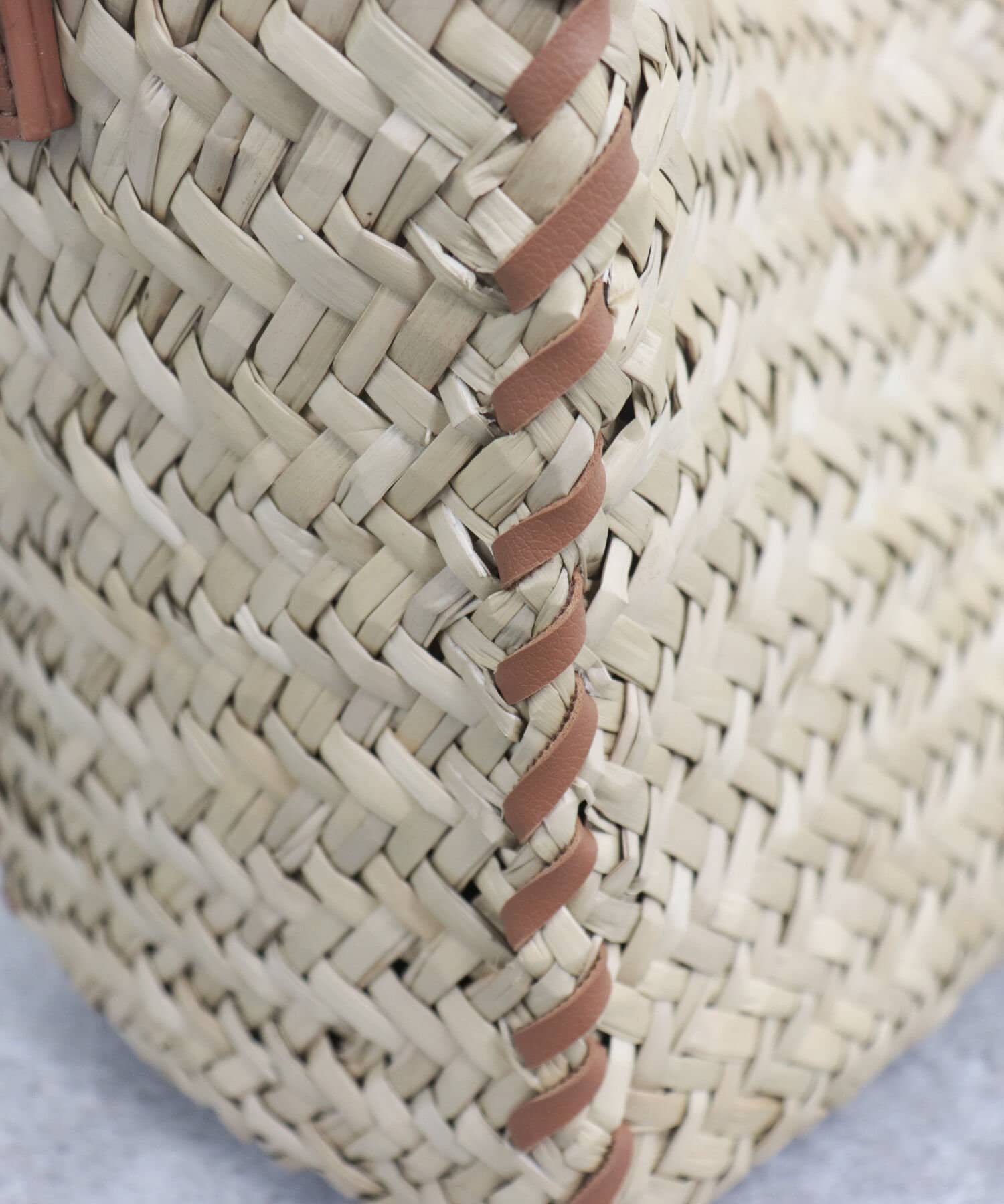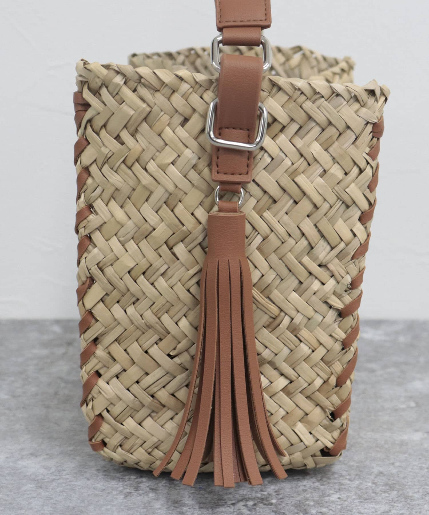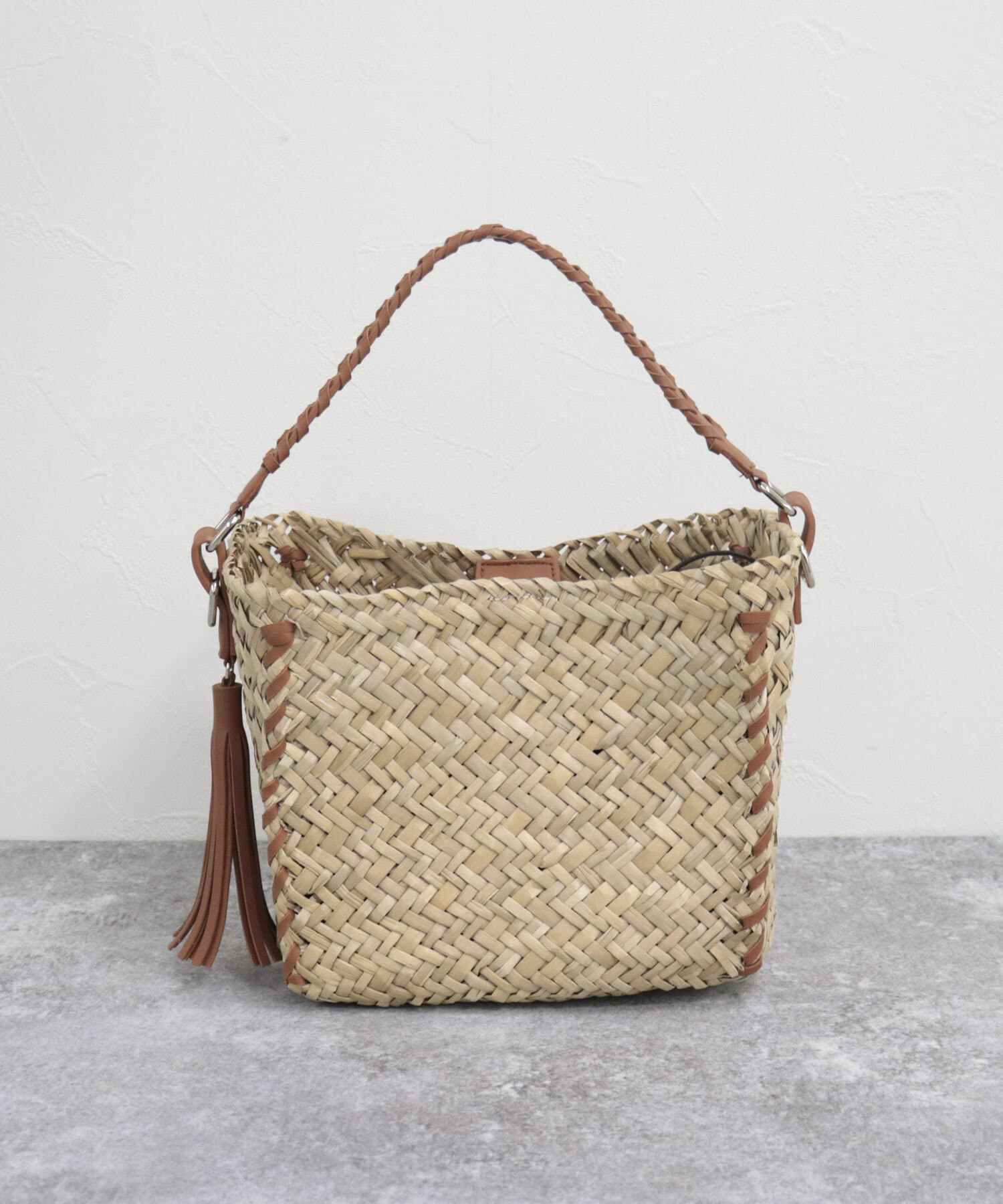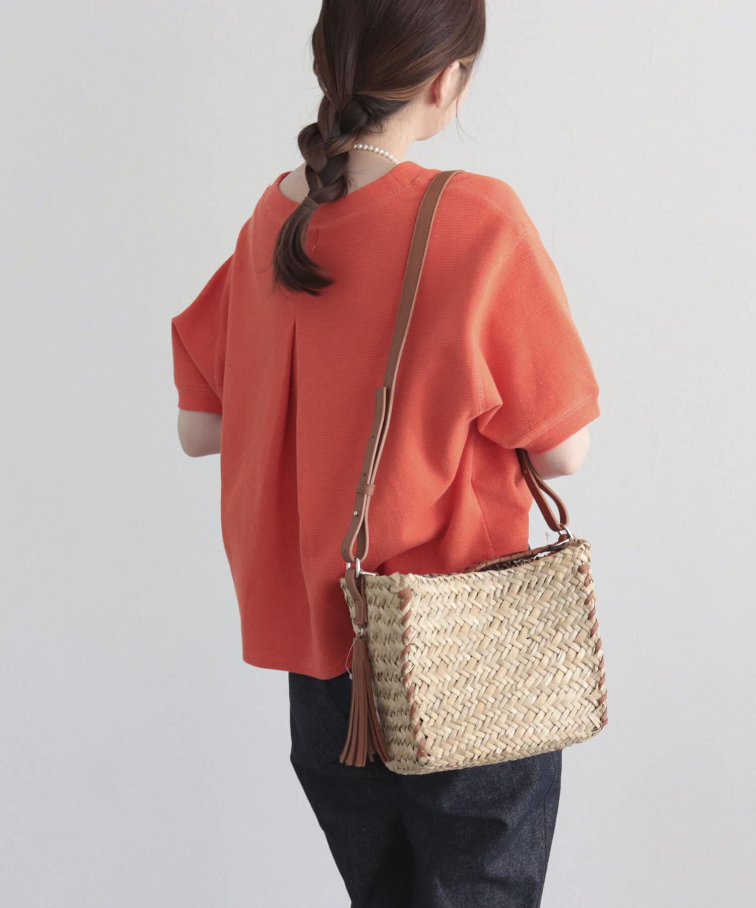 ・持ち手やショルダーにレザーを使用しており、ナチュラルさにプラスして締まった印象の1点