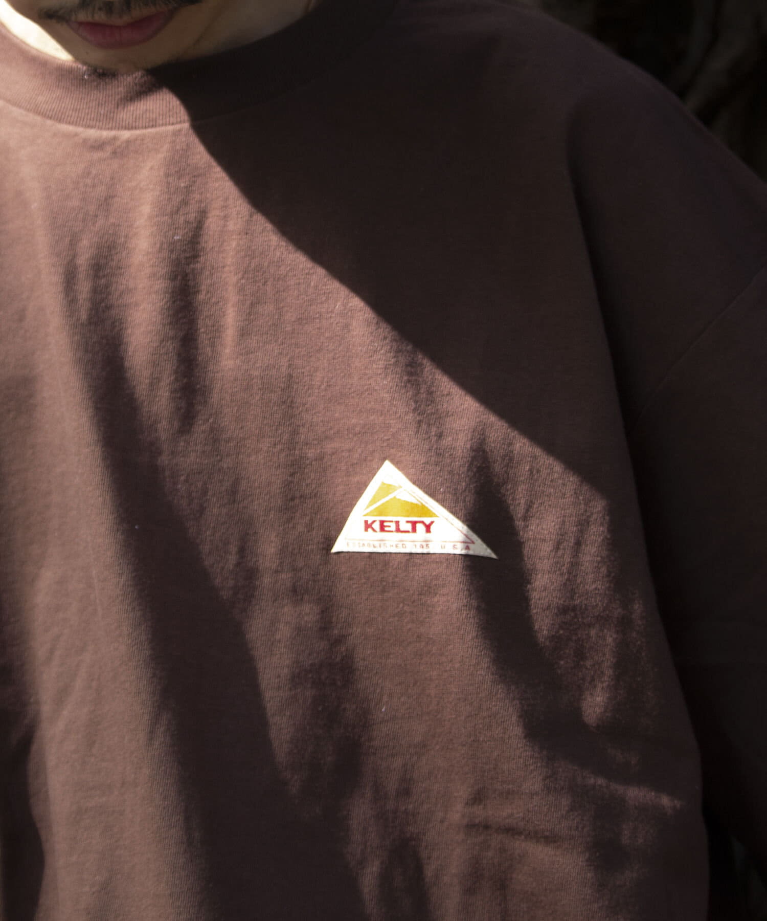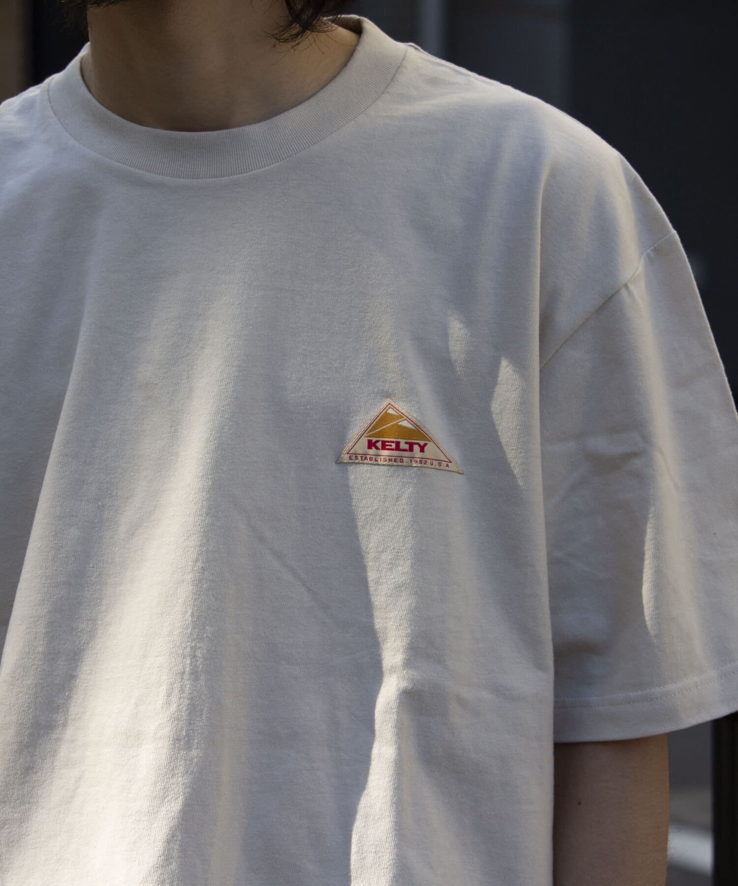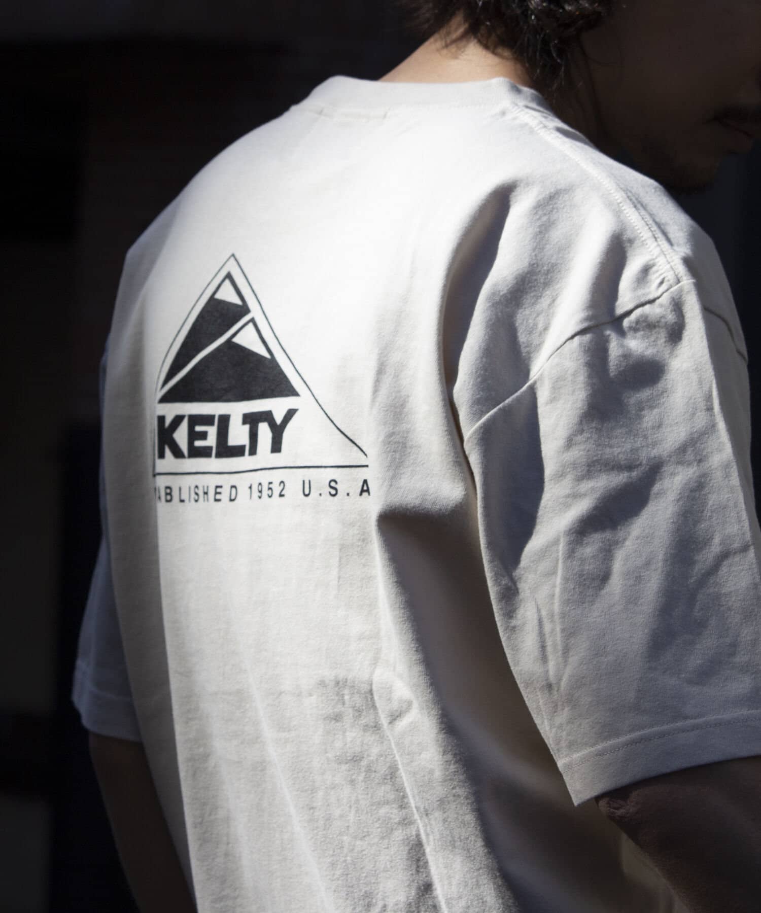 目を惹くKELTYらしいアウトドアモチーフのバックプリントロゴ、フロントはシンプルにクラシックロゴのワンポイントのデザイン。