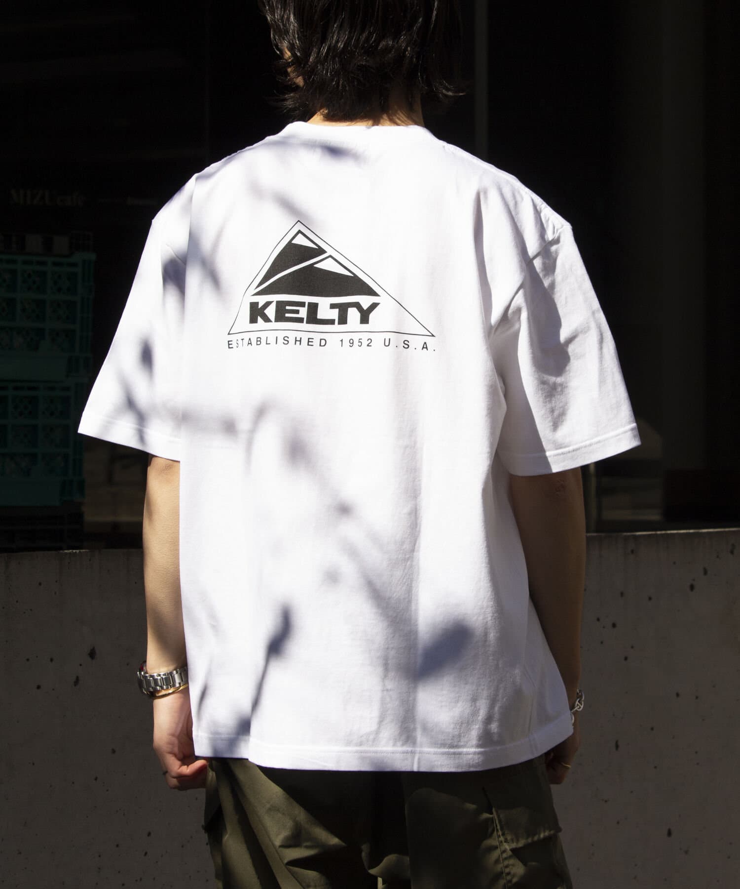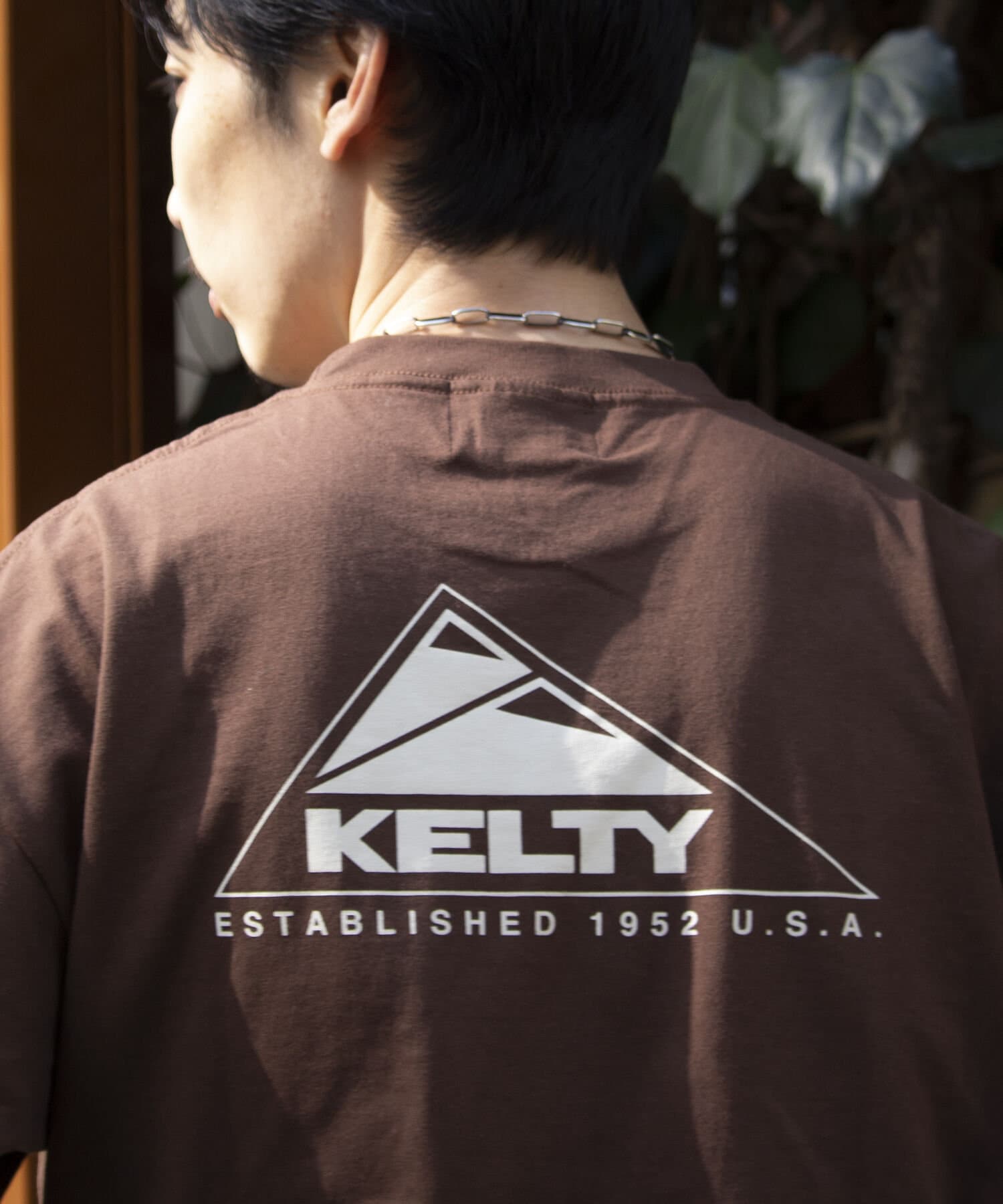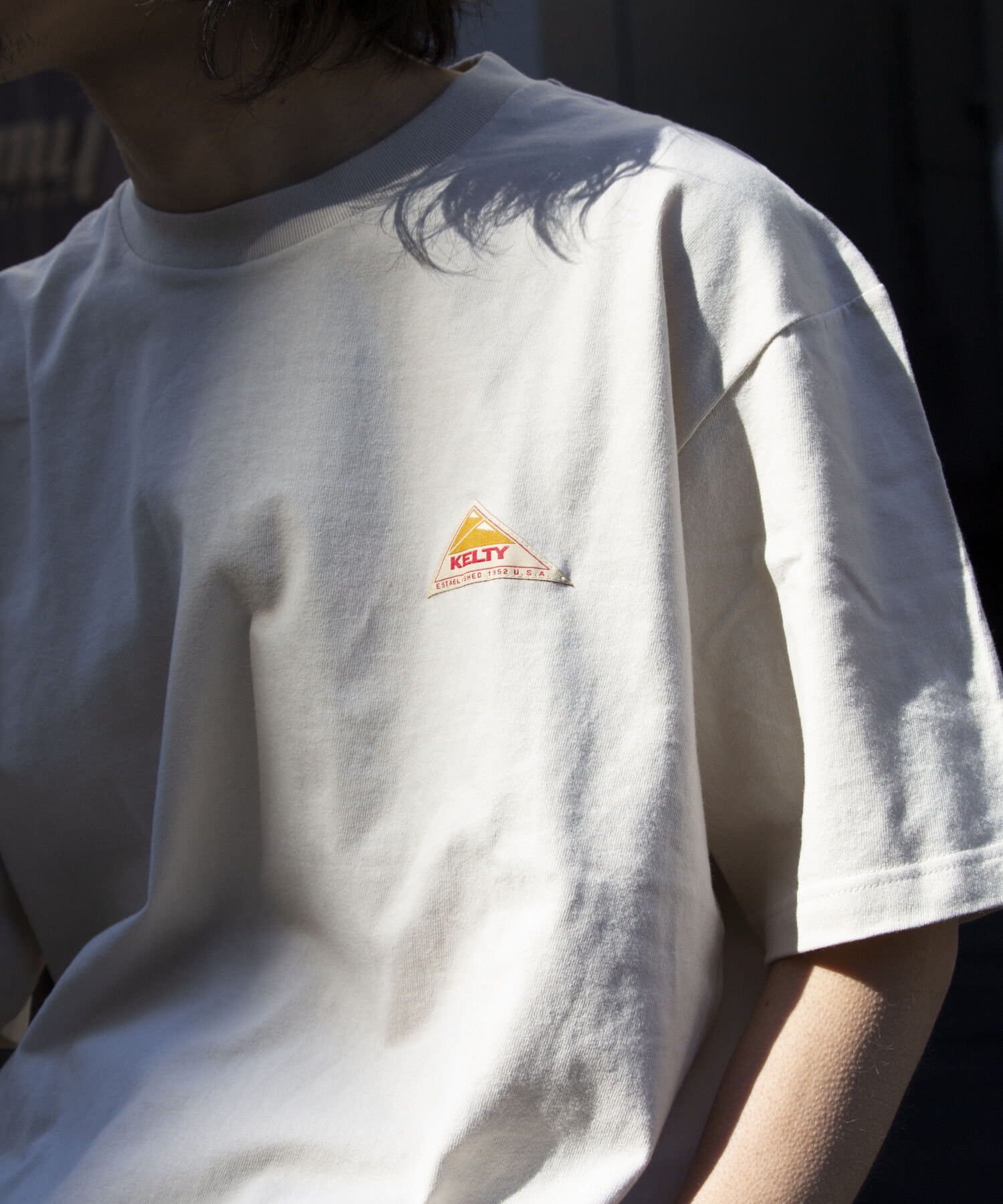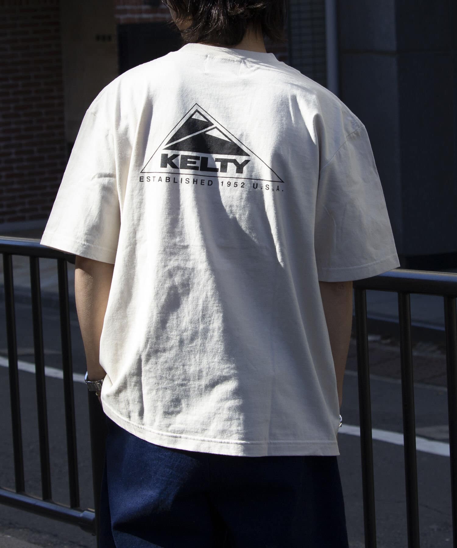 目を惹くKELTYらしいアウトドアモチーフのバックプリントロゴ、フロントはシンプルにクラシックロゴのワンポイントのデザイン。
