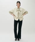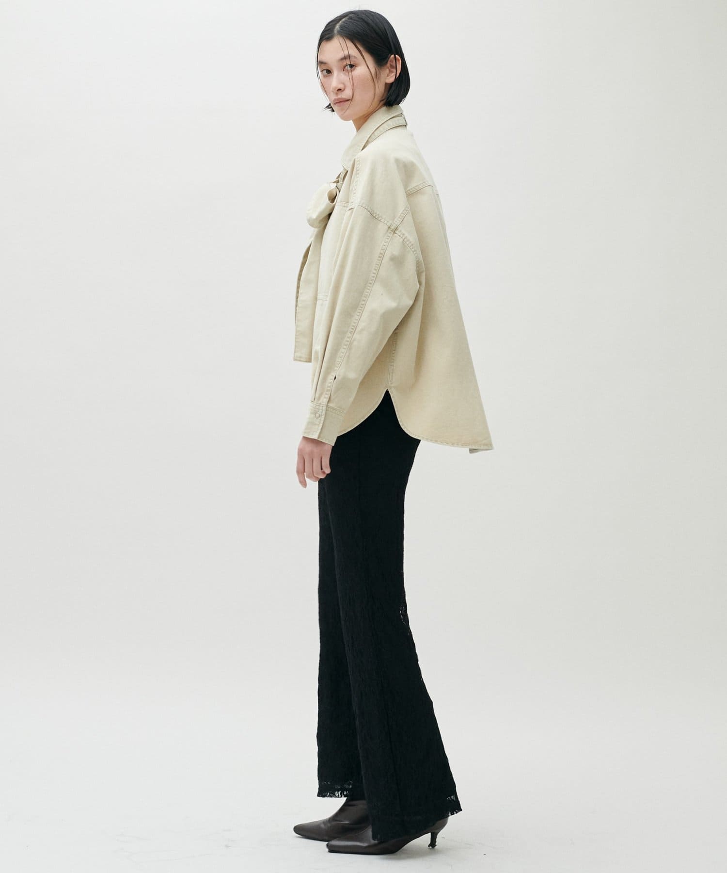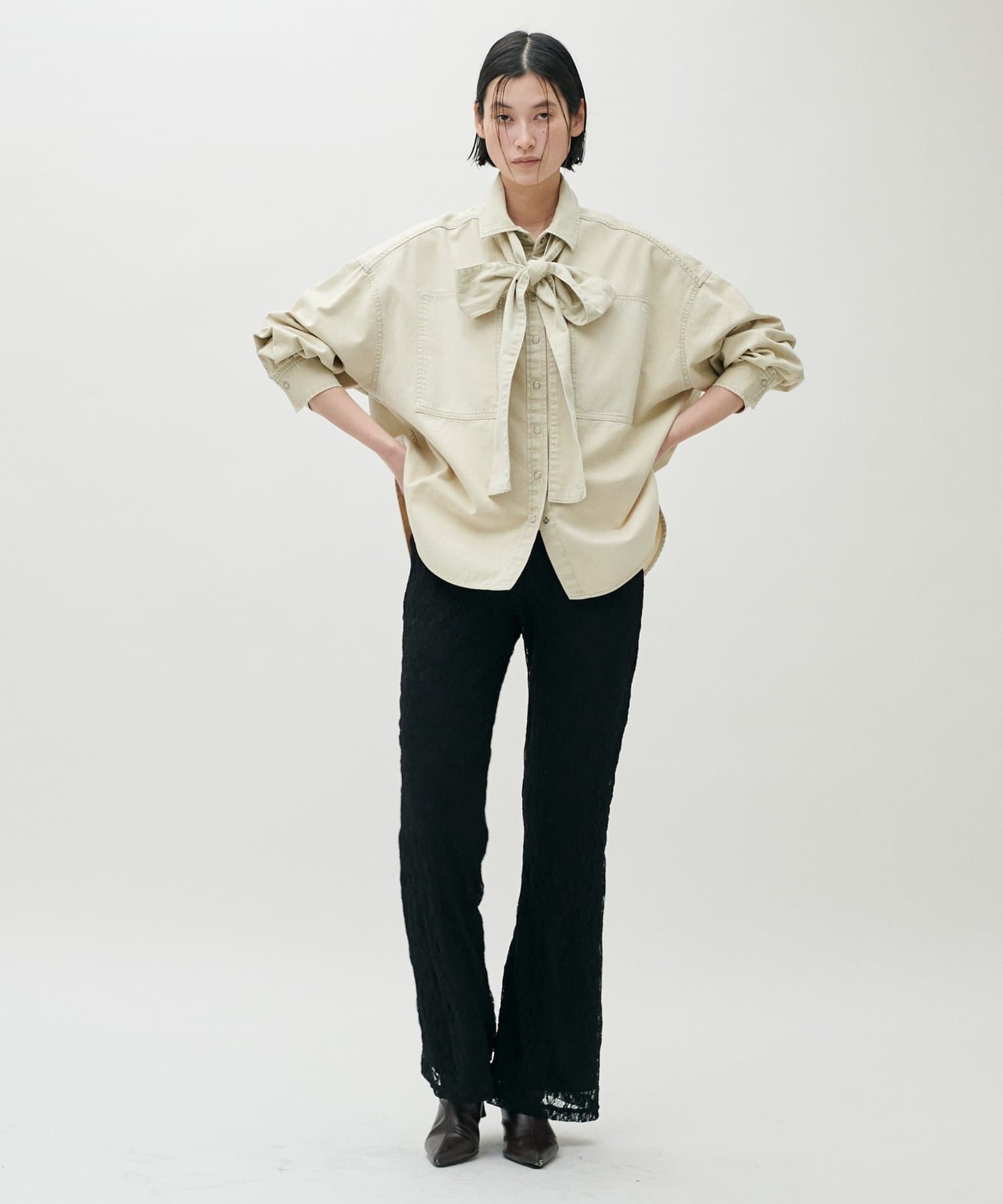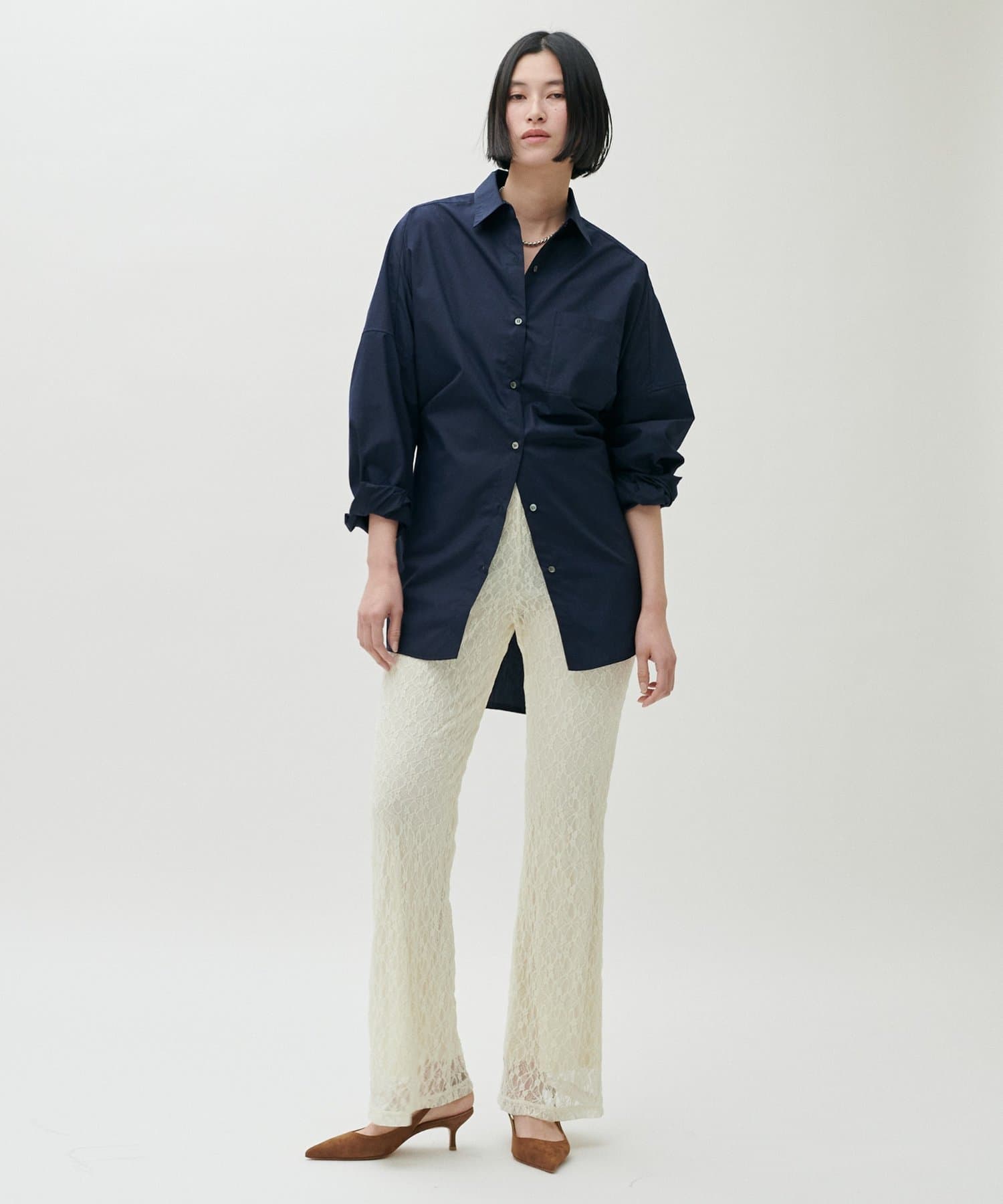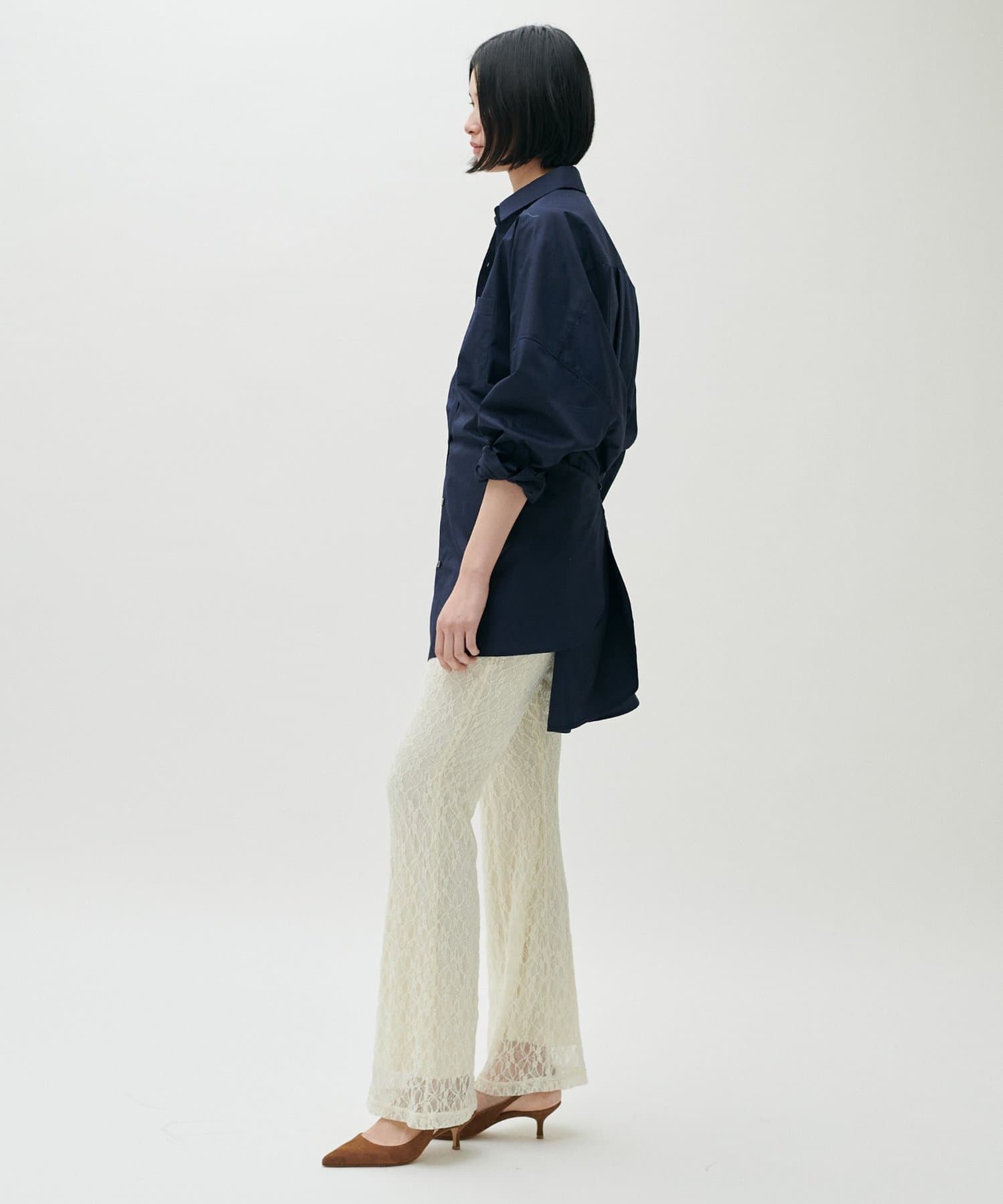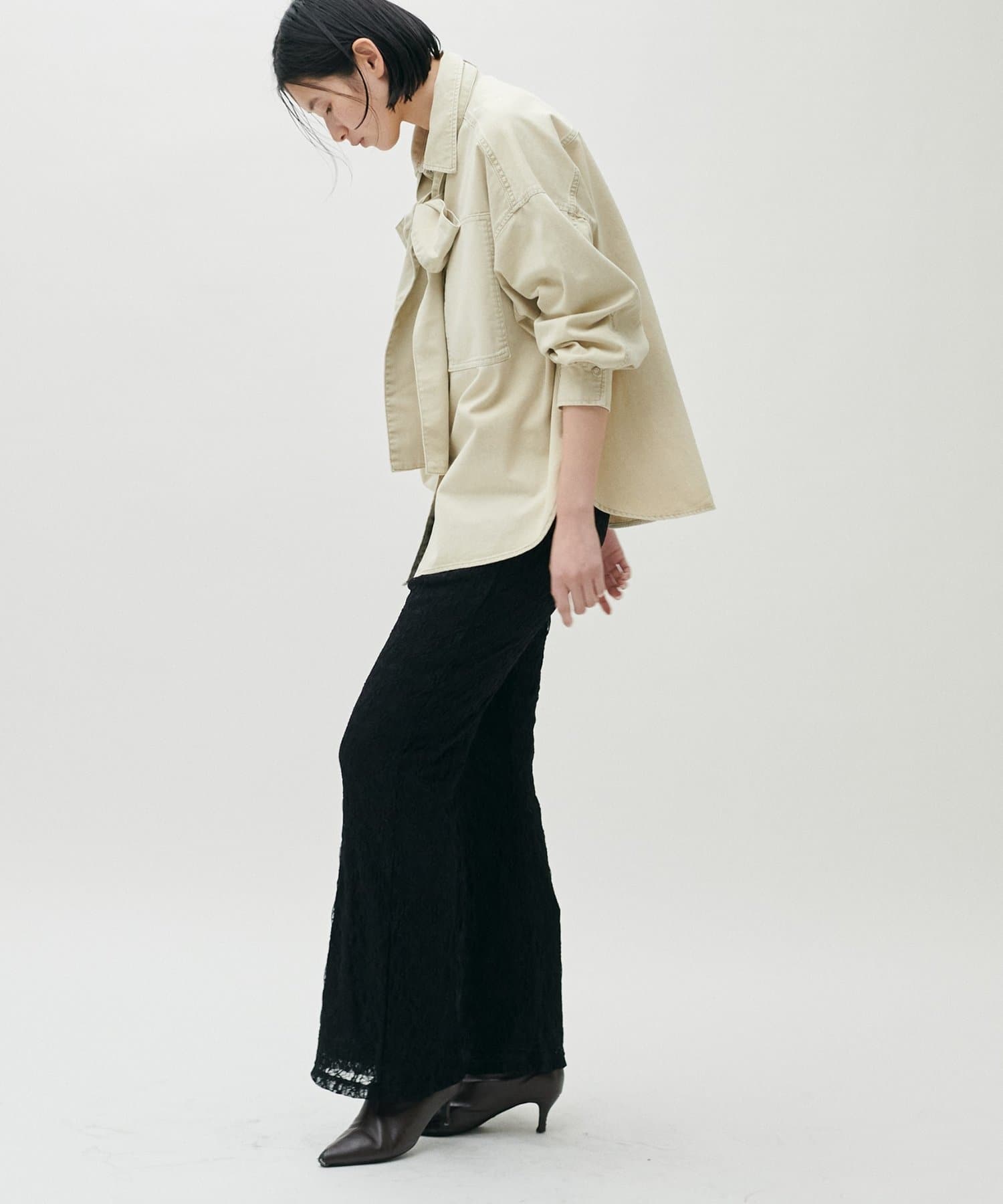 シャツやジャケットなど、ハンサムなアイテムと合わせることで、レースの表情が引き立つ大人なスタイリングに。