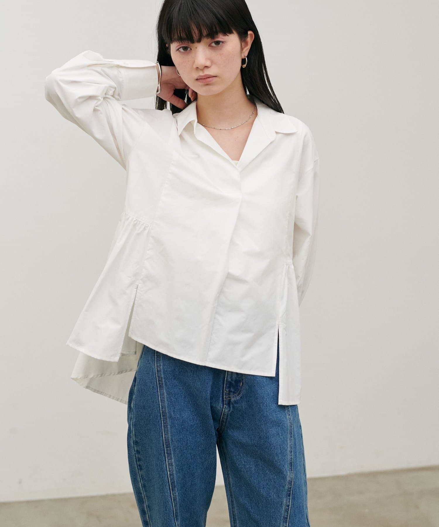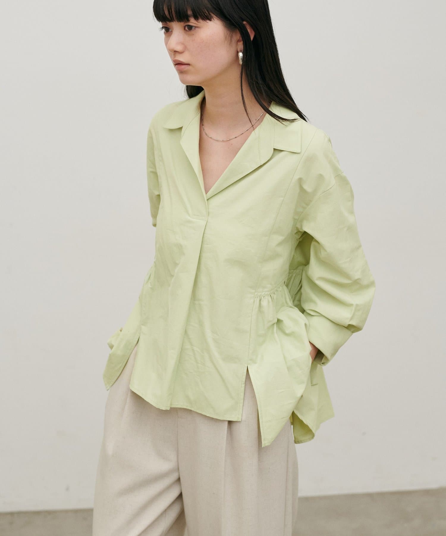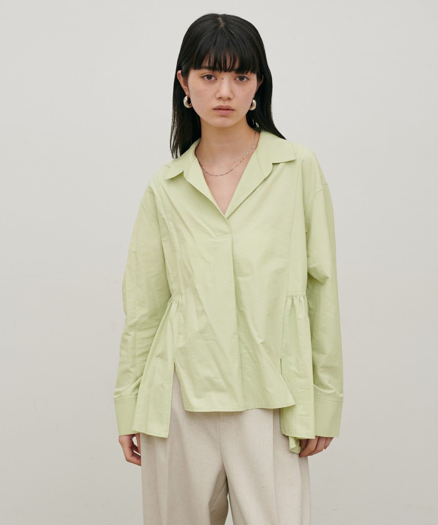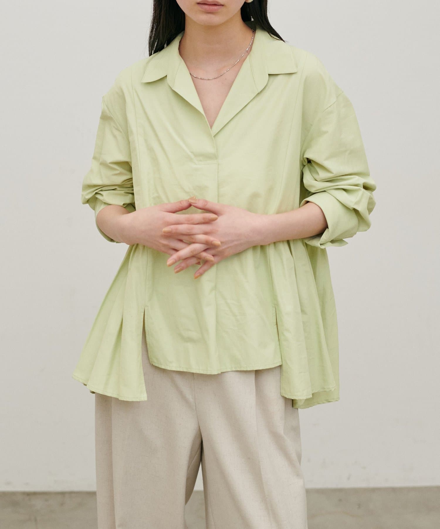 首元はすっきりの開襟に、身体のラインを拾わないゆとりのあるサイジング。