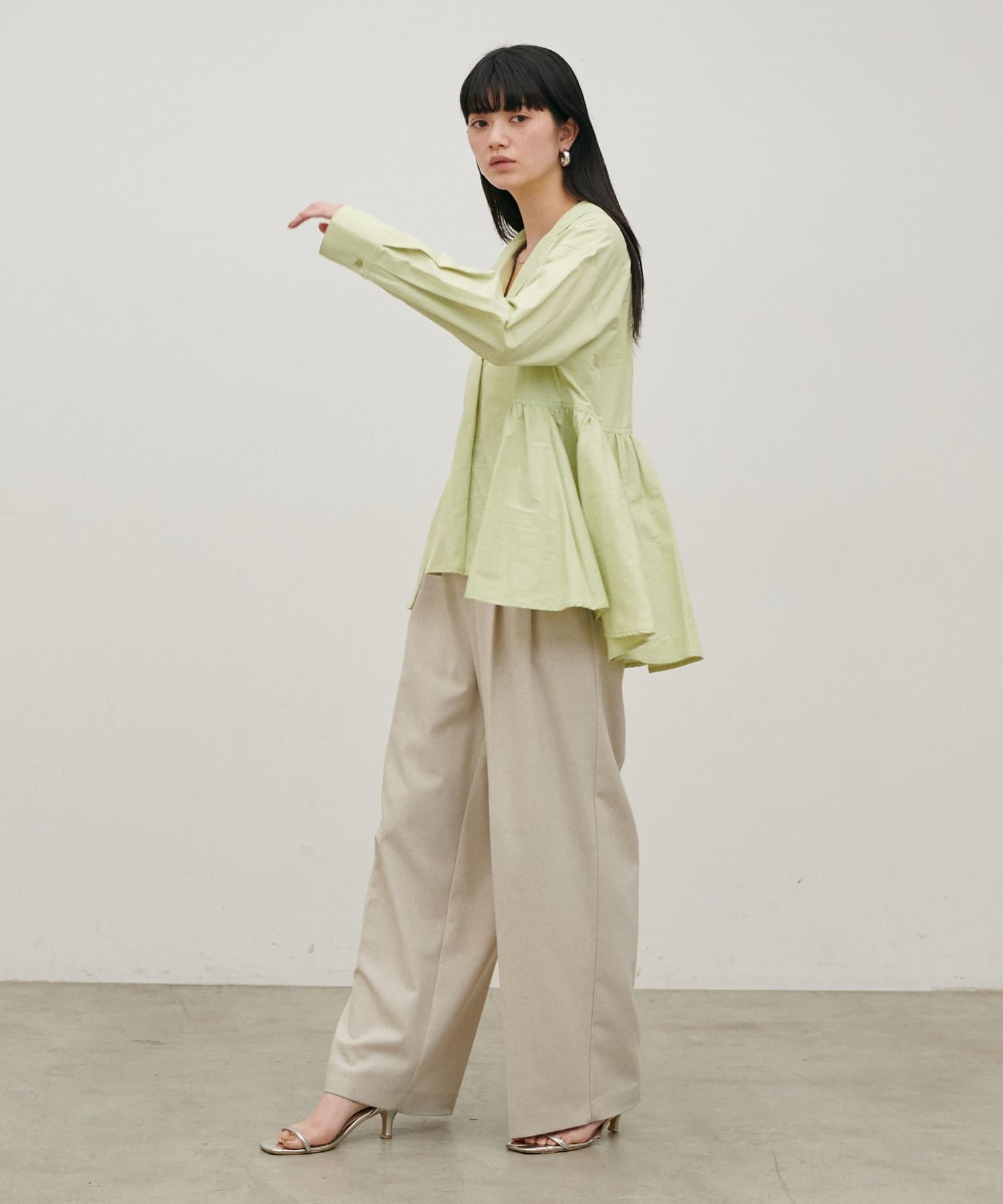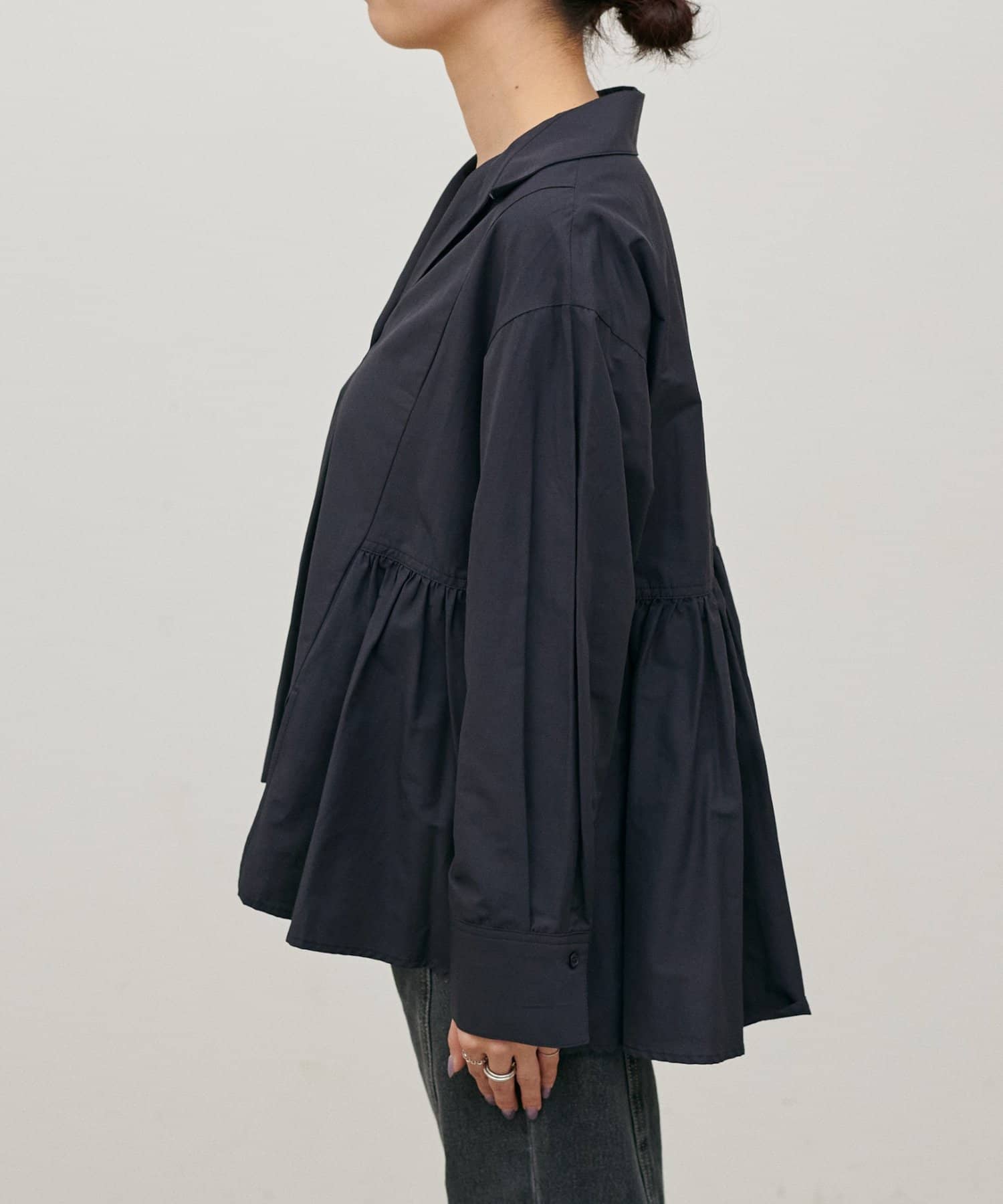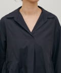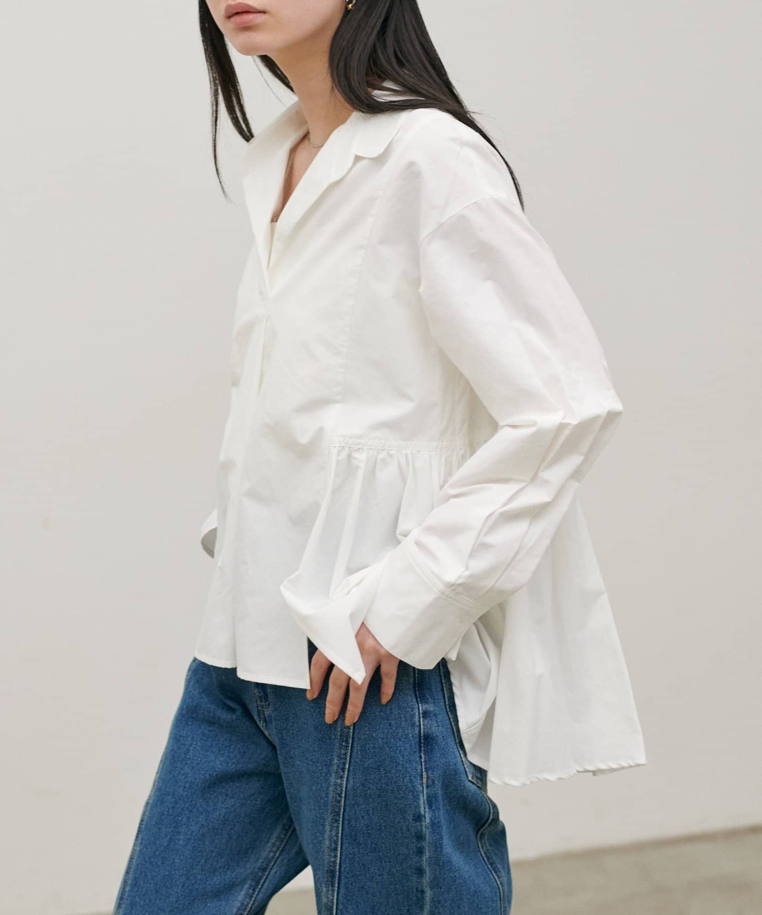 首元はすっきりの開襟に、身体のラインを拾わないゆとりのあるサイジング。