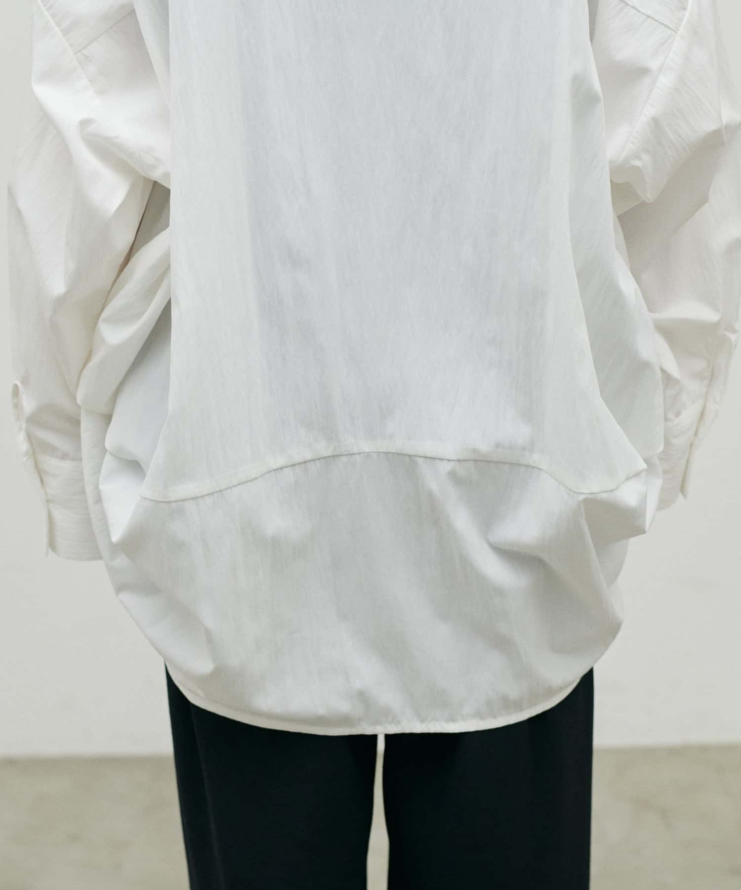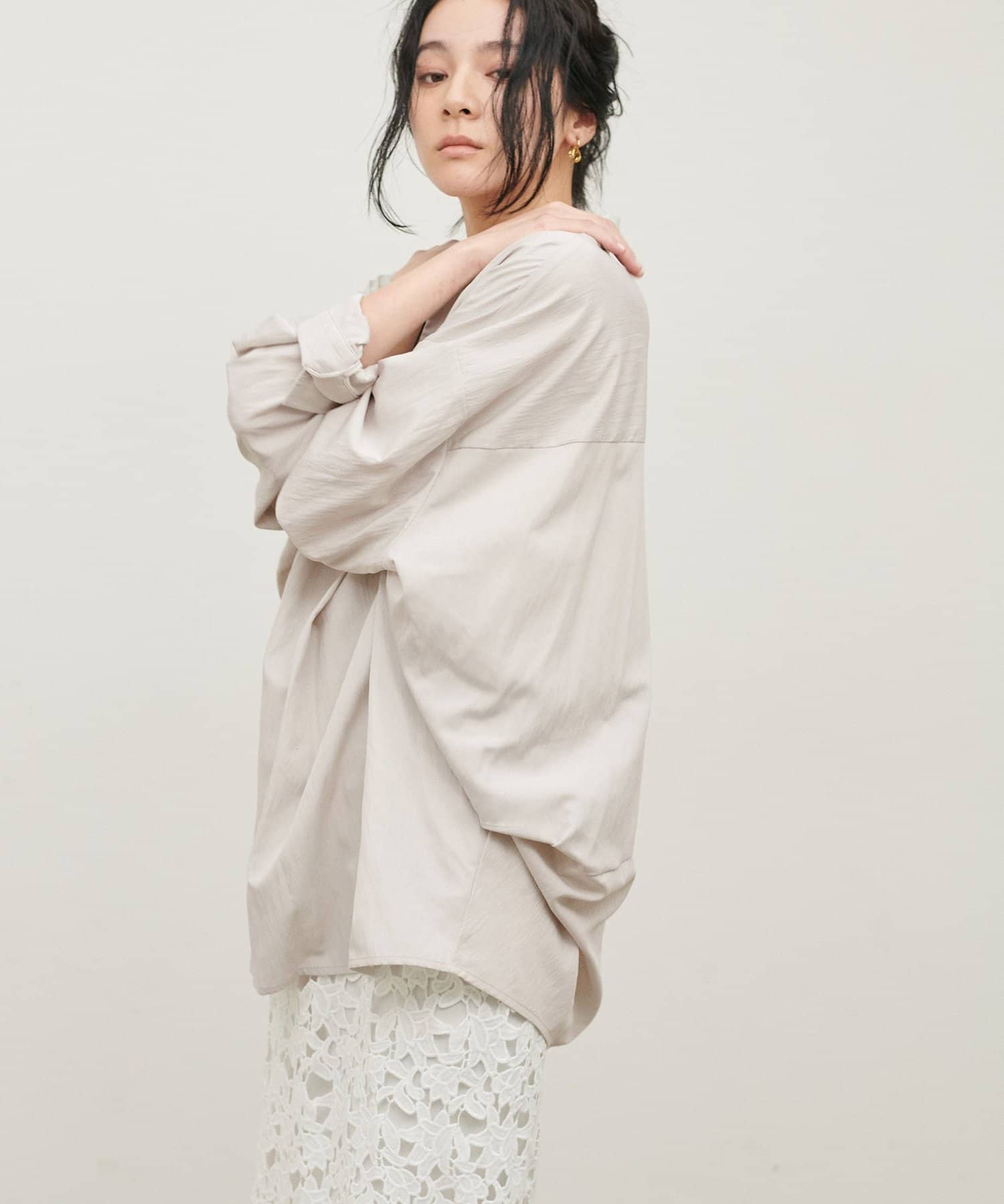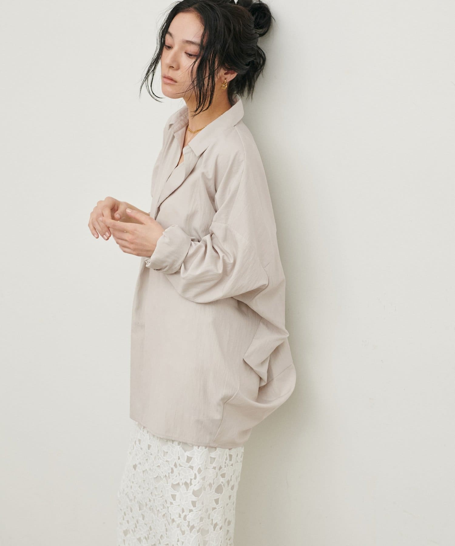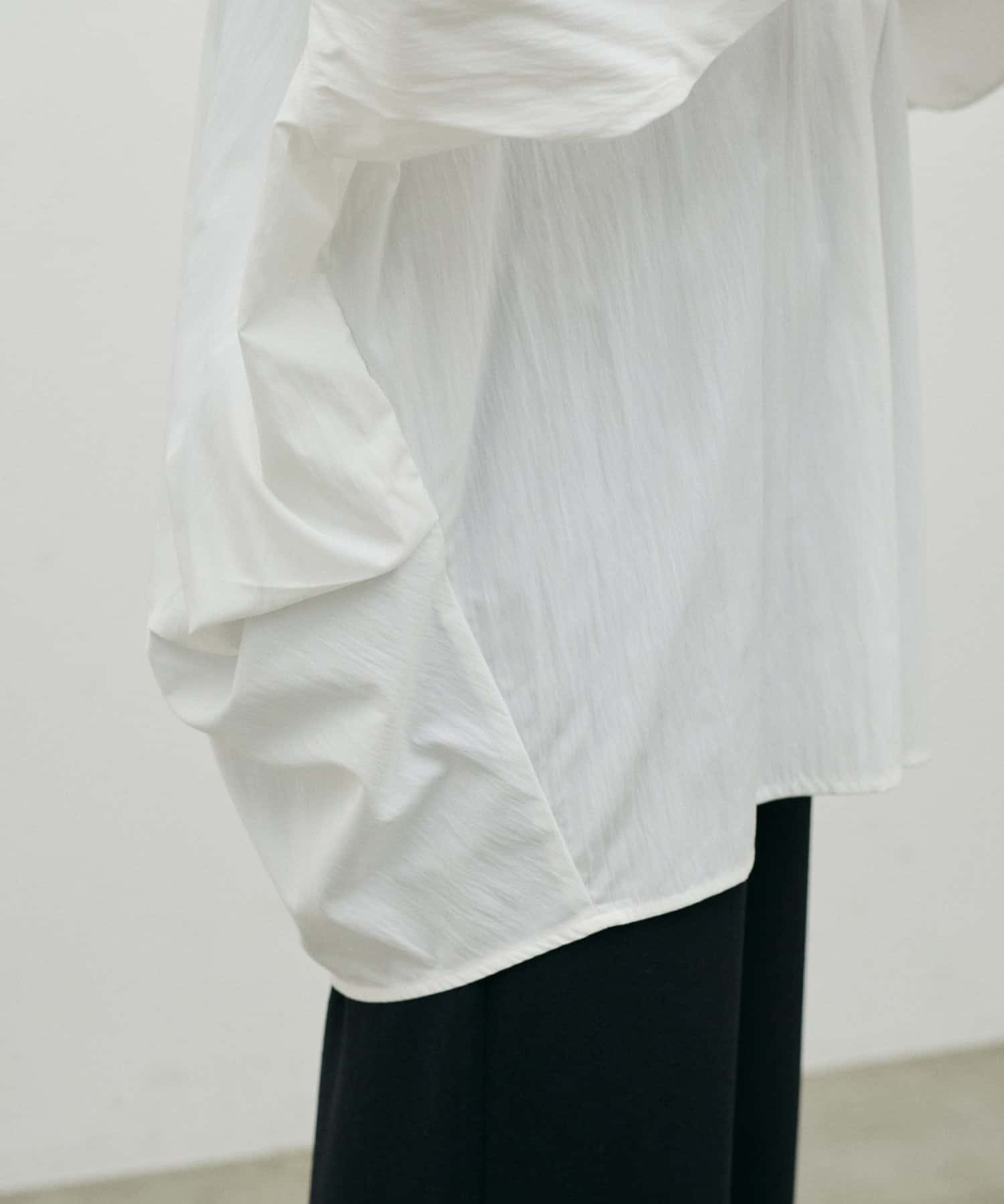 ゆったりとしたオーバーサイズで、脇線後ろのタックにより立体的なコクーンシルエットに。