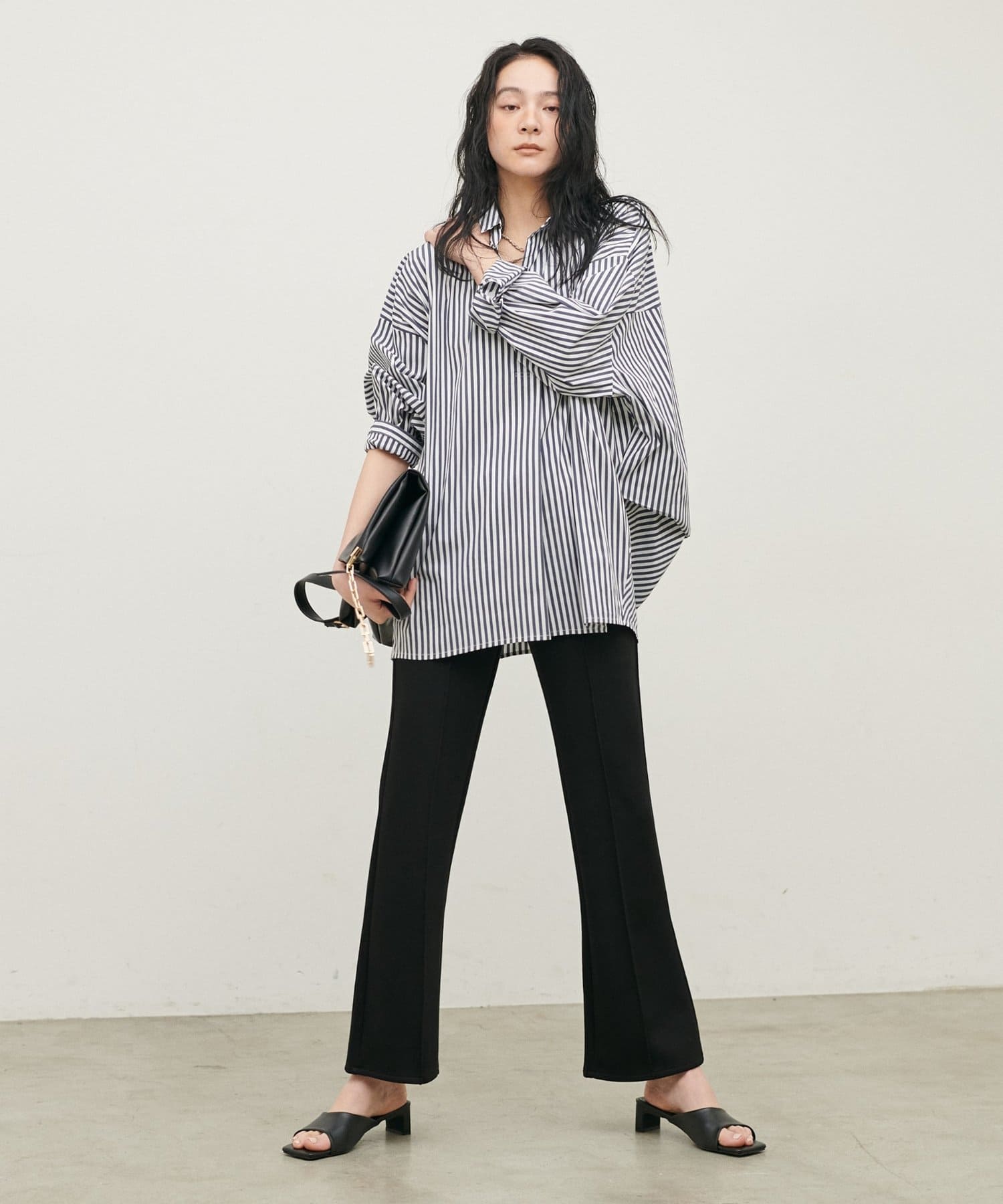 ボトムはスリムパンツやタイトスカートを選ぶと、バランスの良い大人のスタイリングが完成します。