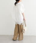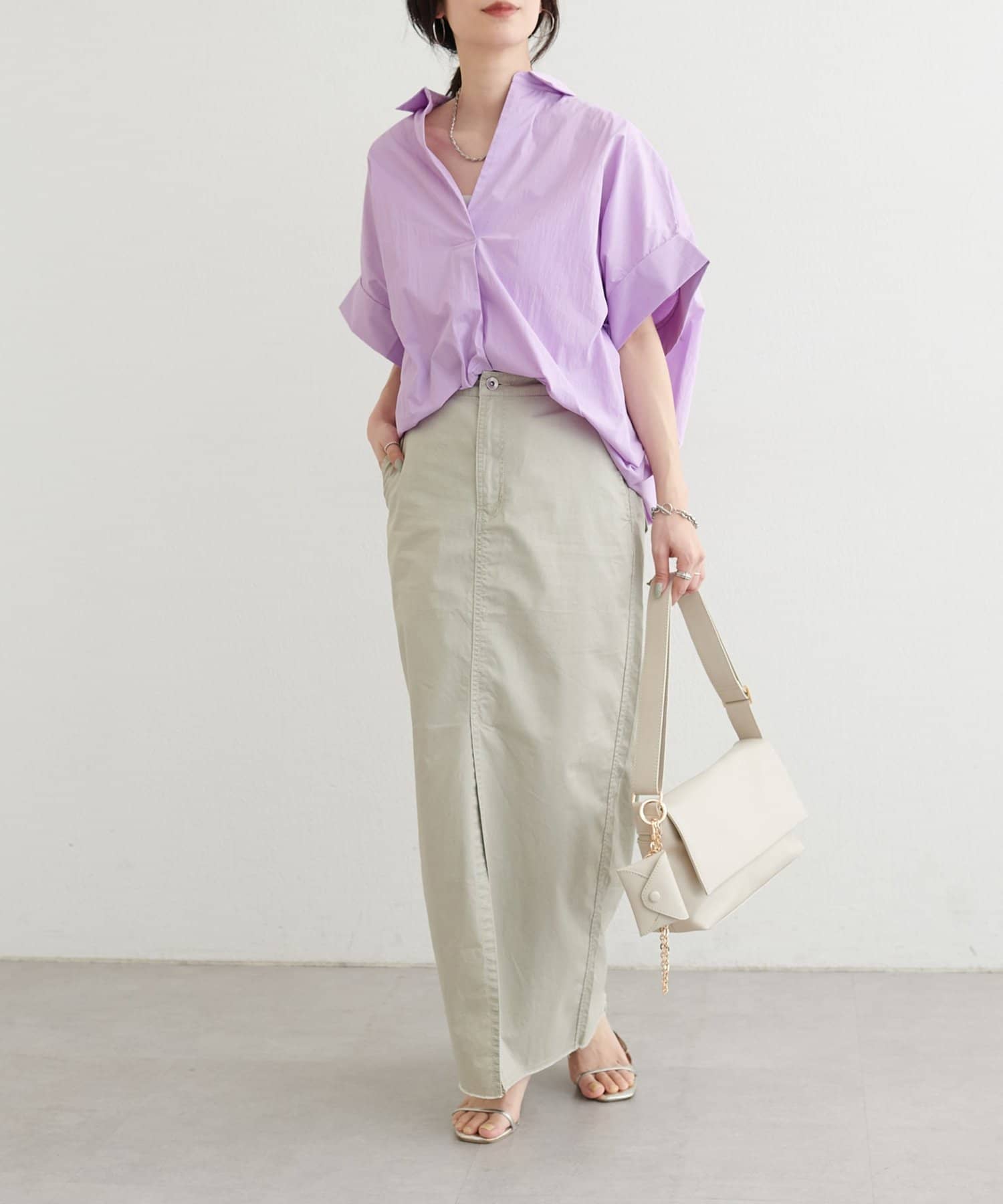 前後差のある着丈で、ヒップまわりをさりげなくカバーしながら動きのある印象に。