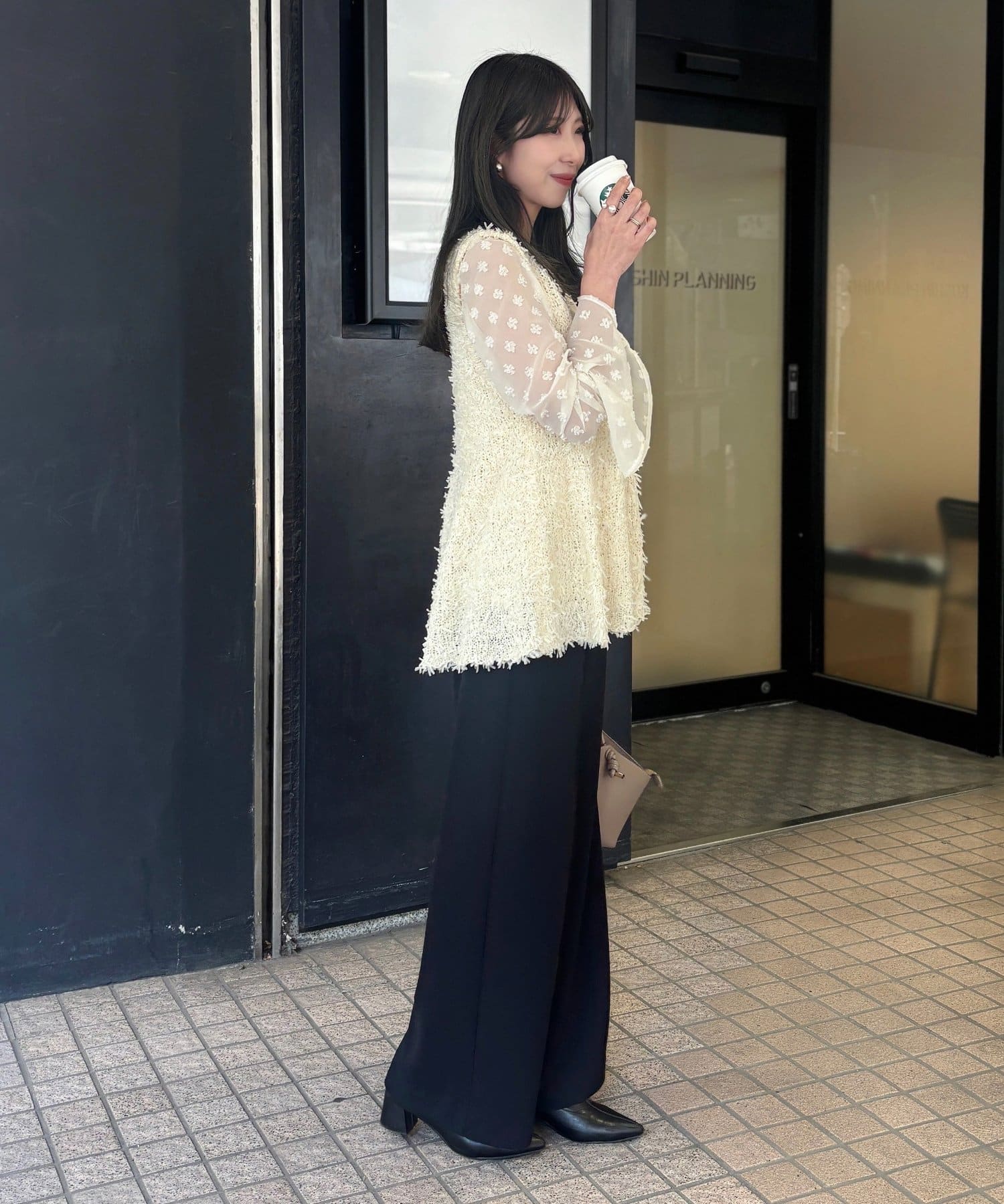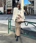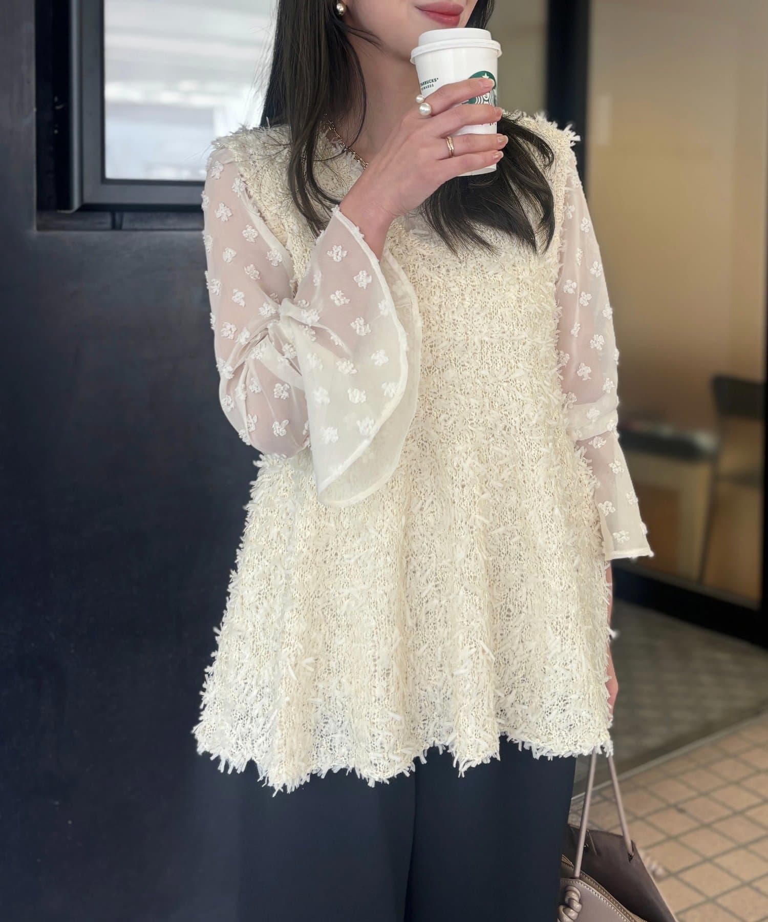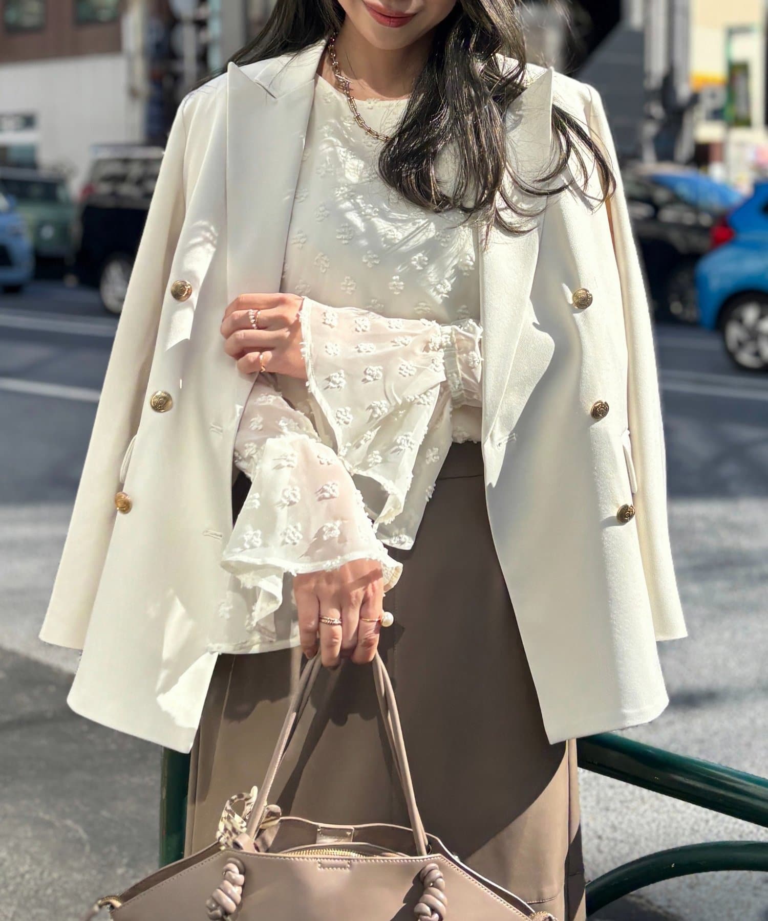 袖のベルスリーブを生かして、テーラードジャケットやカーディガンを重ねても◎。