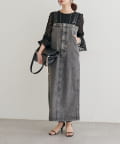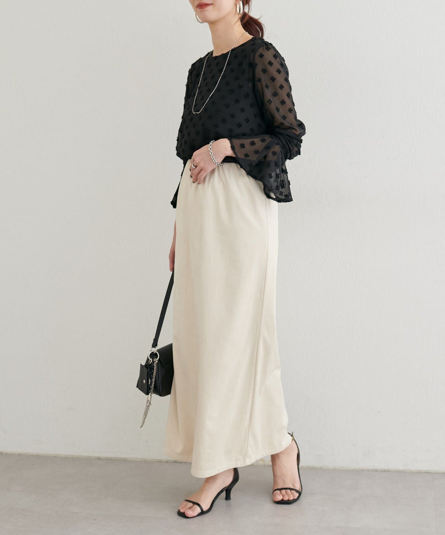 袖のベルスリーブを生かして、テーラードジャケットやカーディガンを重ねても◎。