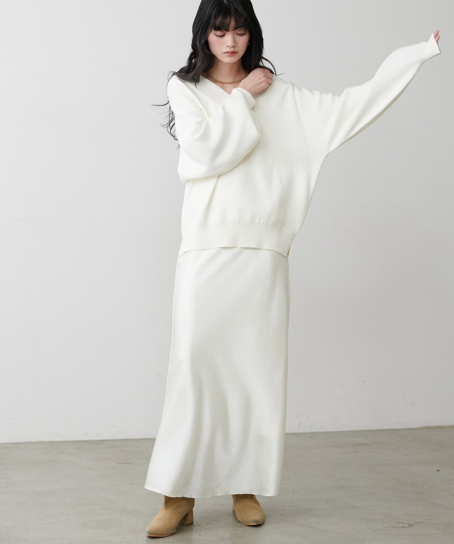 同素材スカートとのセットアップは、シンプルながら統一感のあるスタイルが完成。