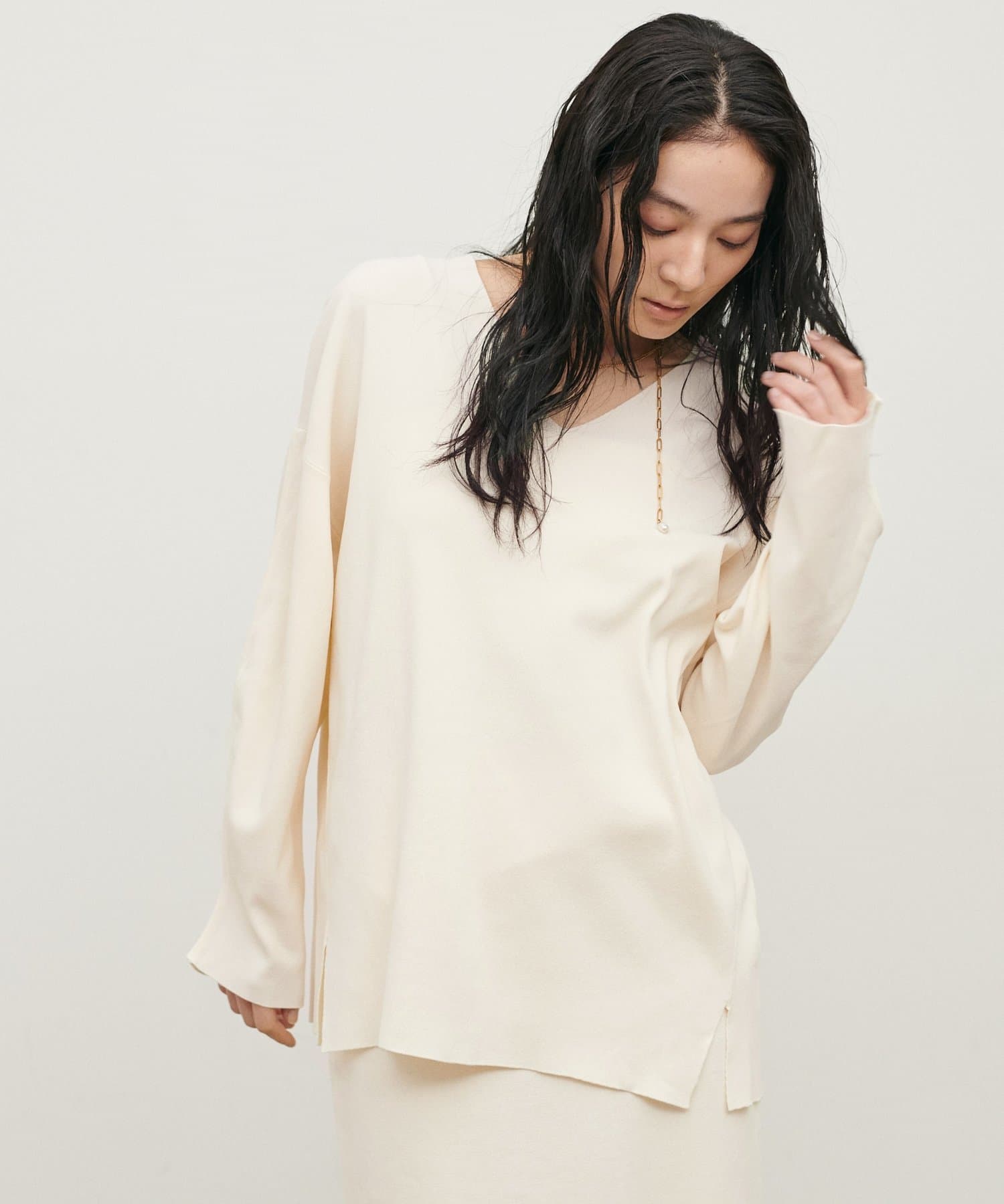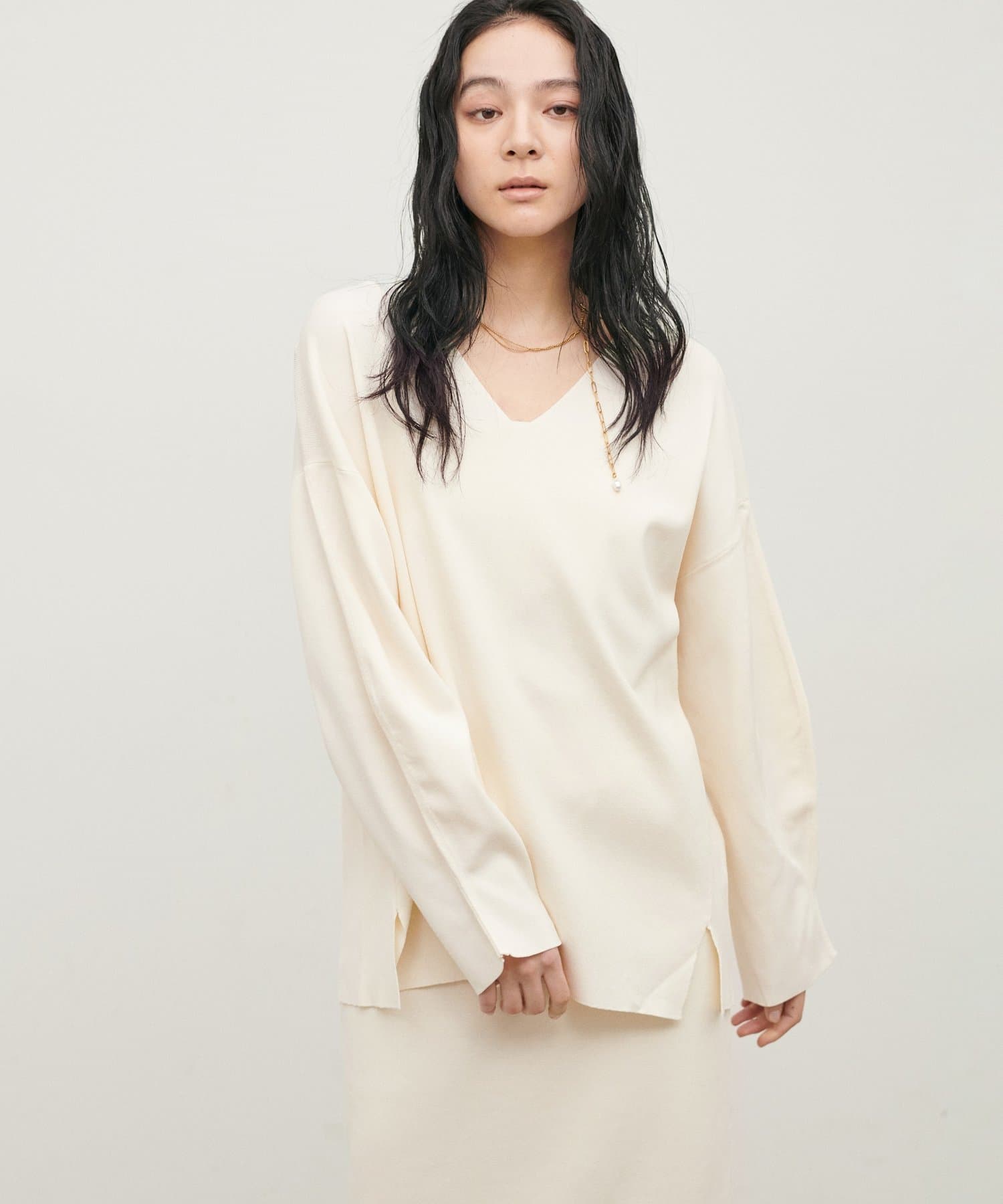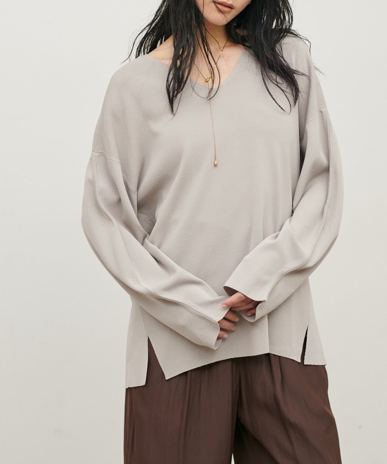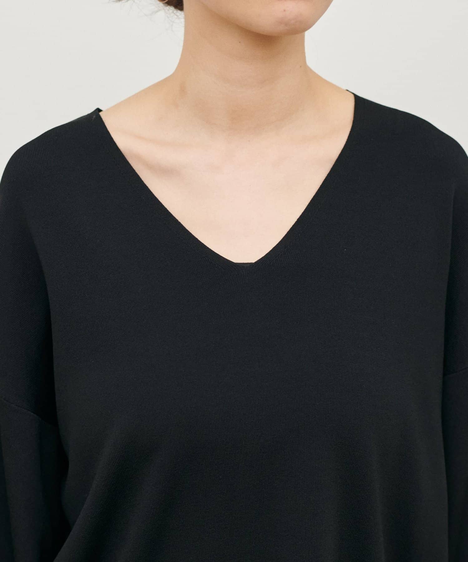 深めのVネックが顔周りをきれいに見せ、