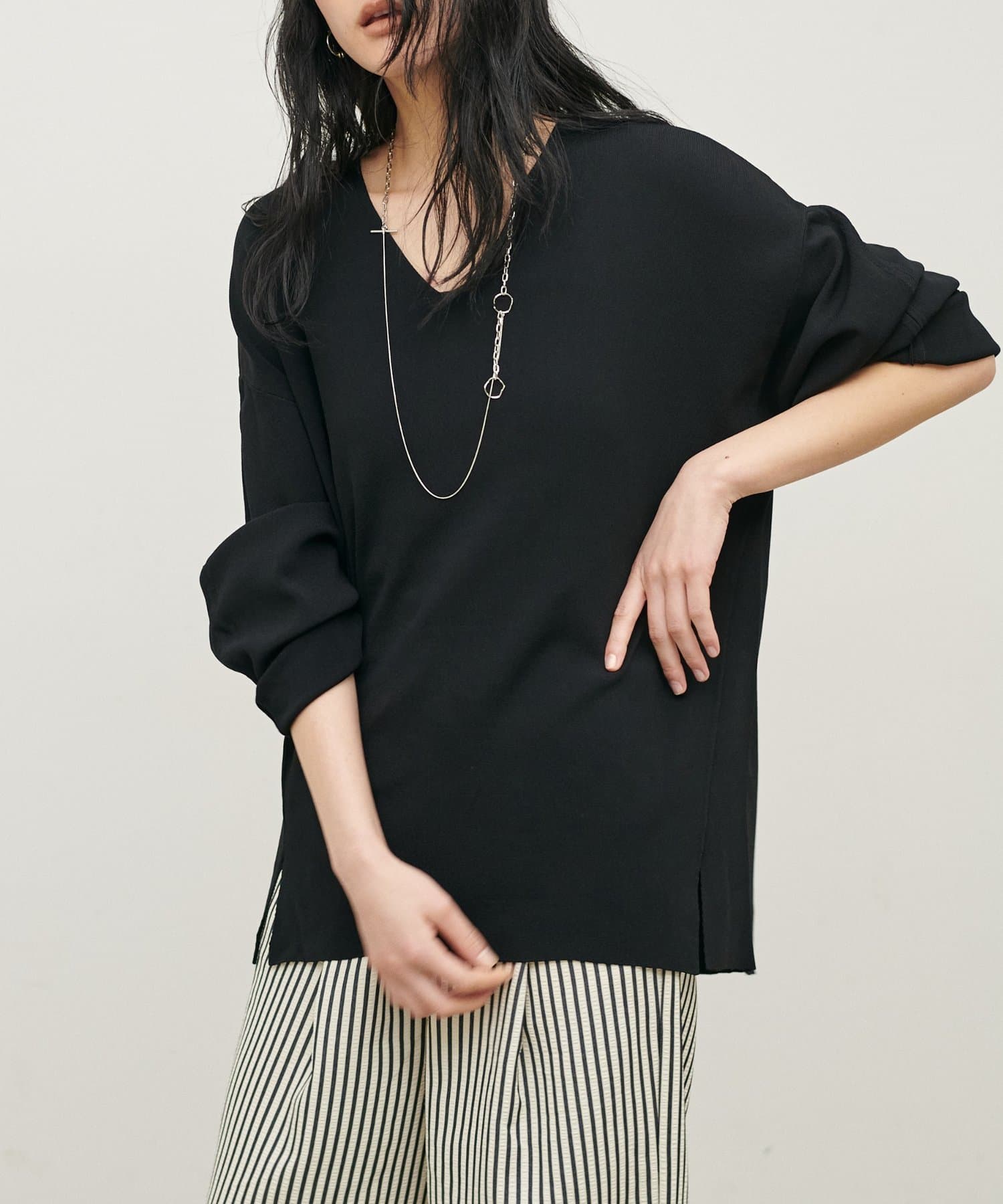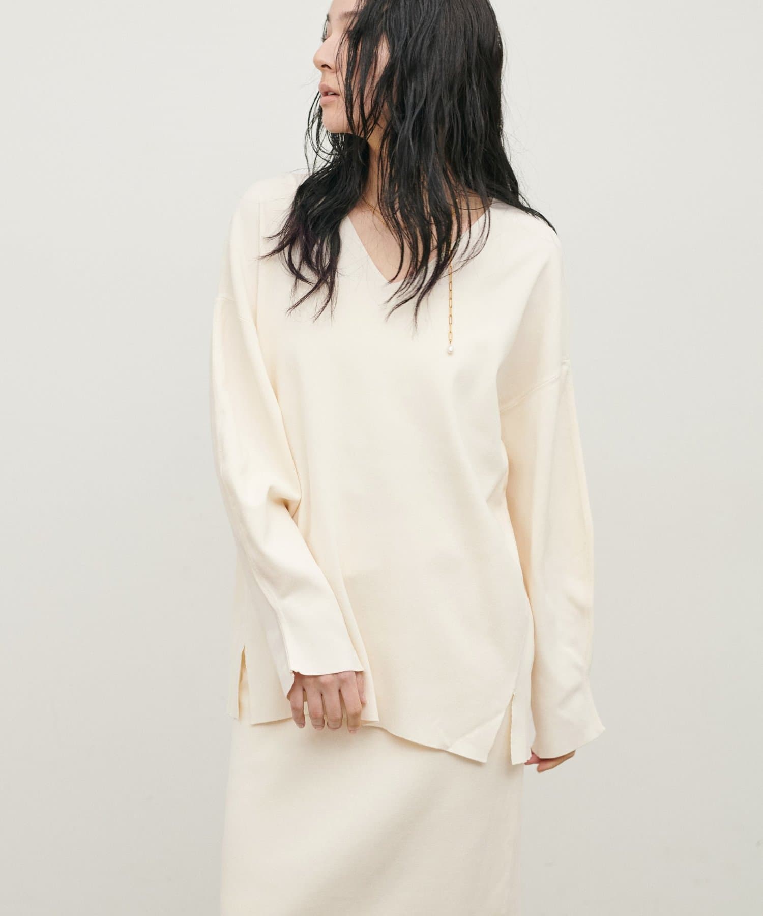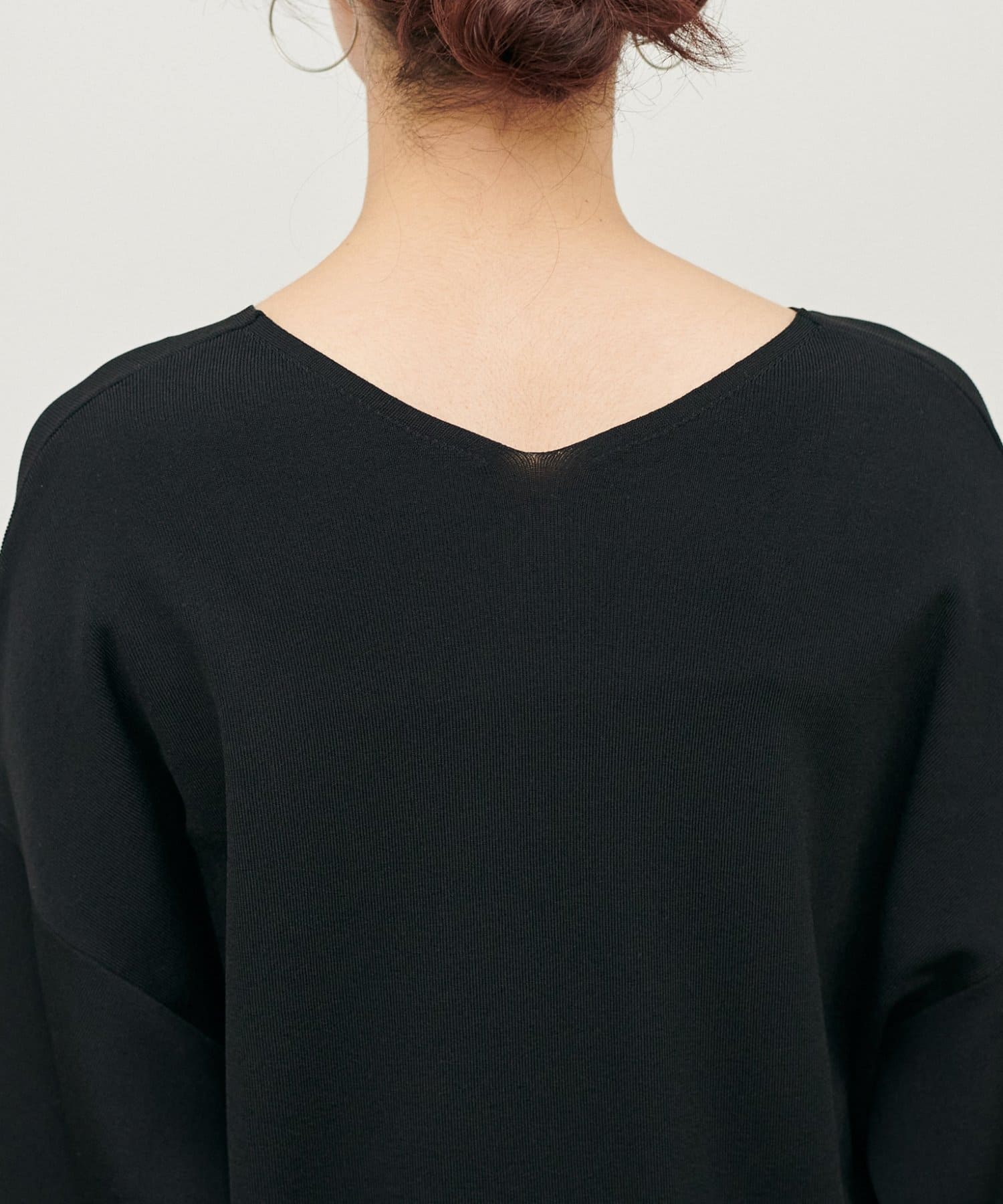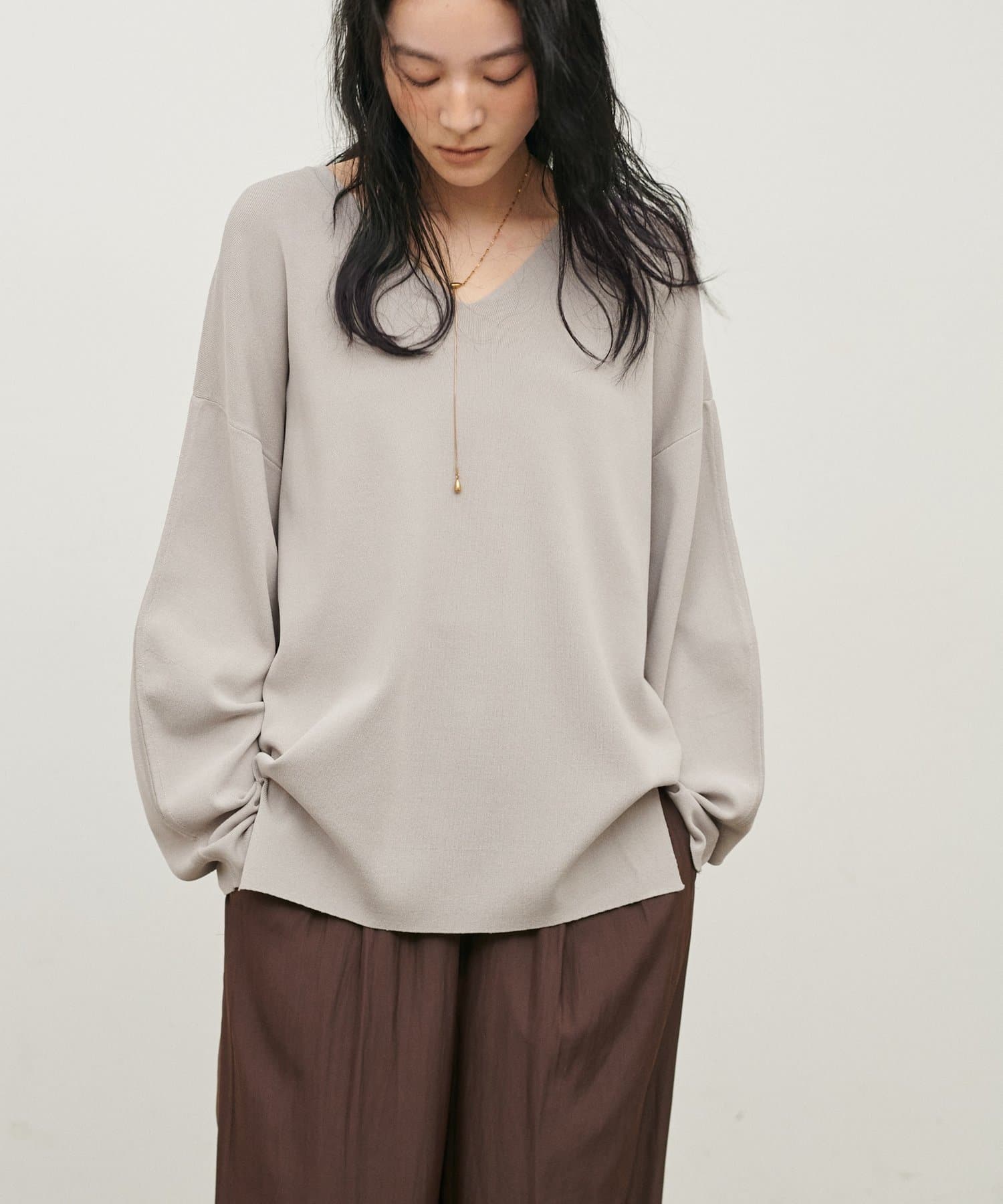 深めのVネックが顔周りをきれいに見せ、
