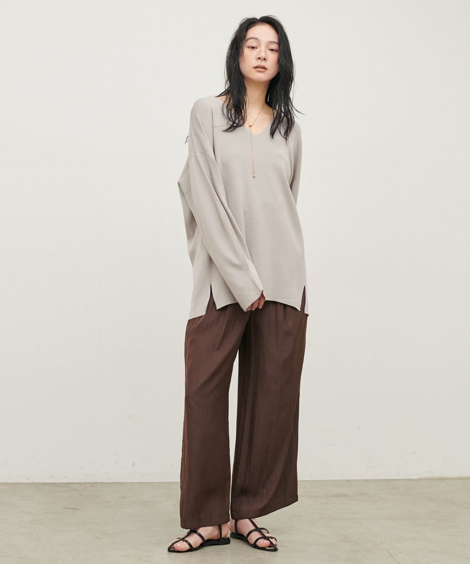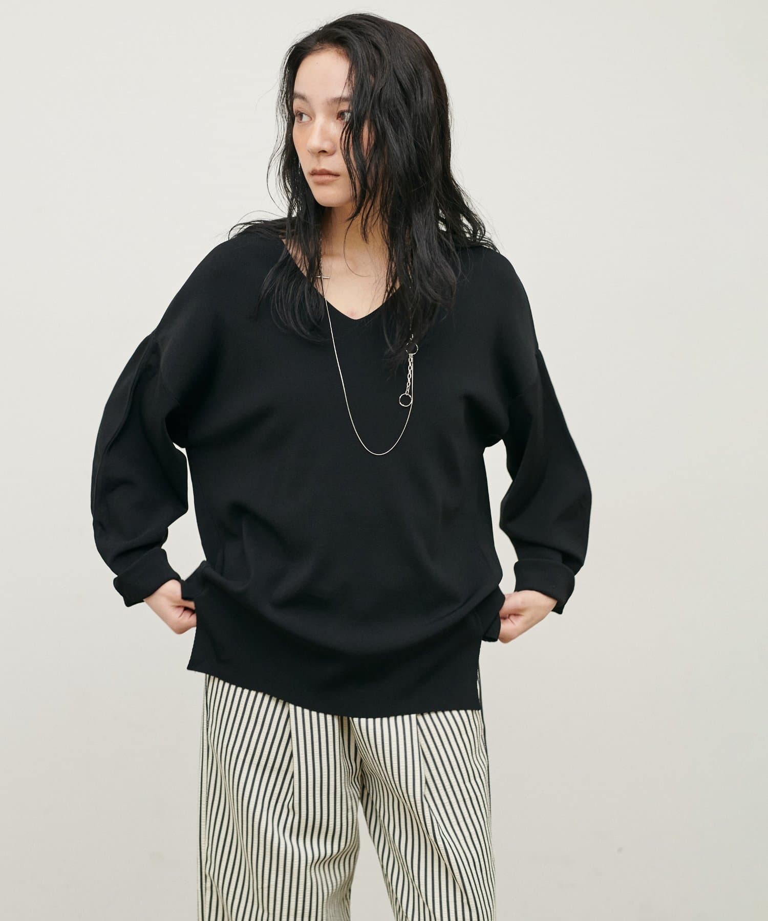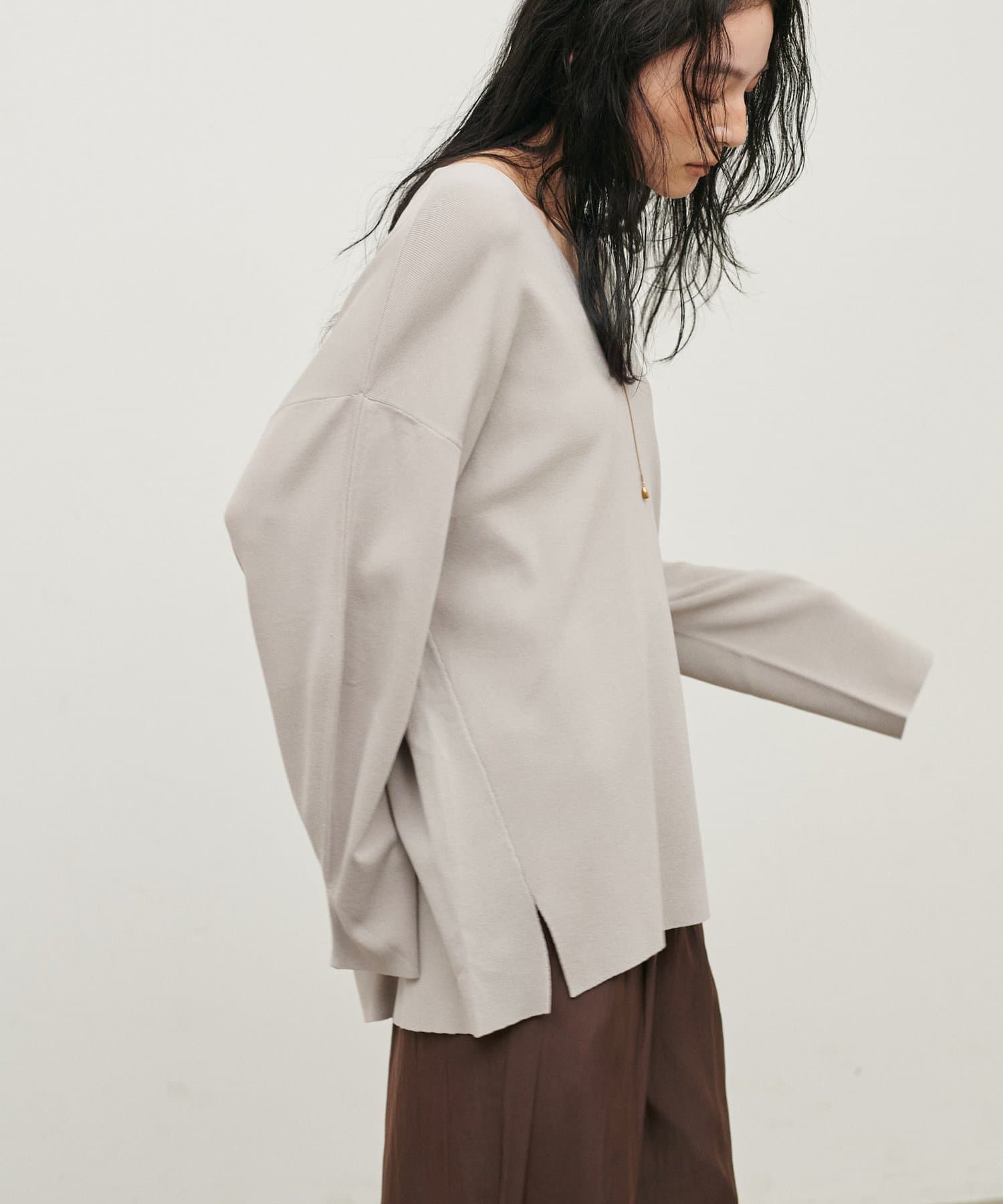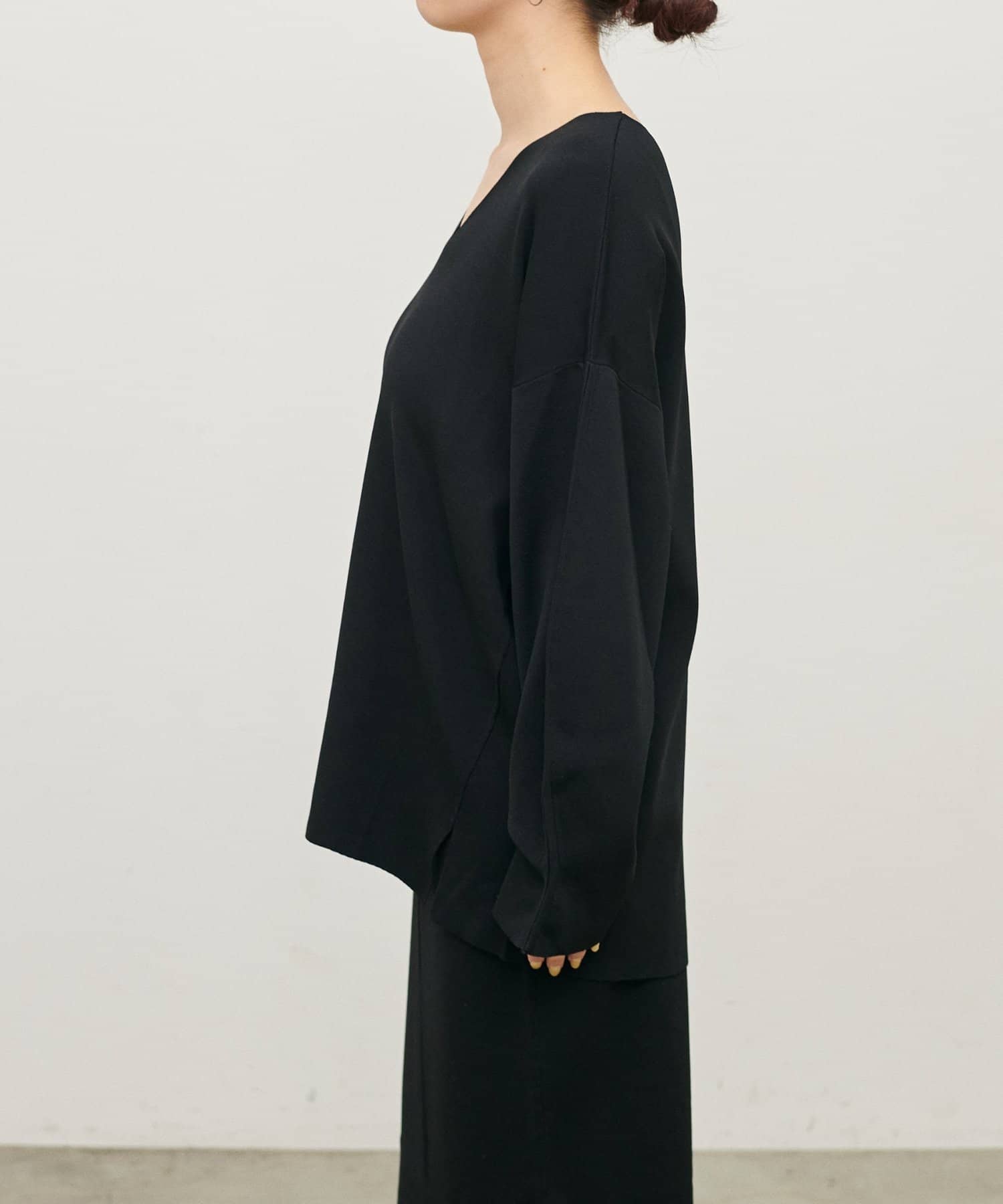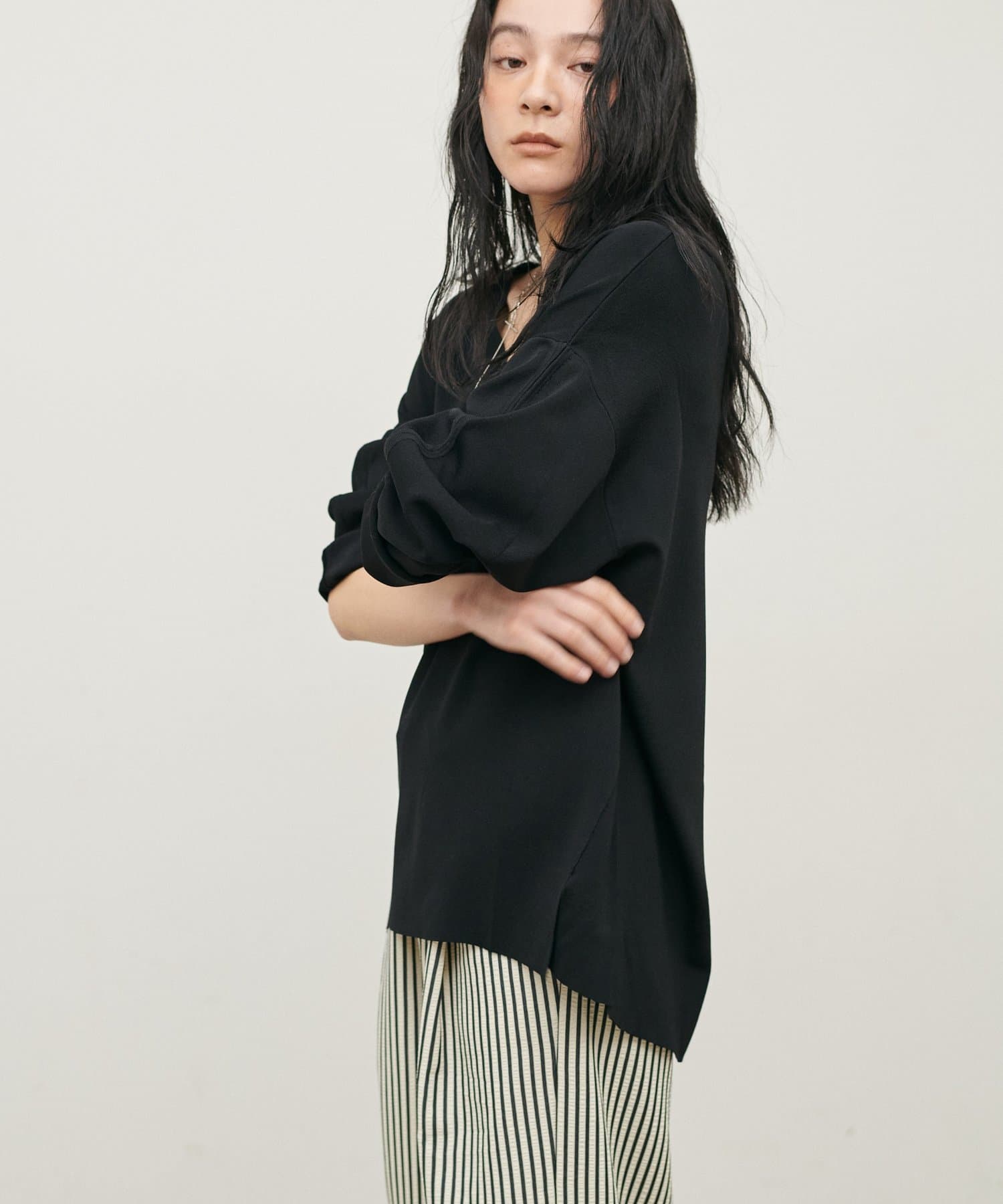 深めのVネックが顔周りをきれいに見せ、