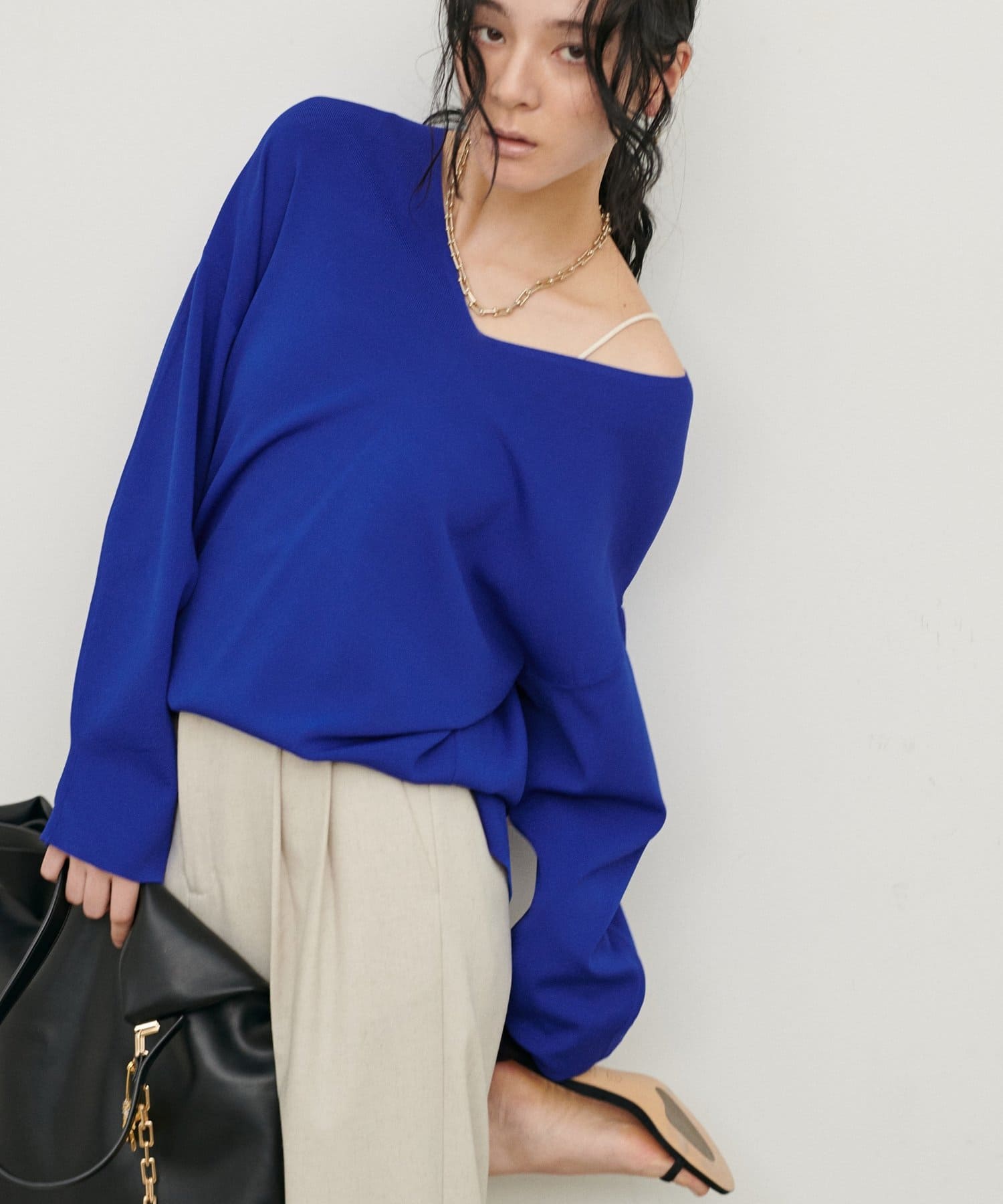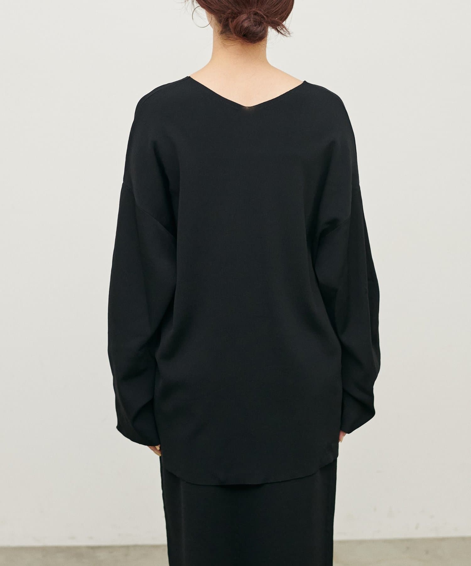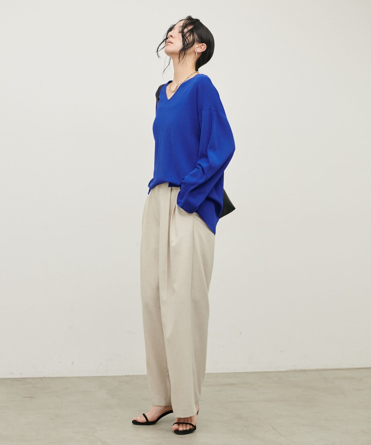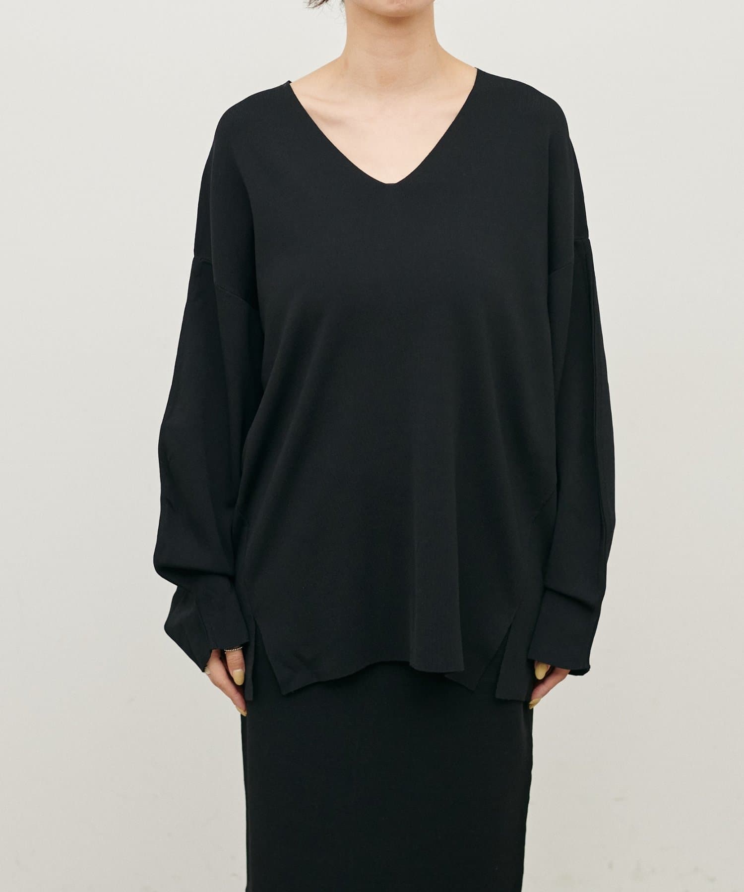 深めのVネックが顔周りをきれいに見せ、