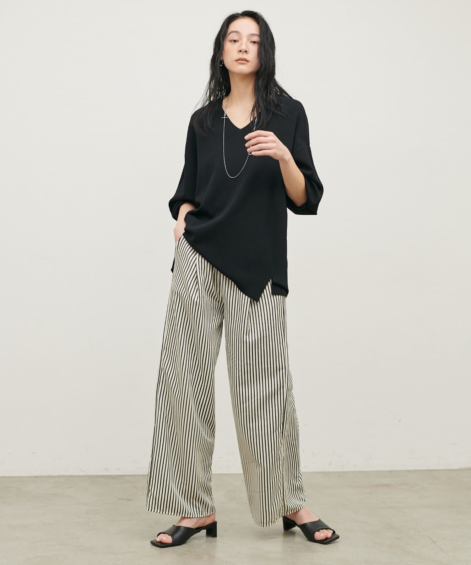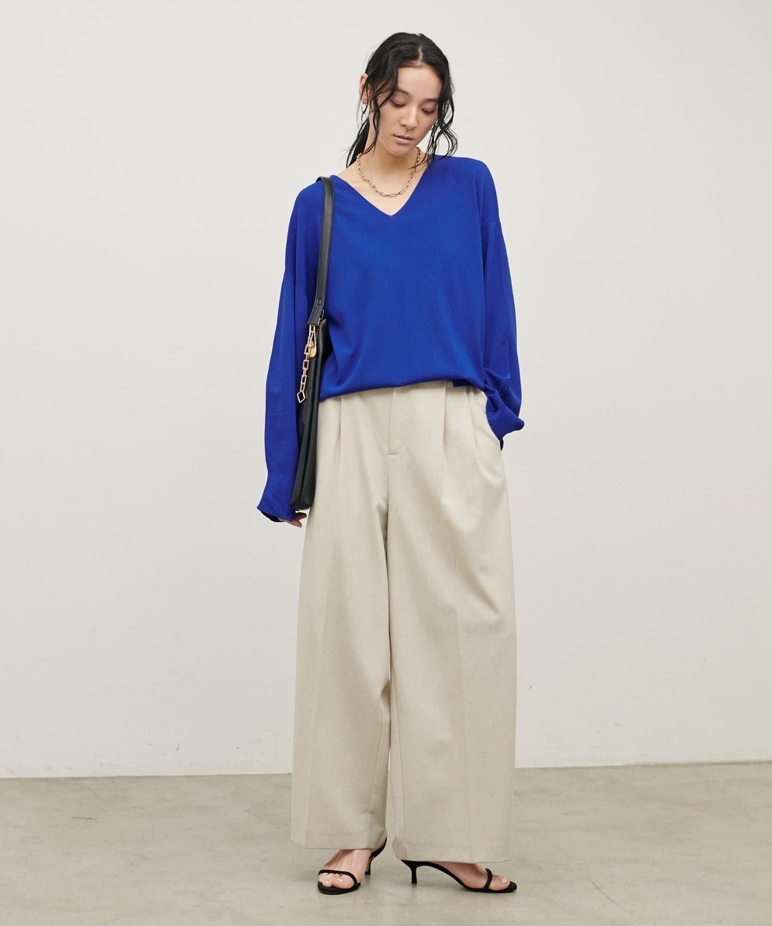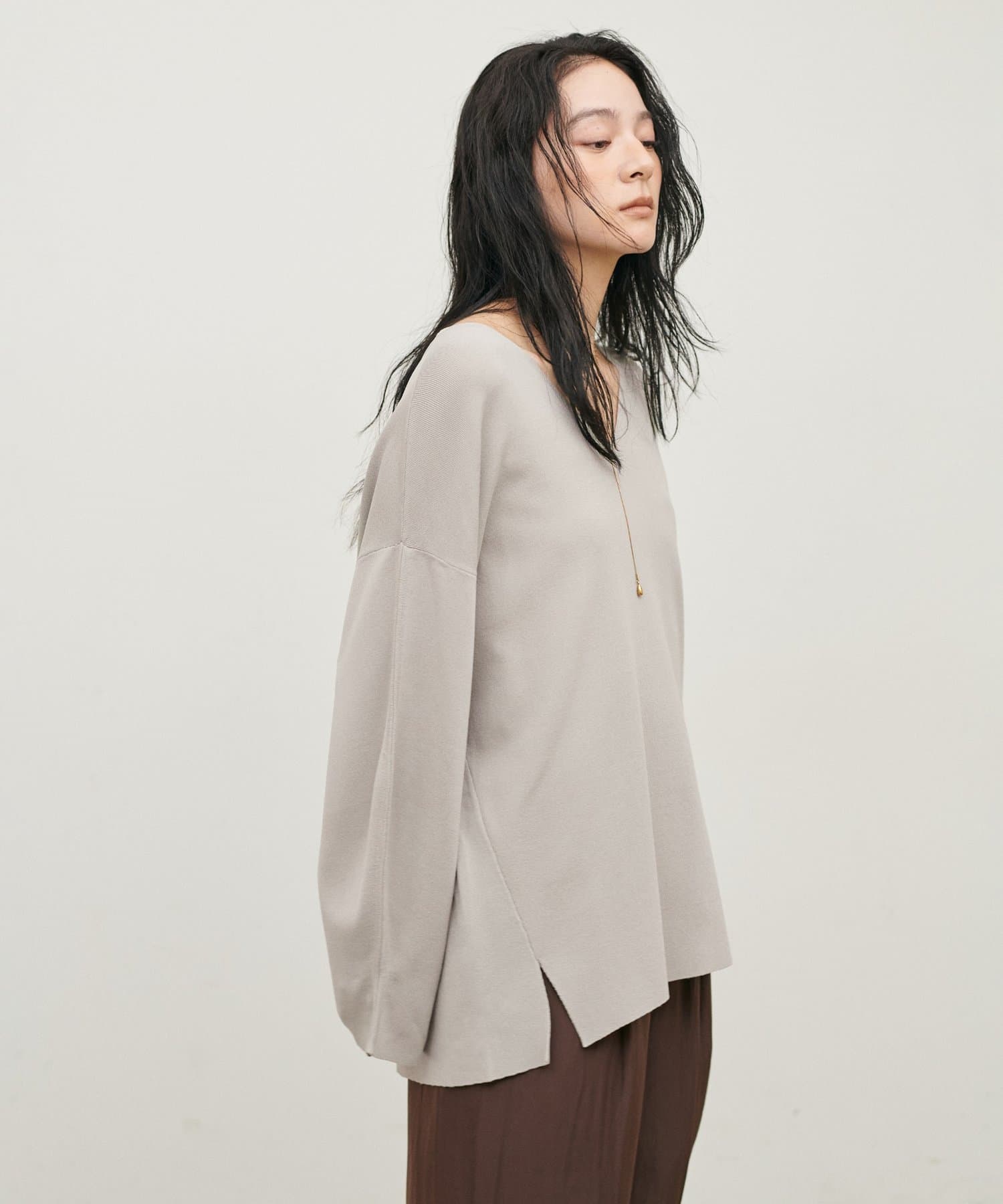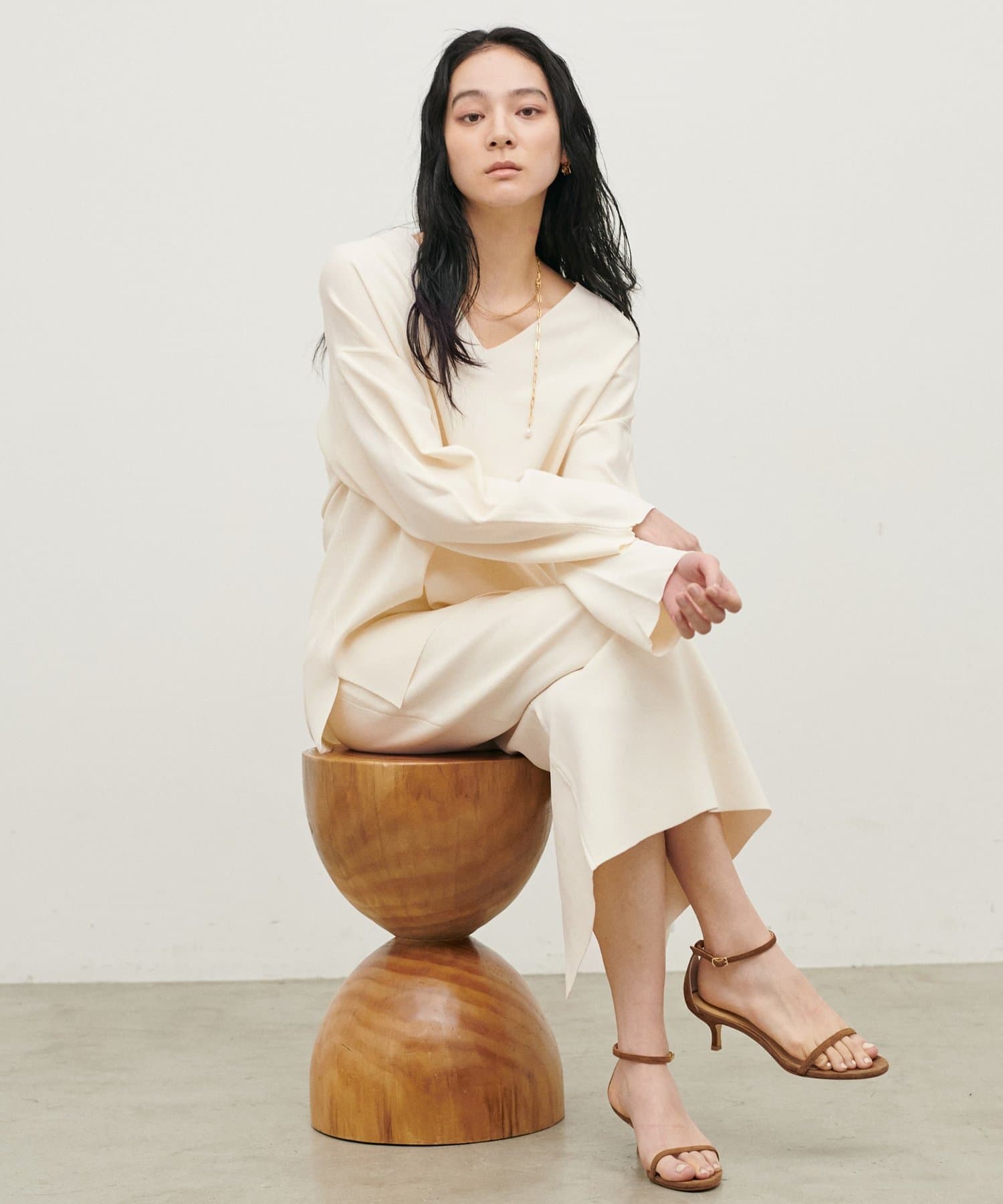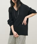 深めのVネックが顔周りをきれいに見せ、