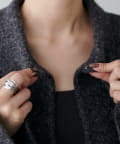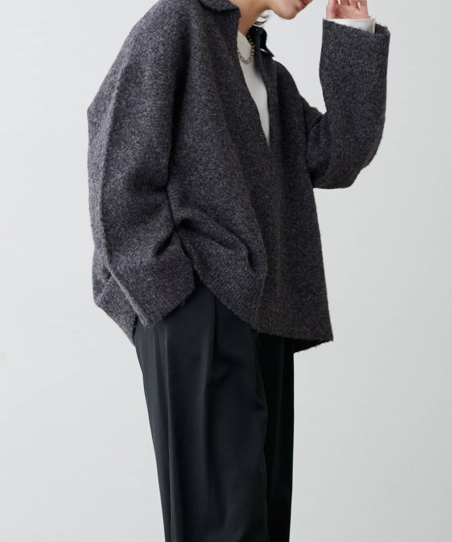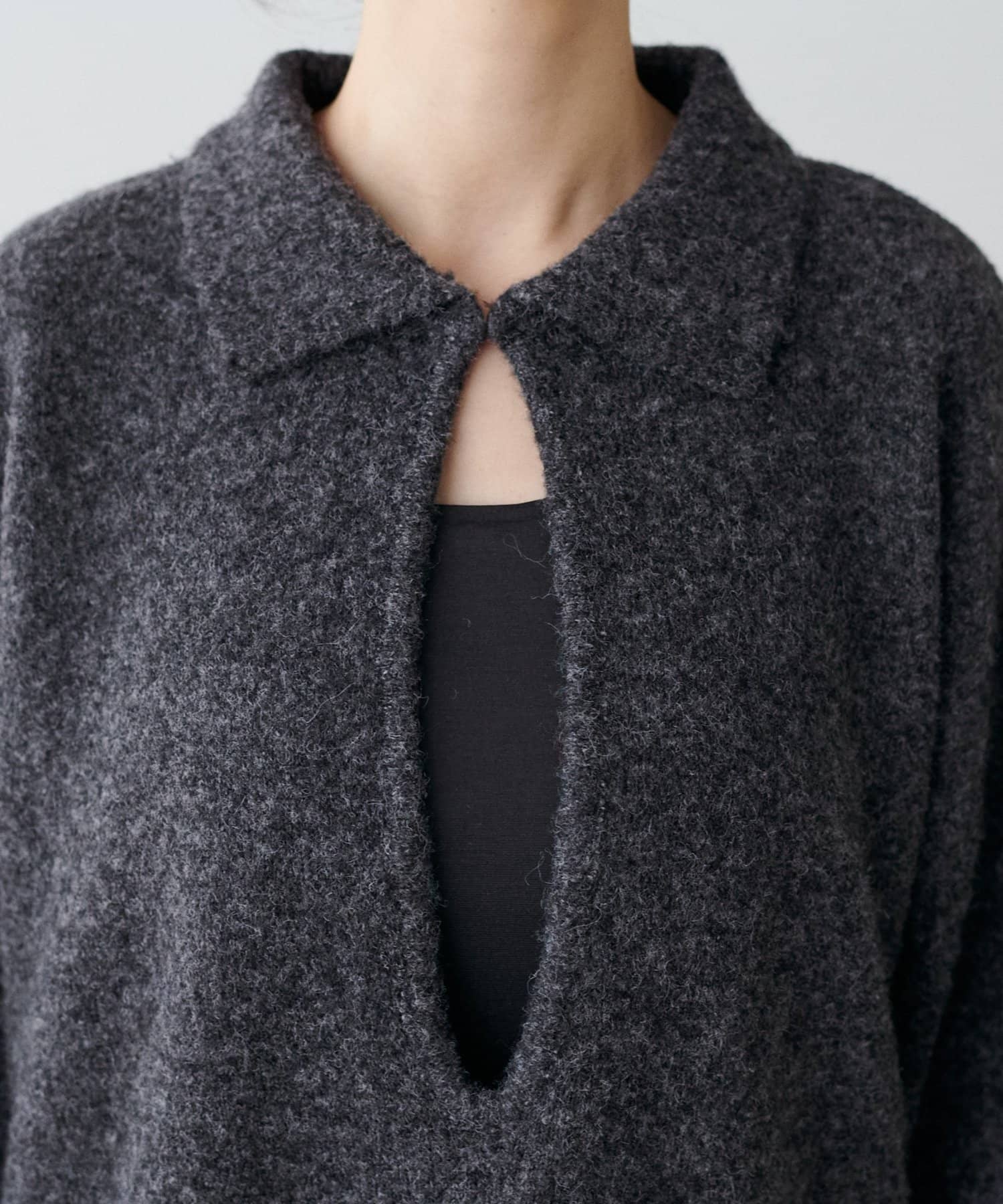 首元はフック留め仕様になっており、留めた状態では衿付きニットとして、