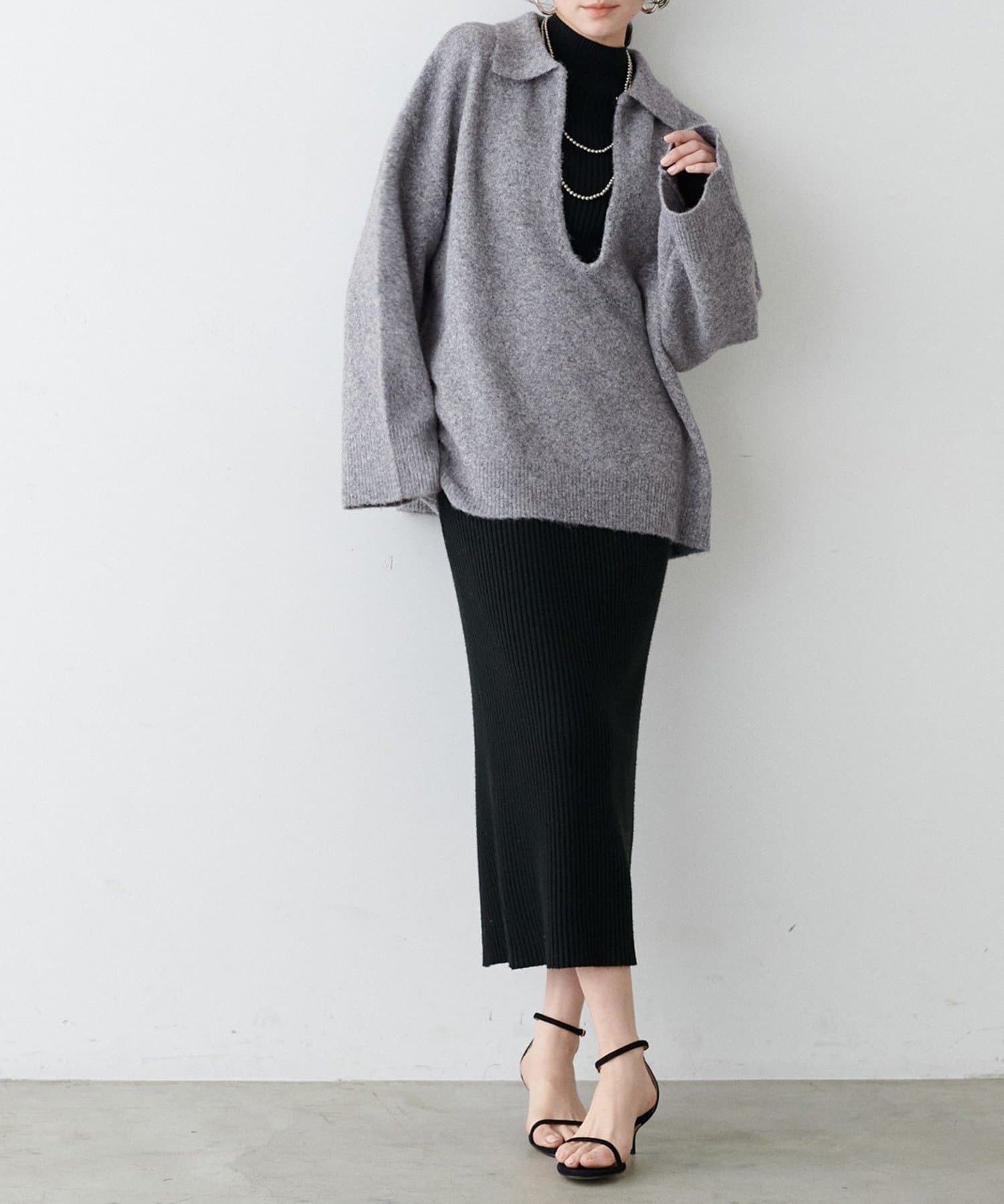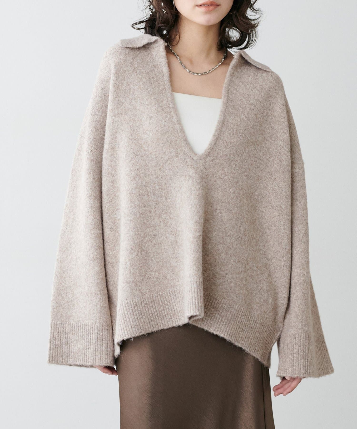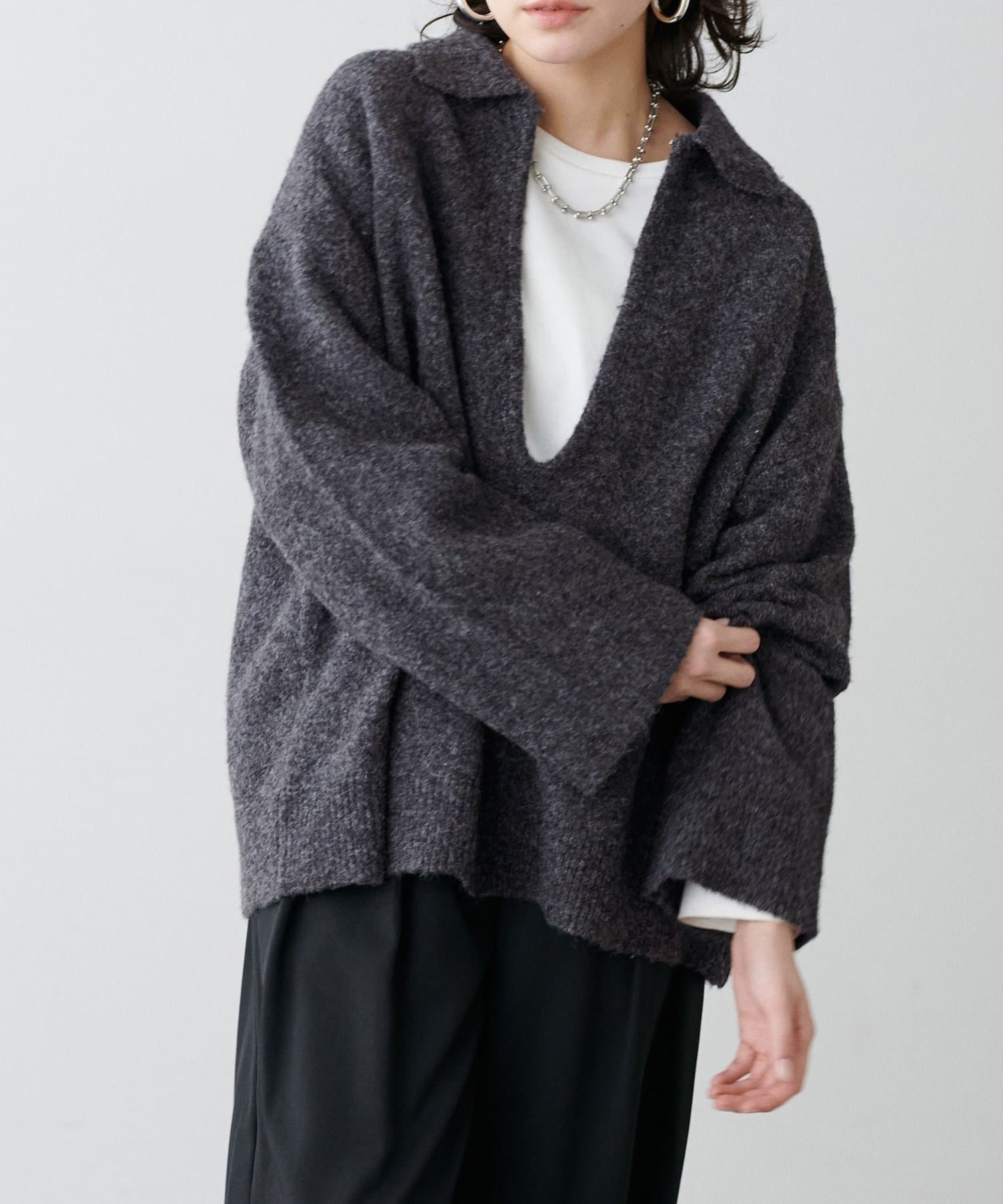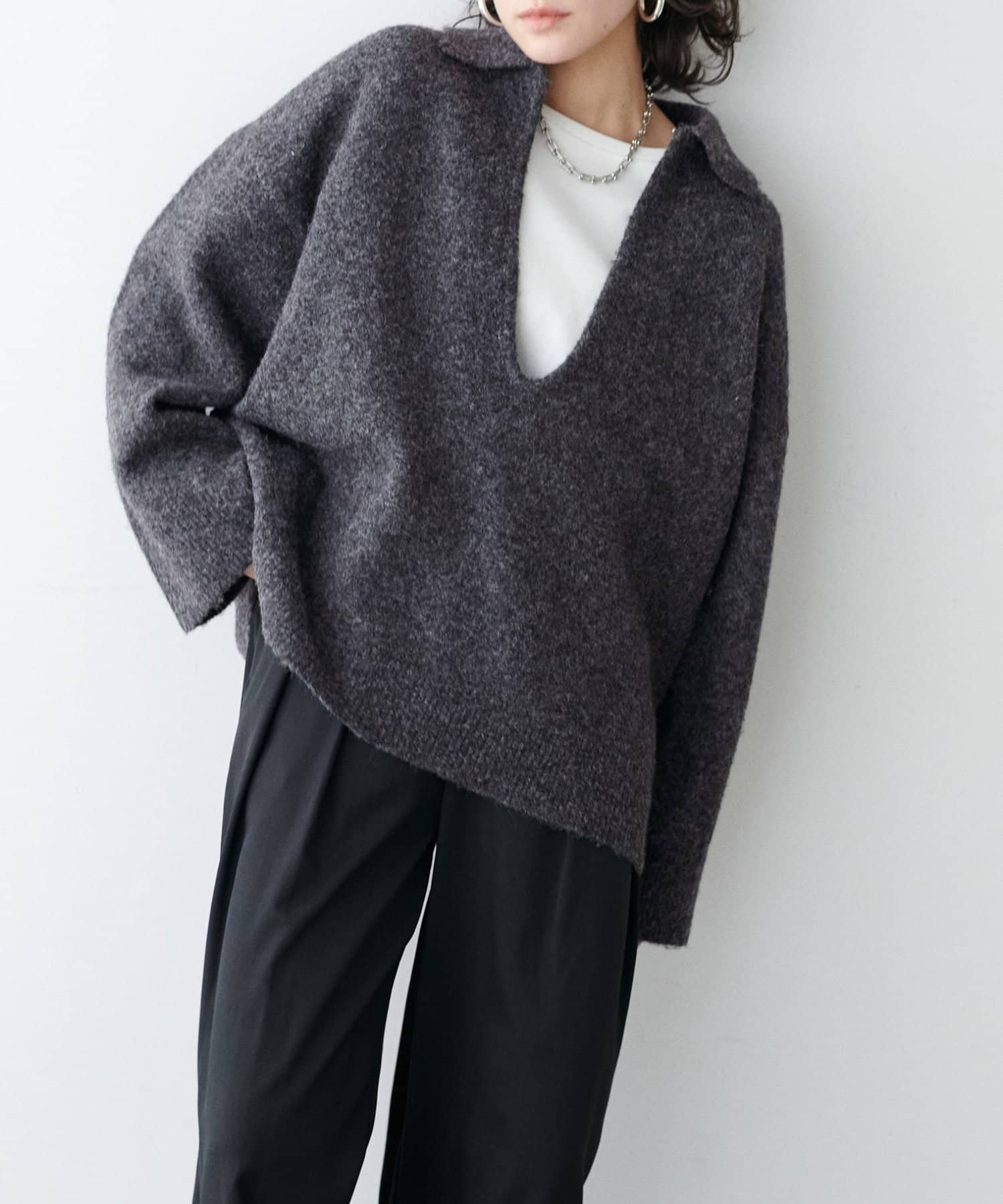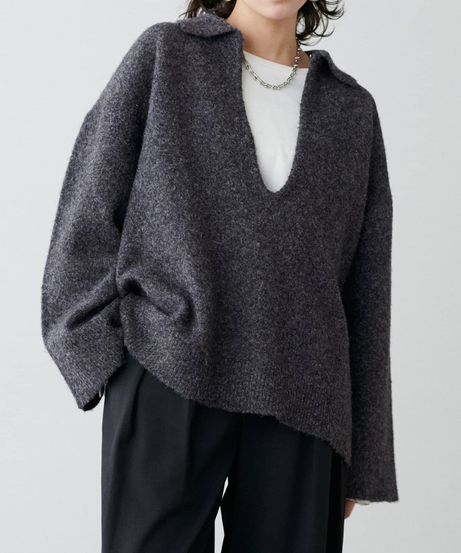 フックを外すと深めのVネックニットとして着用できるデザインです。