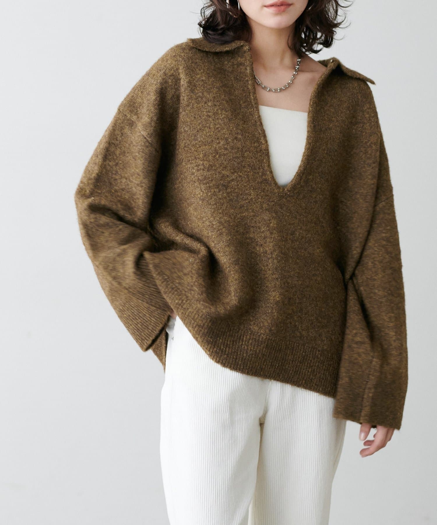 表情のある杢調カラーが印象的な、衿付きデザインのニットプルオーバー。