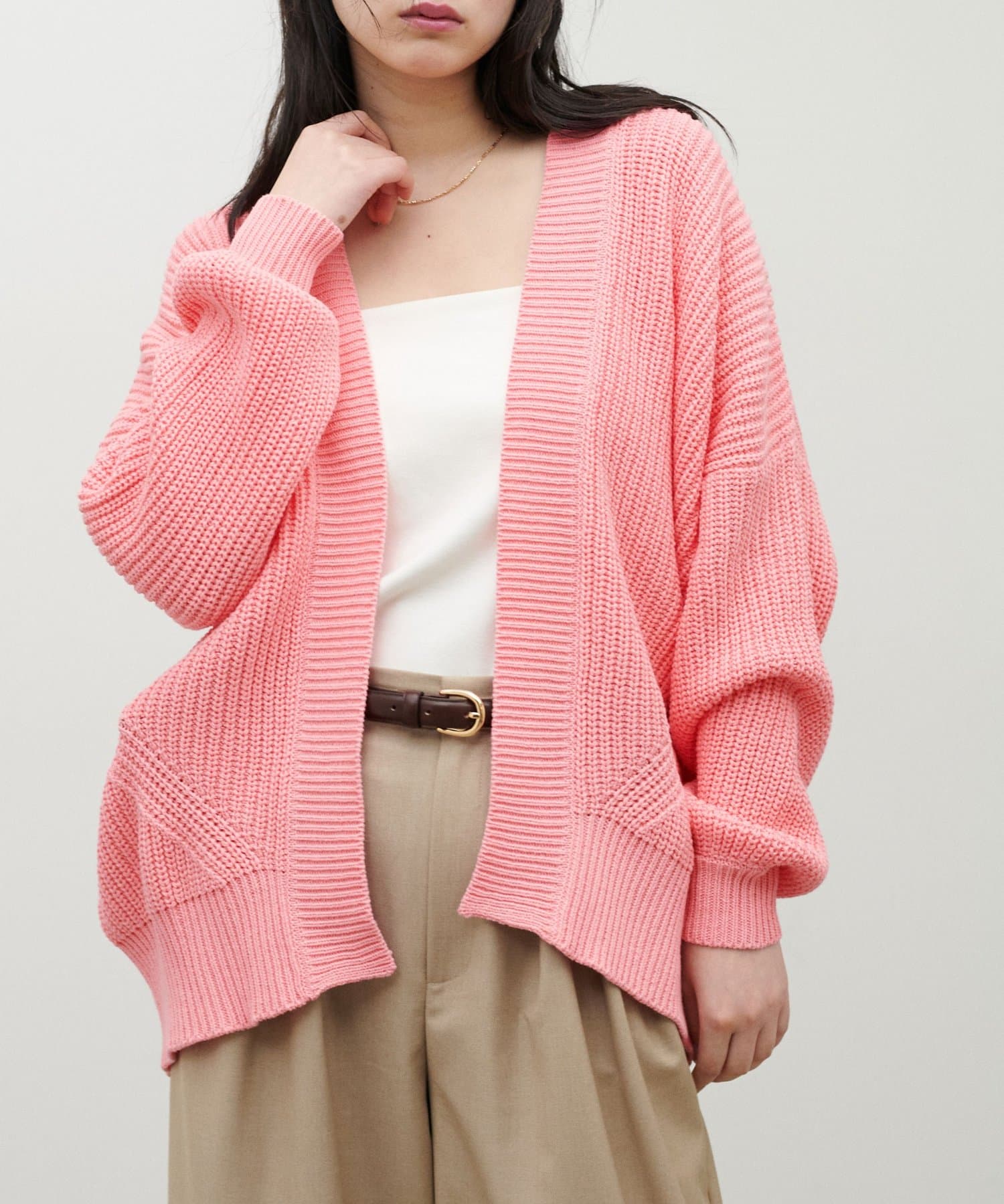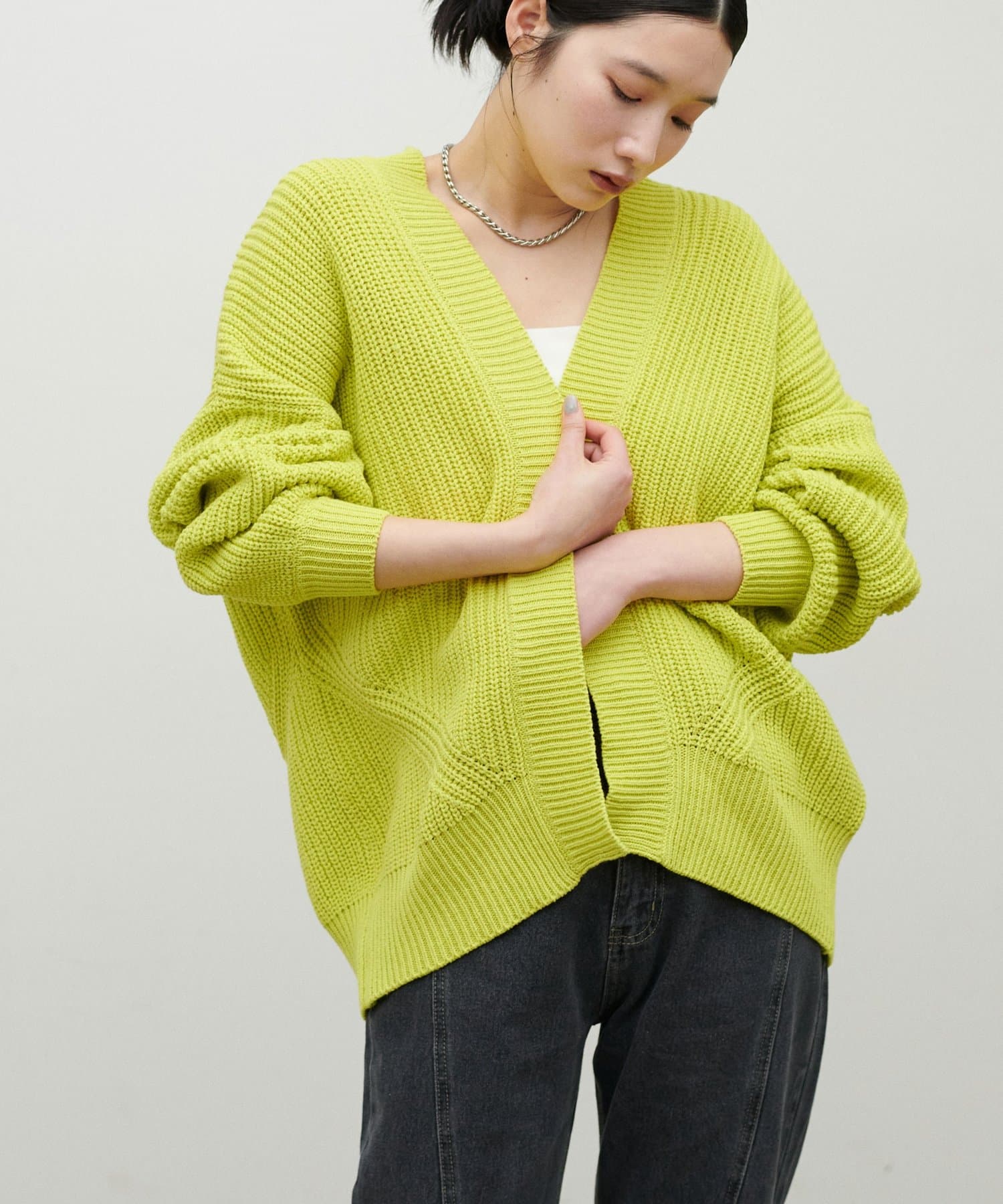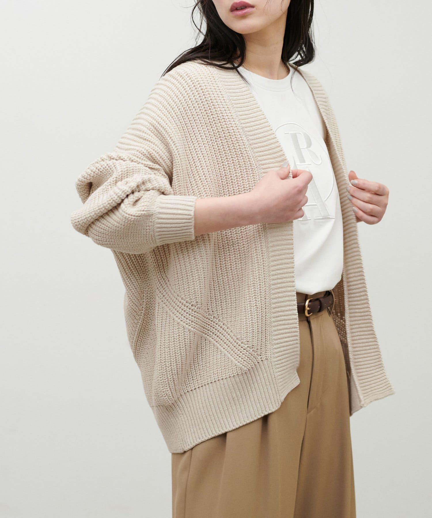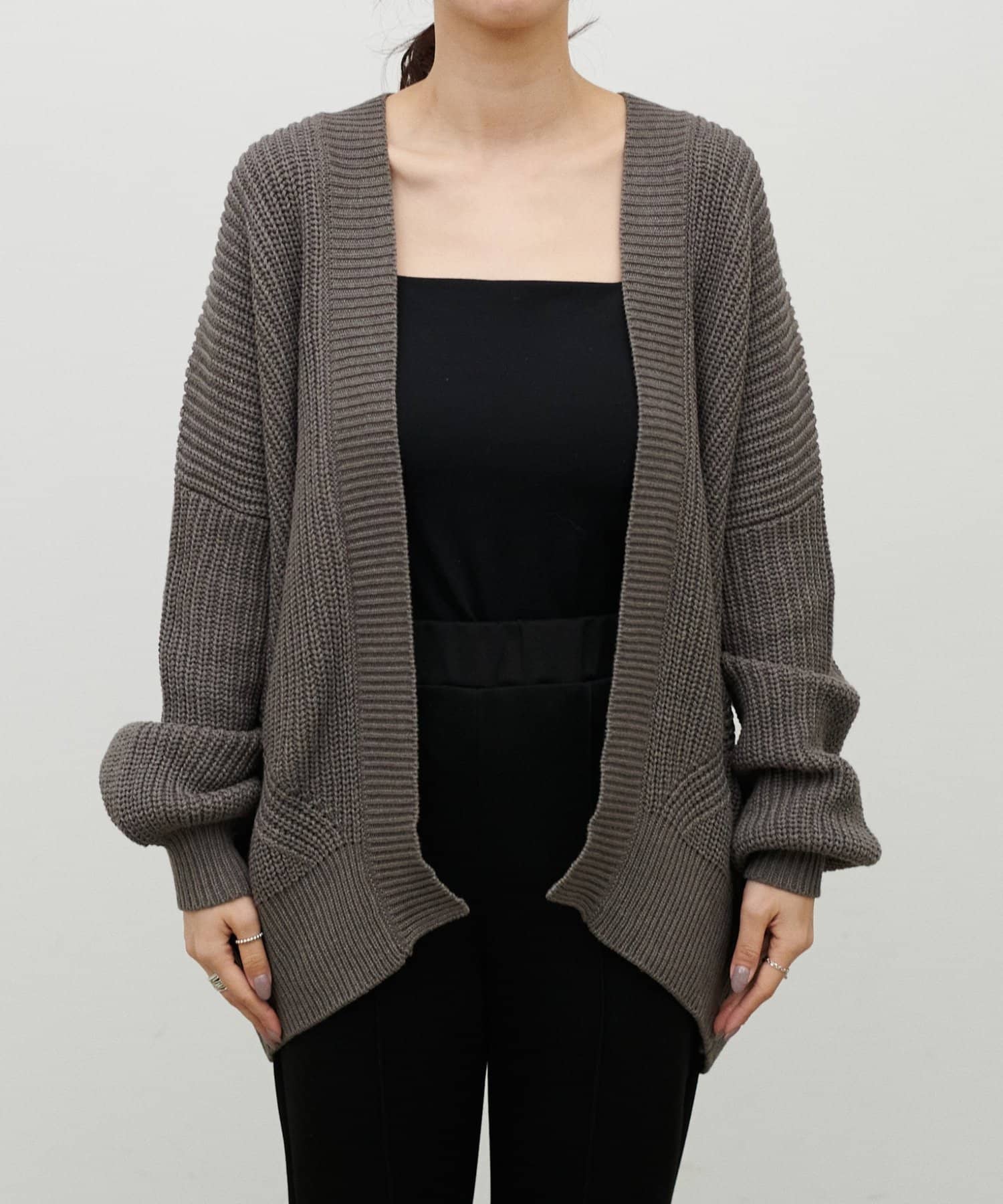 片畦のざっくりとした網目が特徴のニットカーディガン。