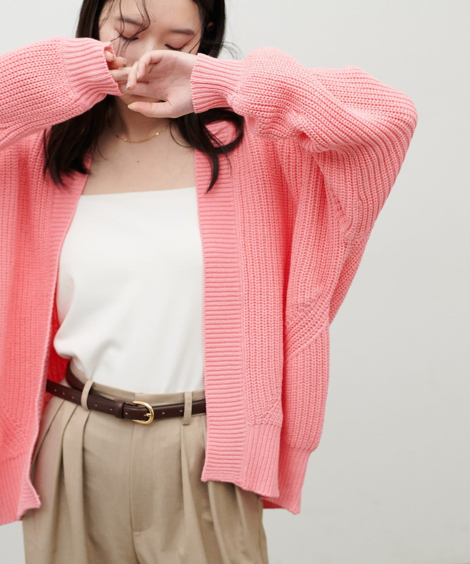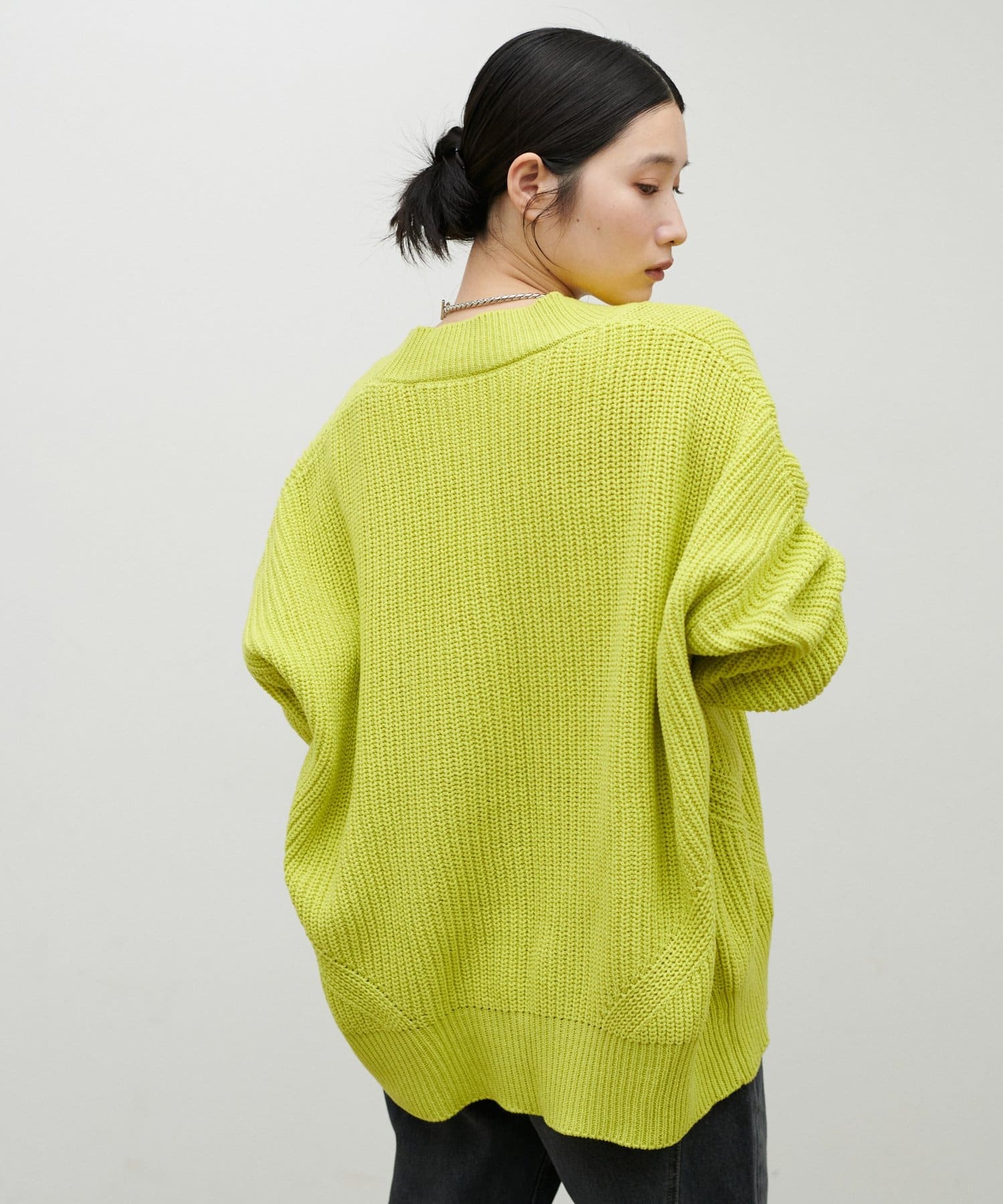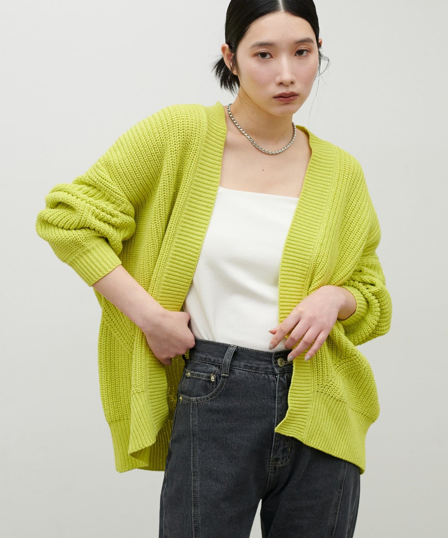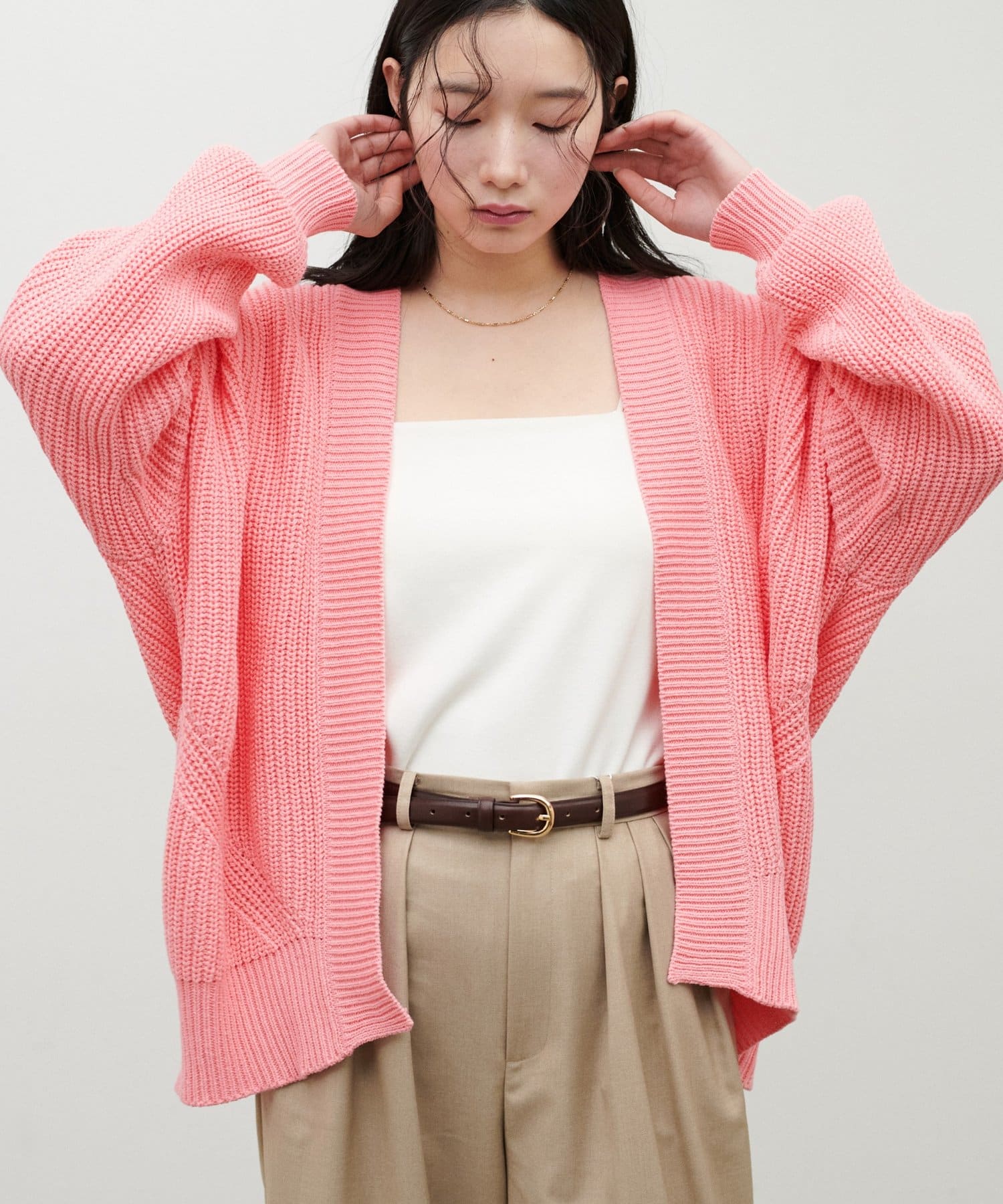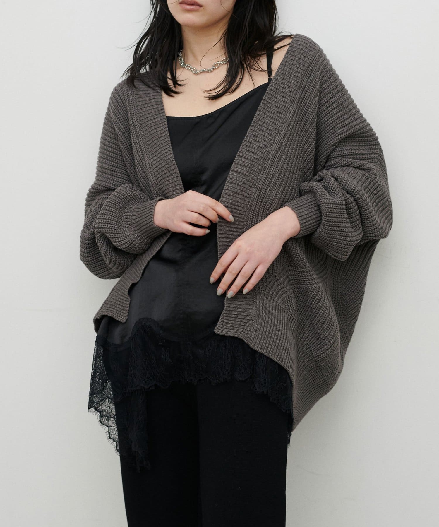 片畦のざっくりとした網目が特徴のニットカーディガン。