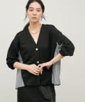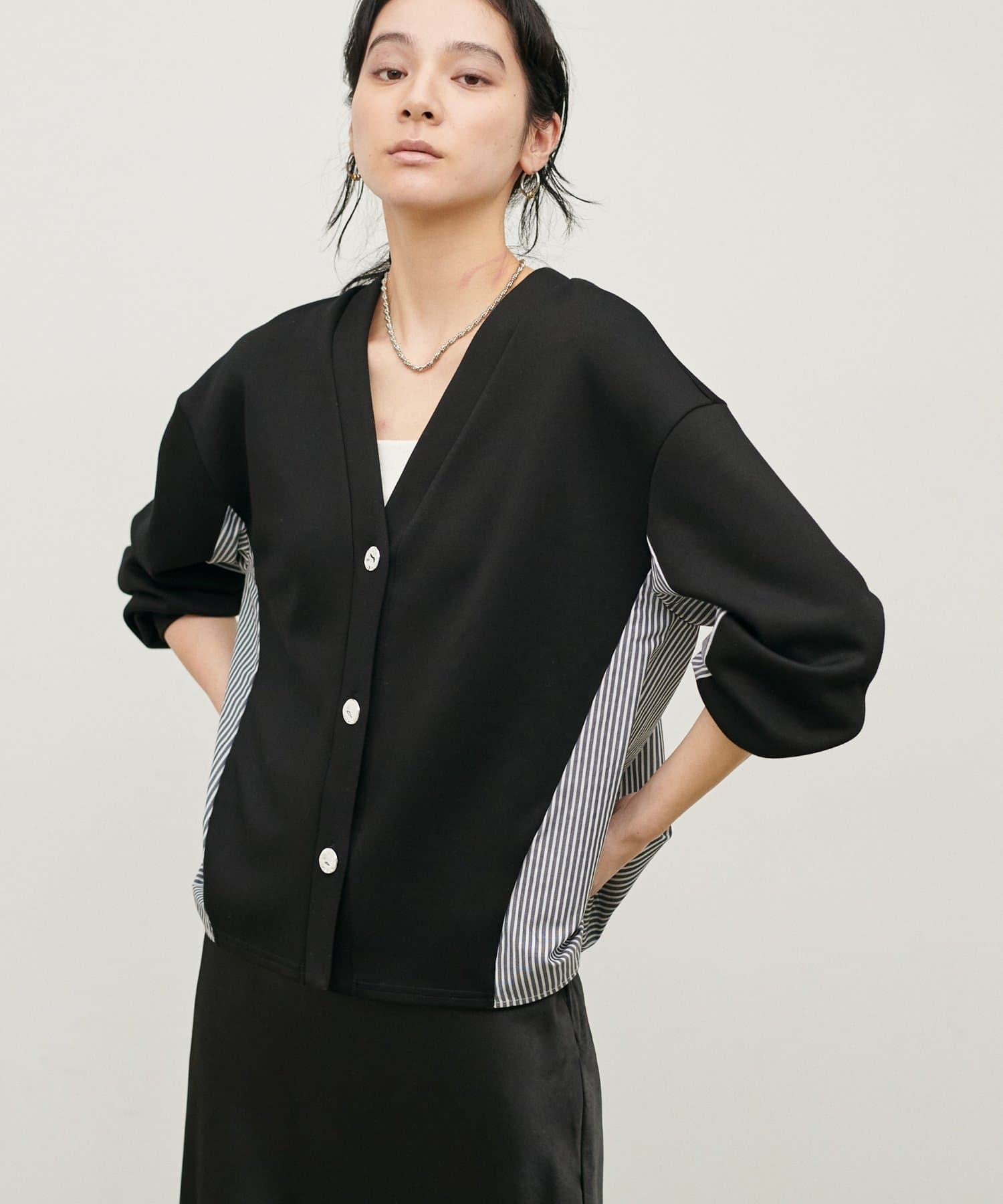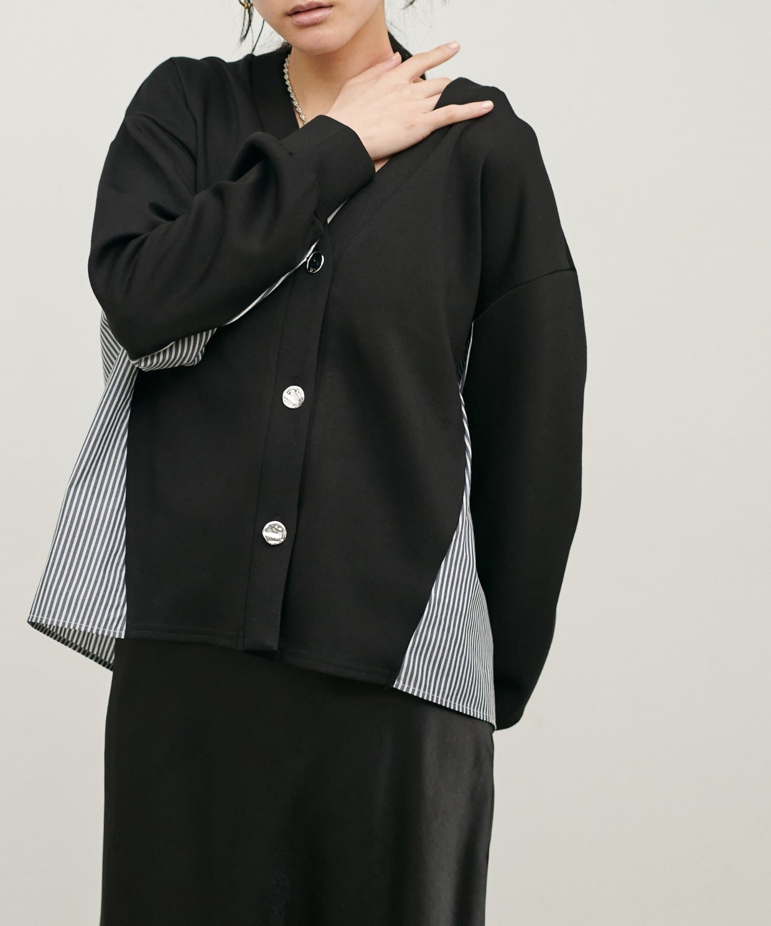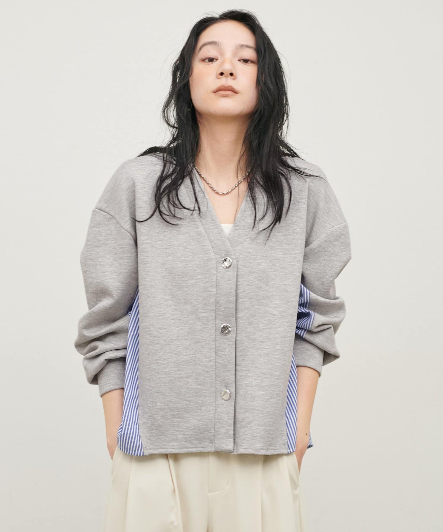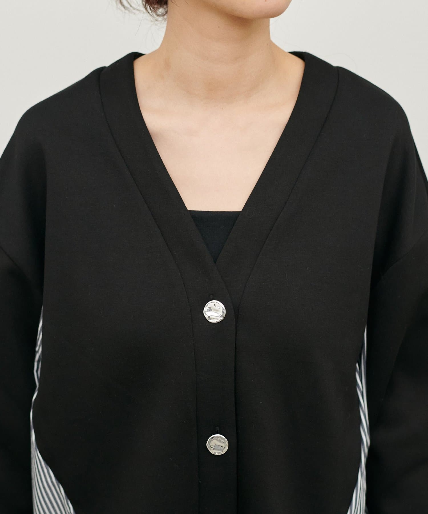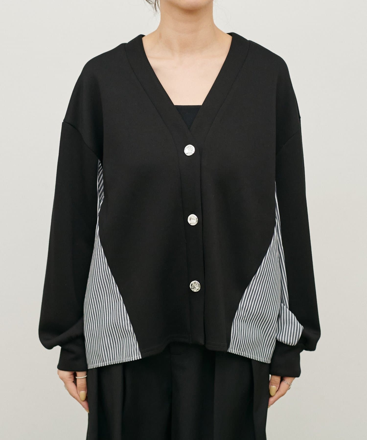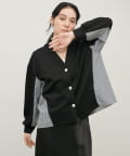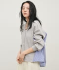 ダンボール素材とボーダー柄の布帛を組み合わせた、異素材切り替えデザインのカーディガン。