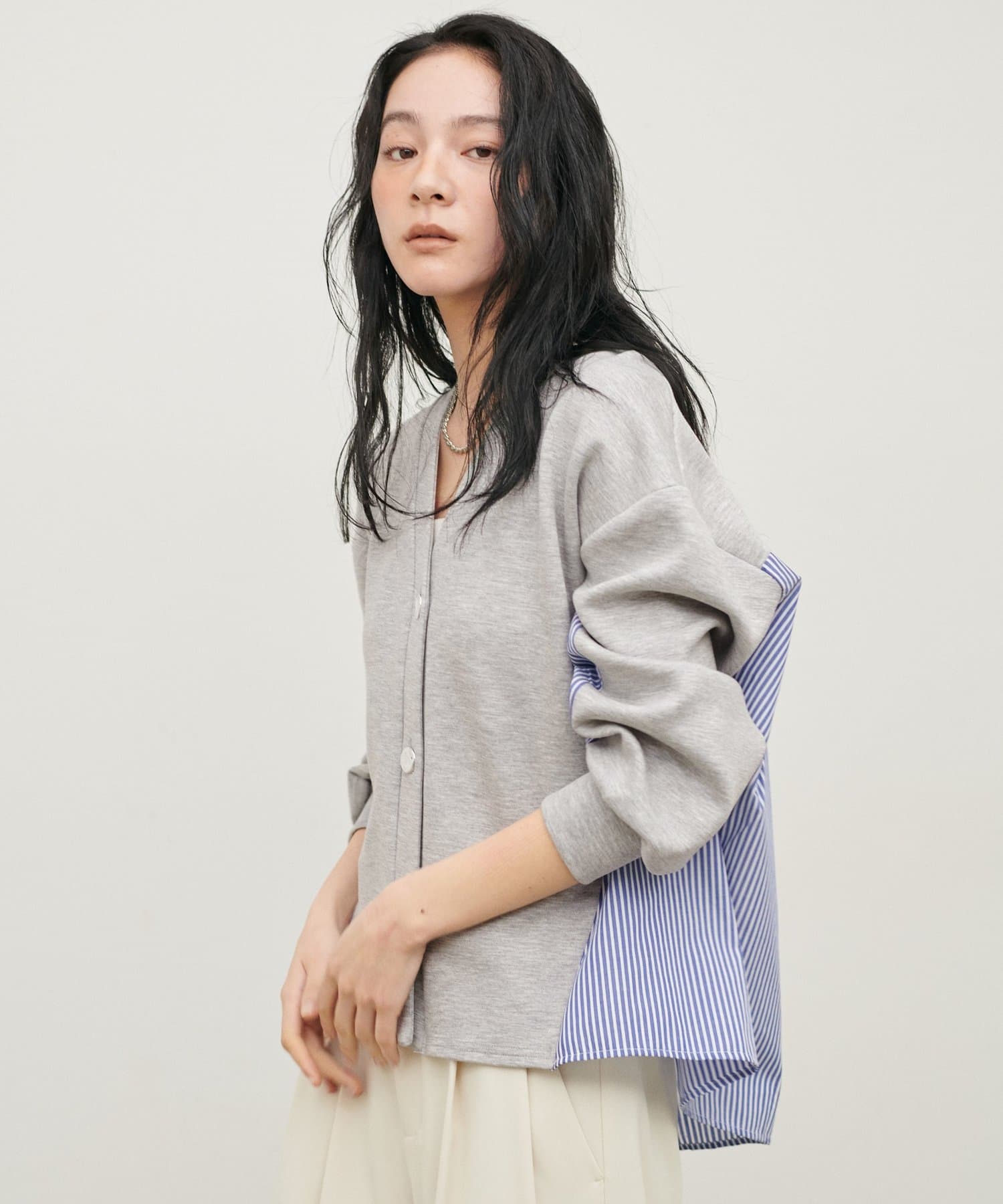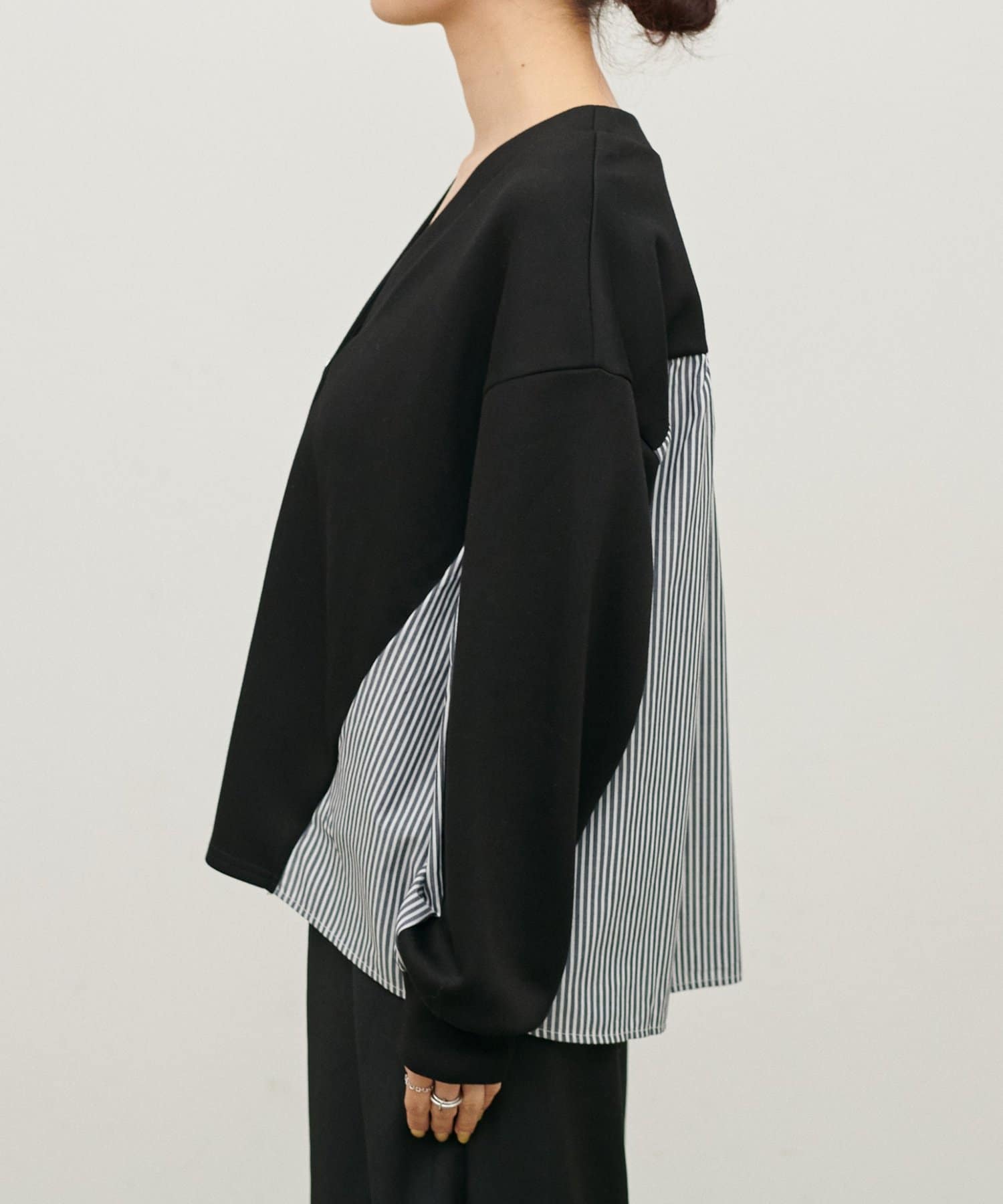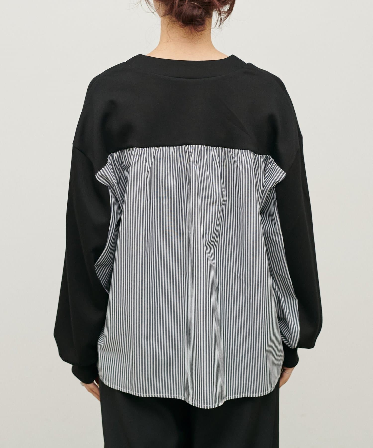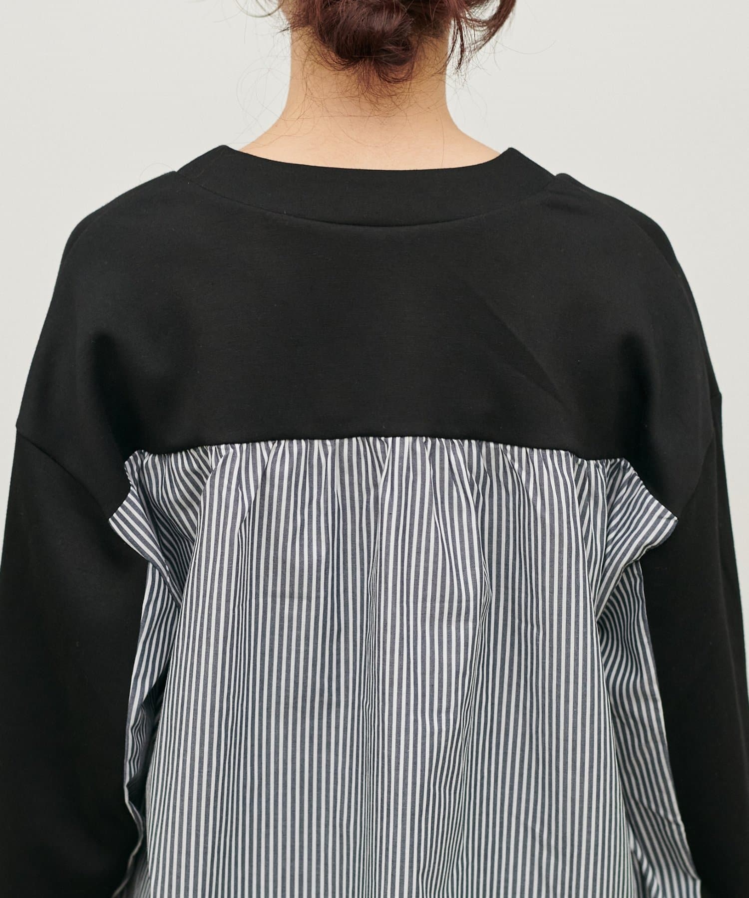布帛部分にはさらっとしたボーダー生地を使用し、異素材のコントラストを楽しめる仕上がりです。