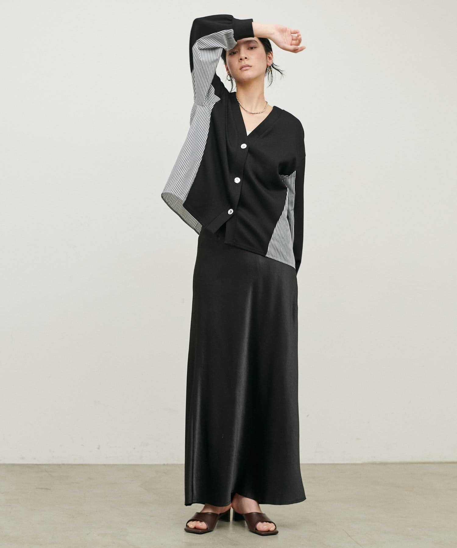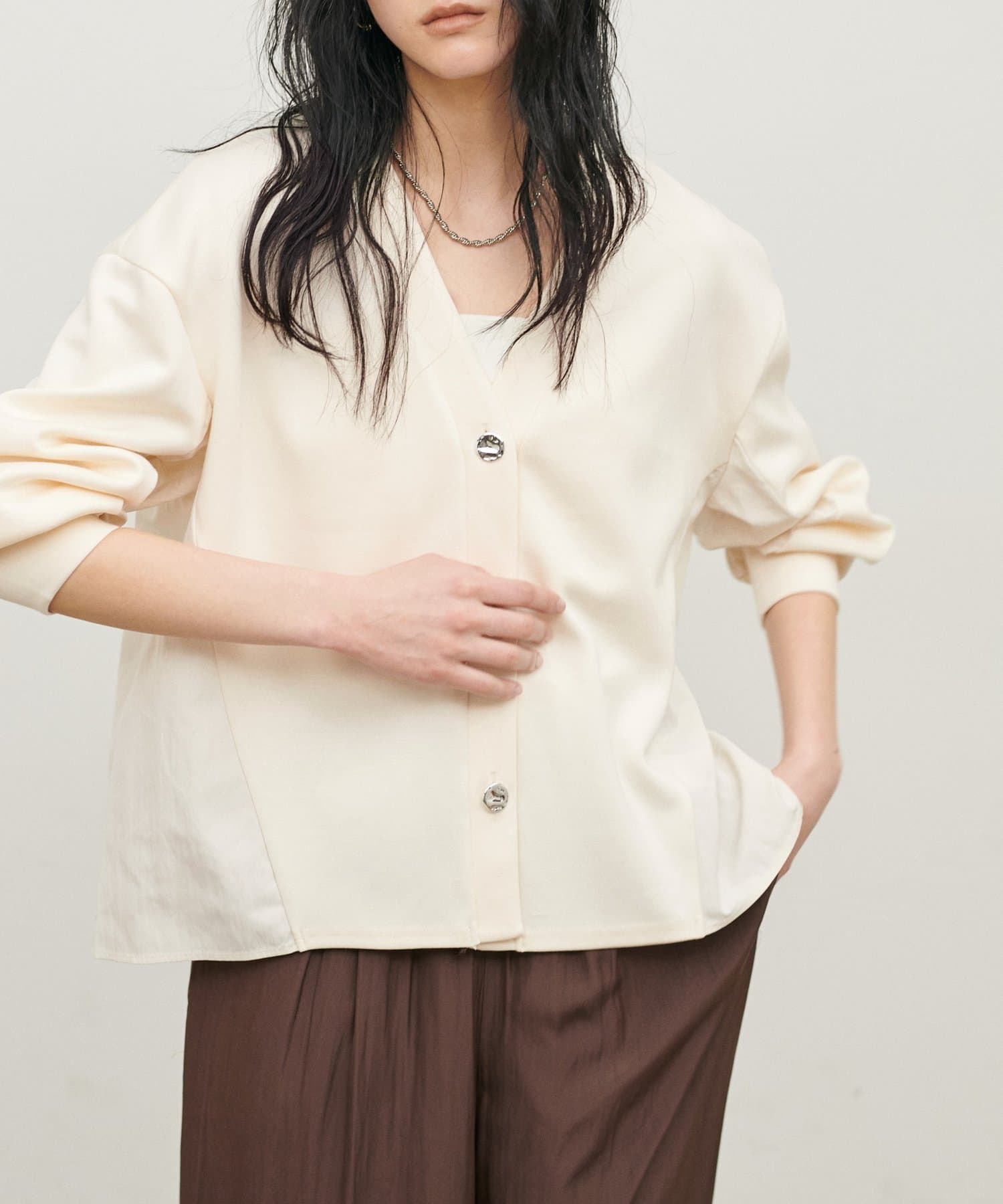 異なる素材のミックス感がアクセントとなり、シンプルながらも表情のある一枚に仕上げました。