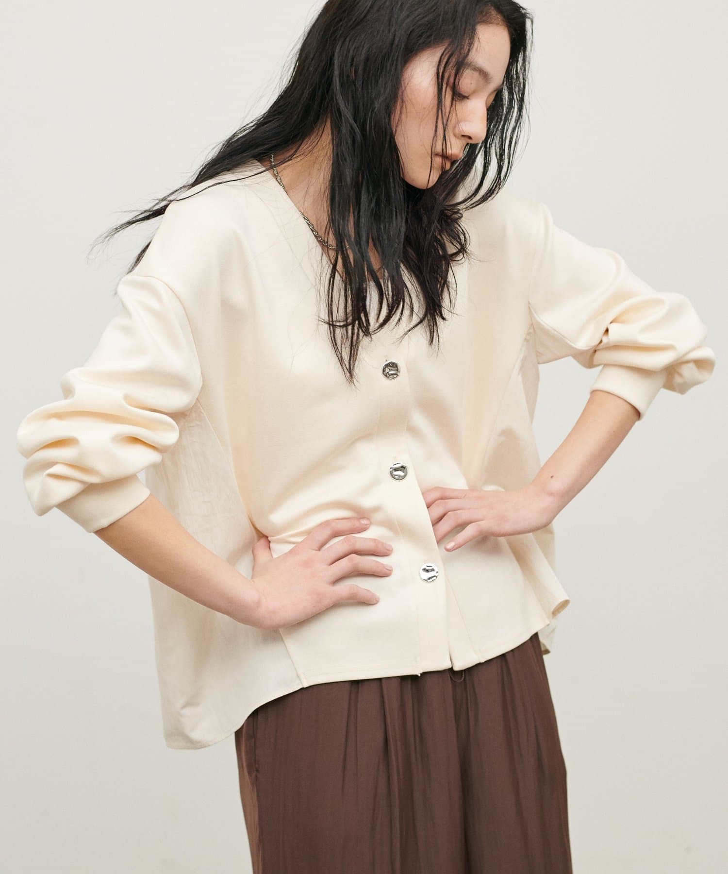 大きめのボタンがポイントになり、カジュアルな中にもさりげない存在感をプラス。