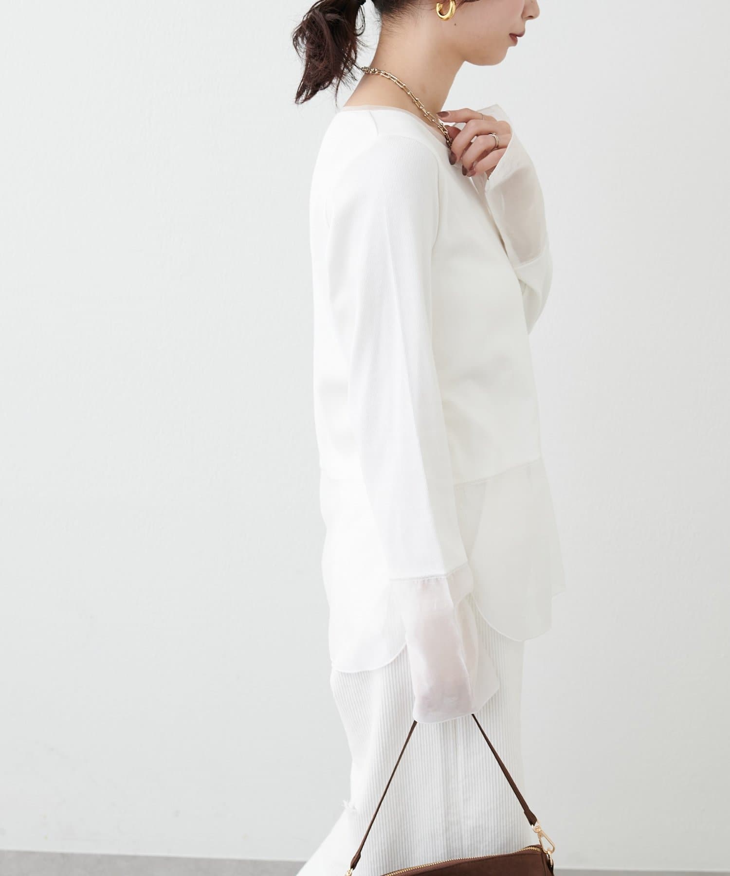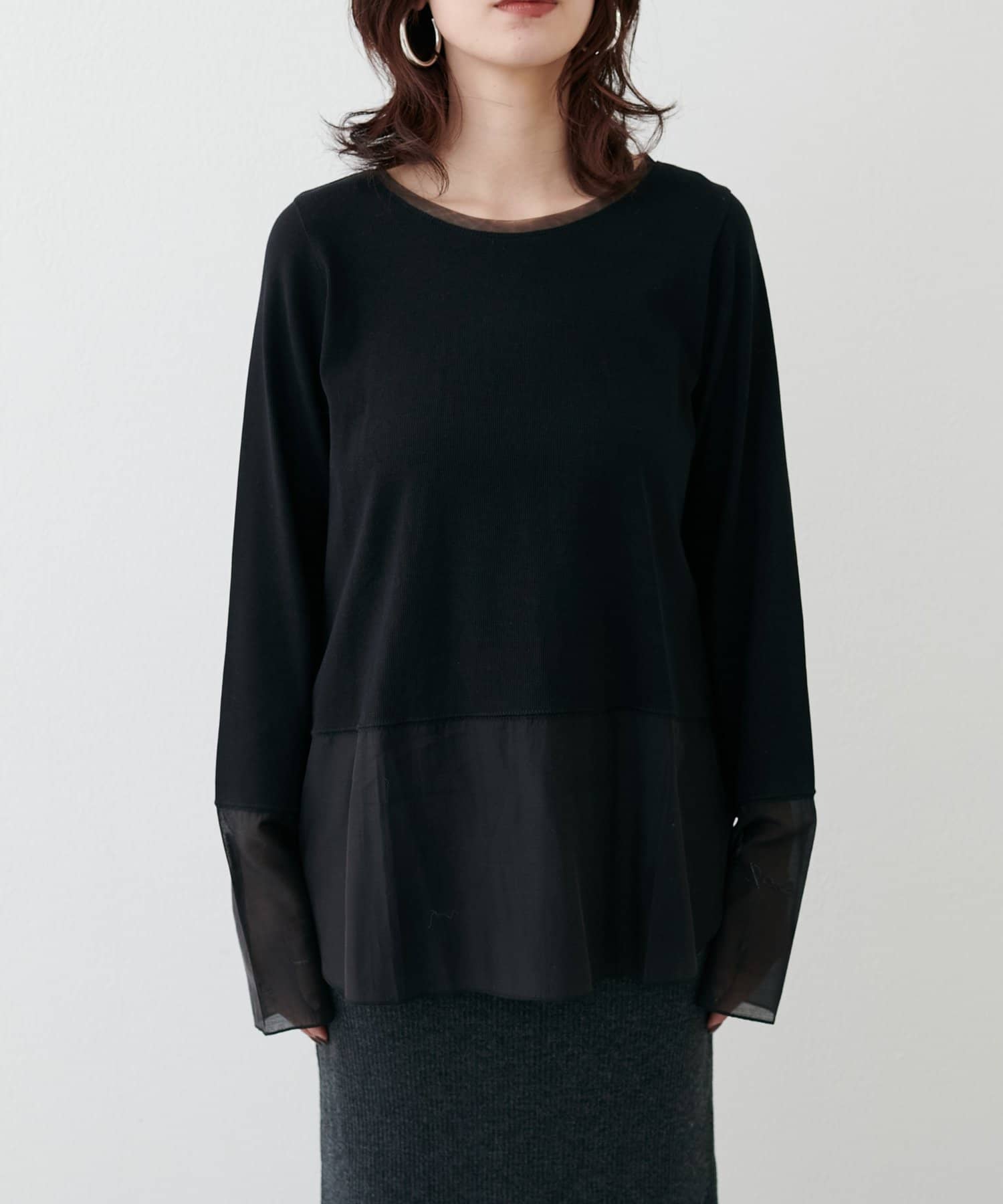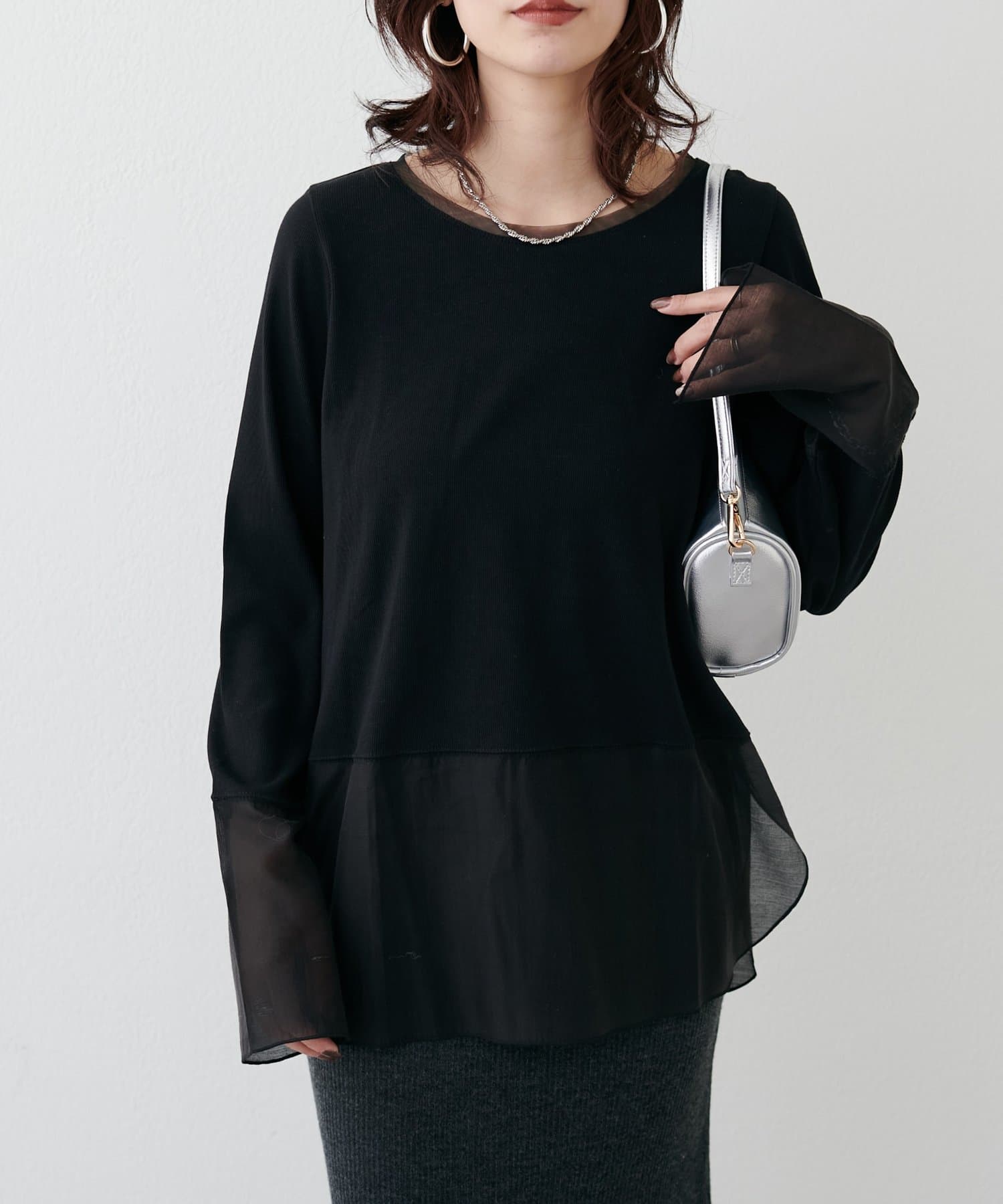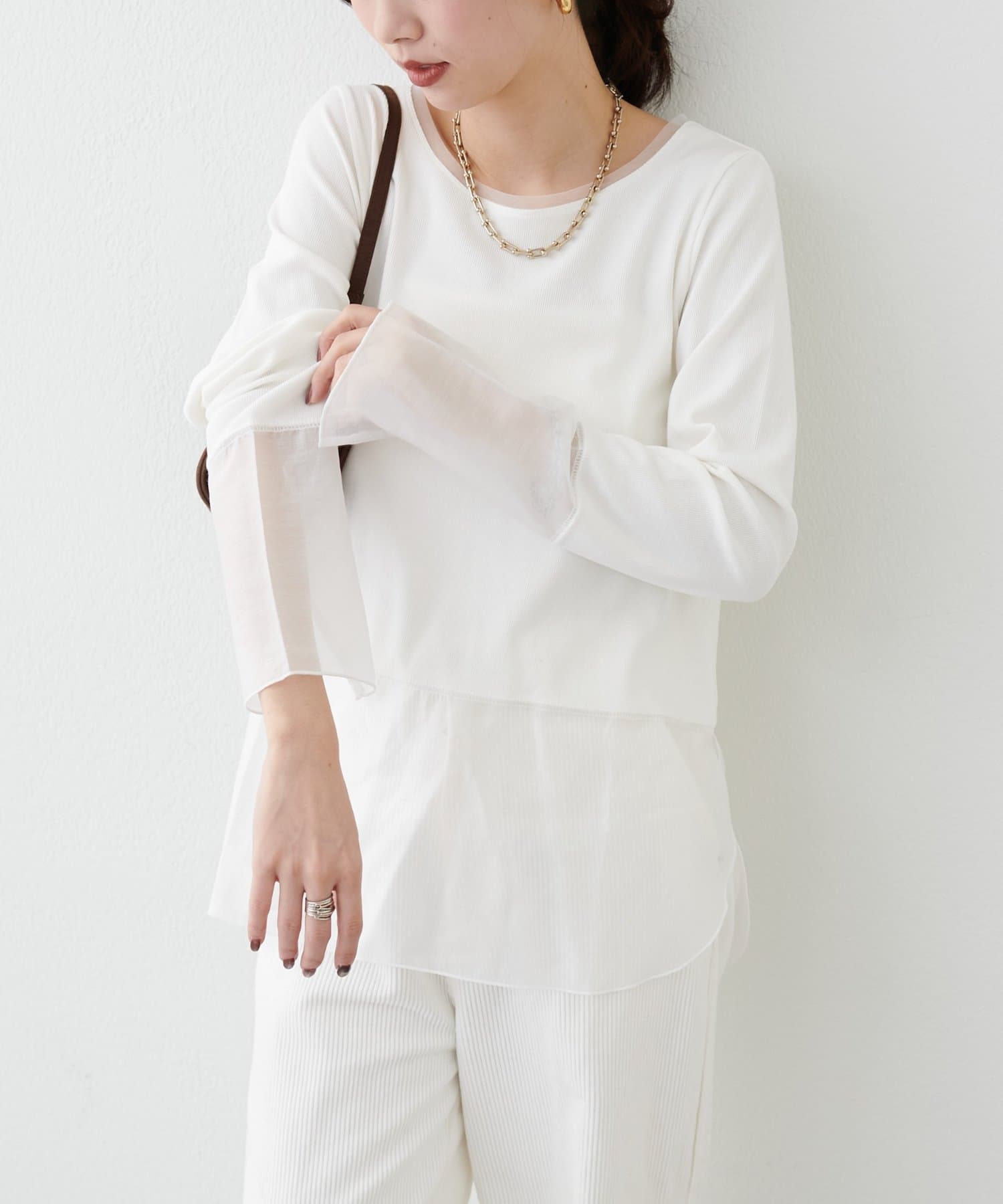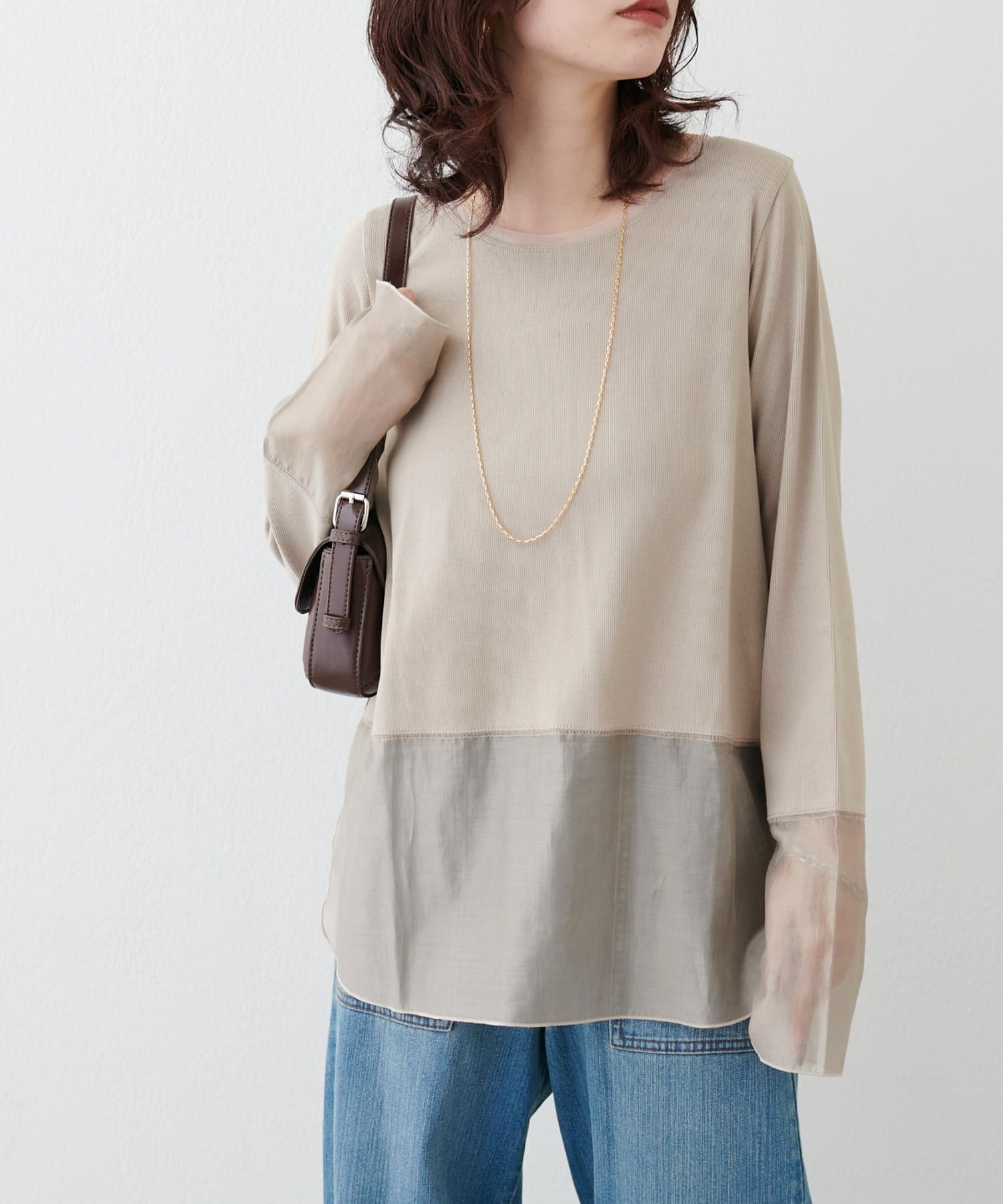 トレンドライクなシアーチュールをドッキングさせてロングスリーブTシャツ。