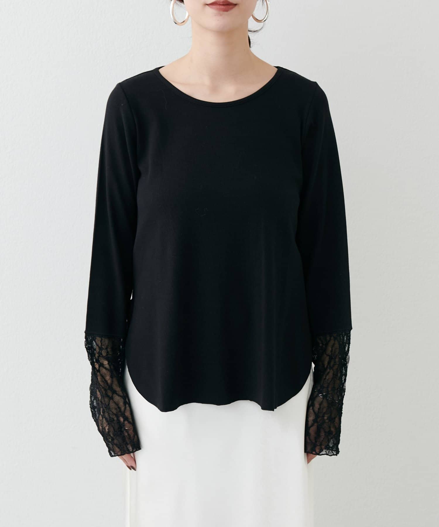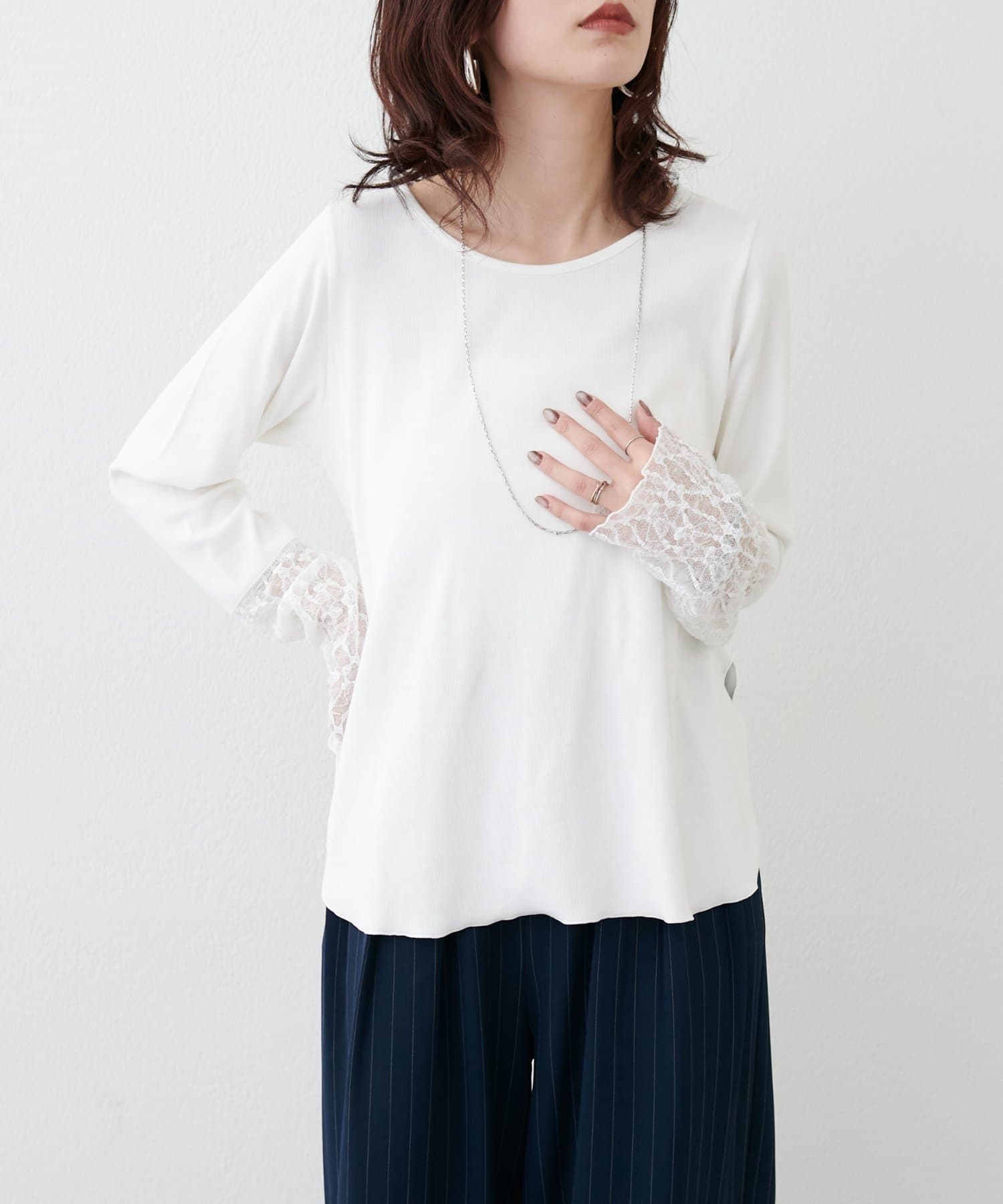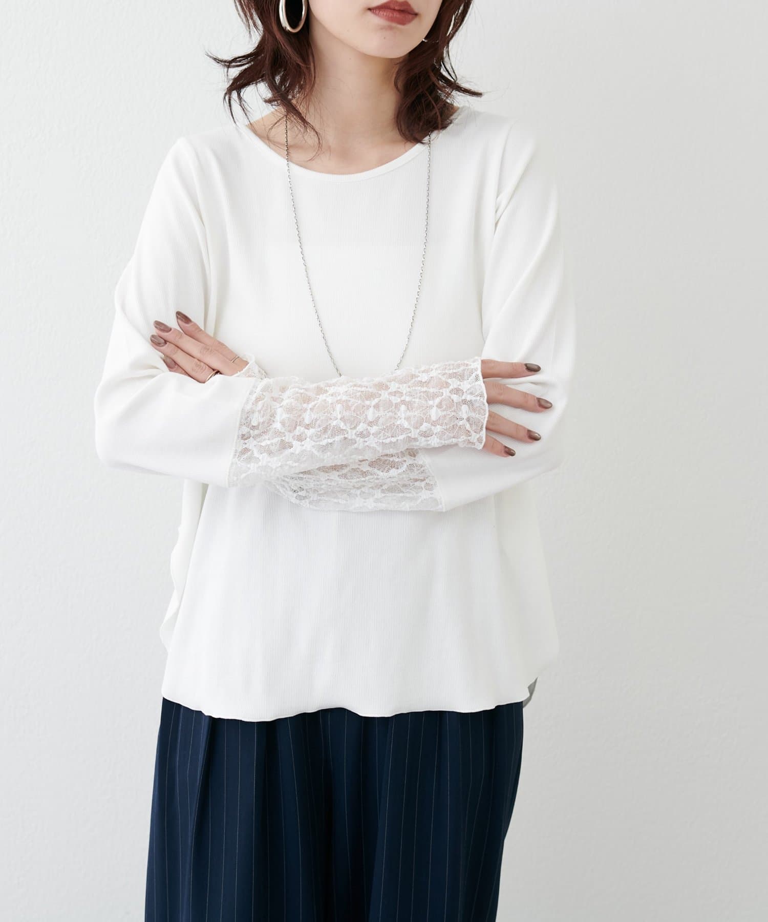 シンプルさの中に、袖の切り替えレースで華やかさをプラスしたカットソー。